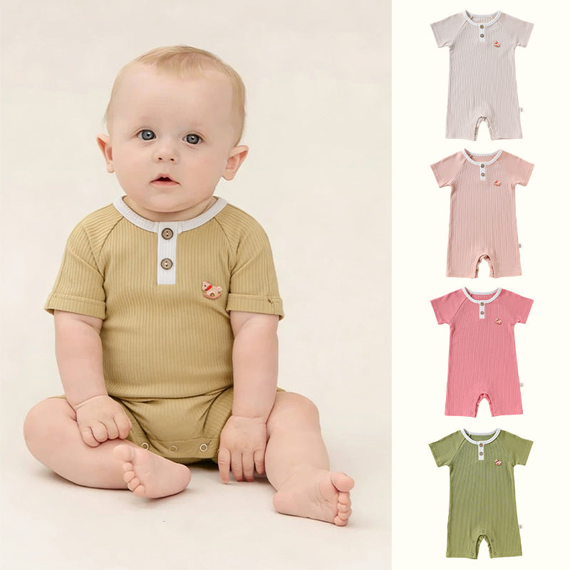 Henley Neckline Short Sleeve Modal Romper ワンポイント 刺繍 半袖ロンパース【mh0012781】