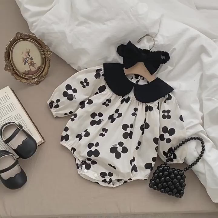 ベビー モノトーン レトロフラワー 長袖 ロンパース ヘアバンド セット