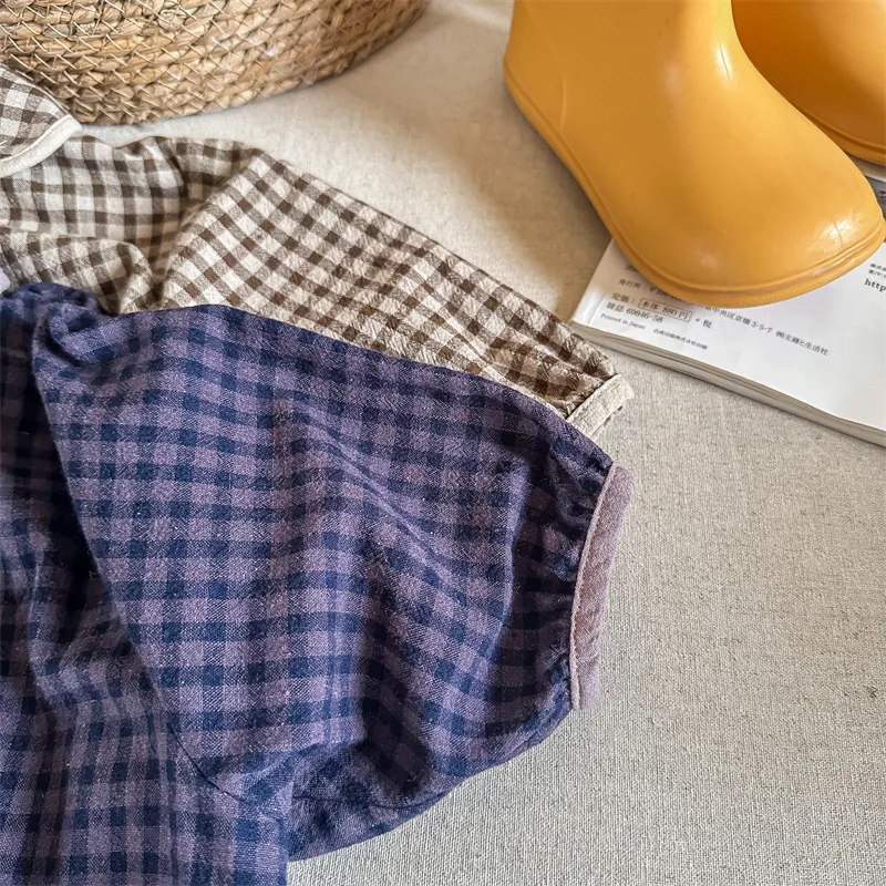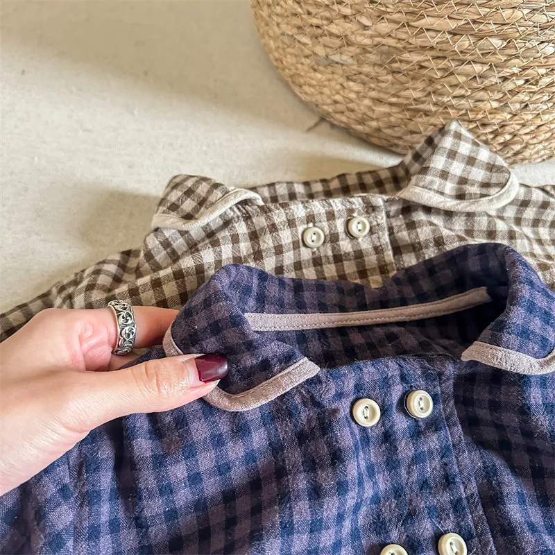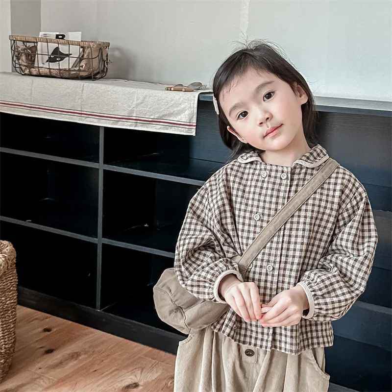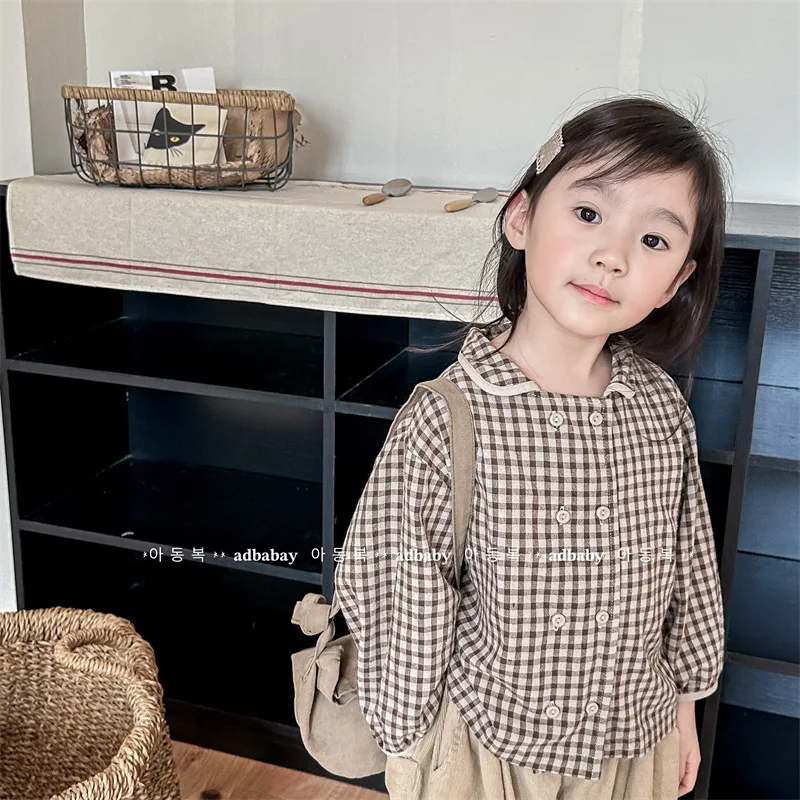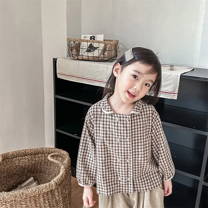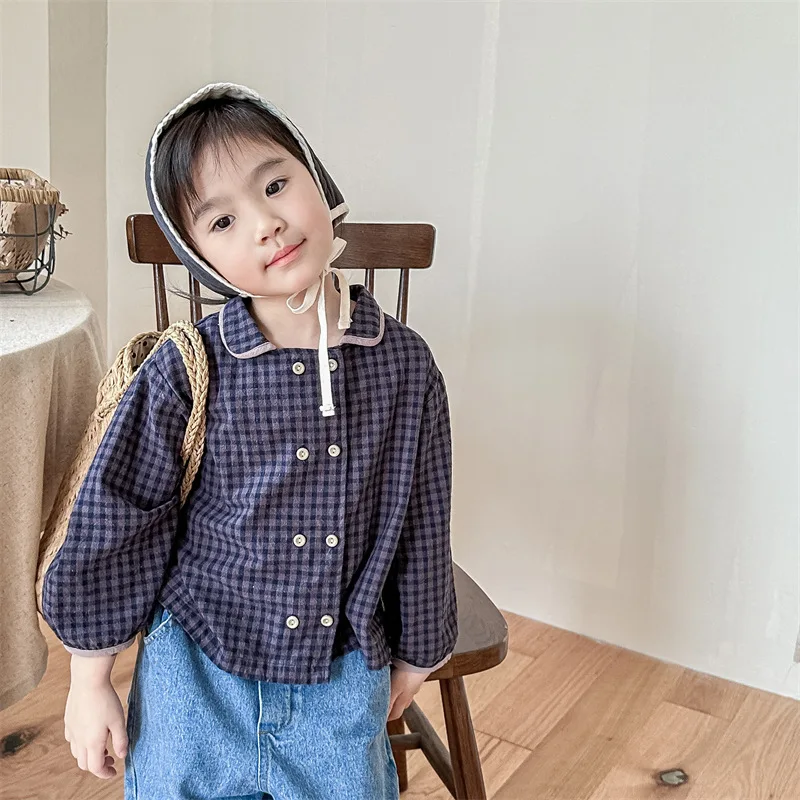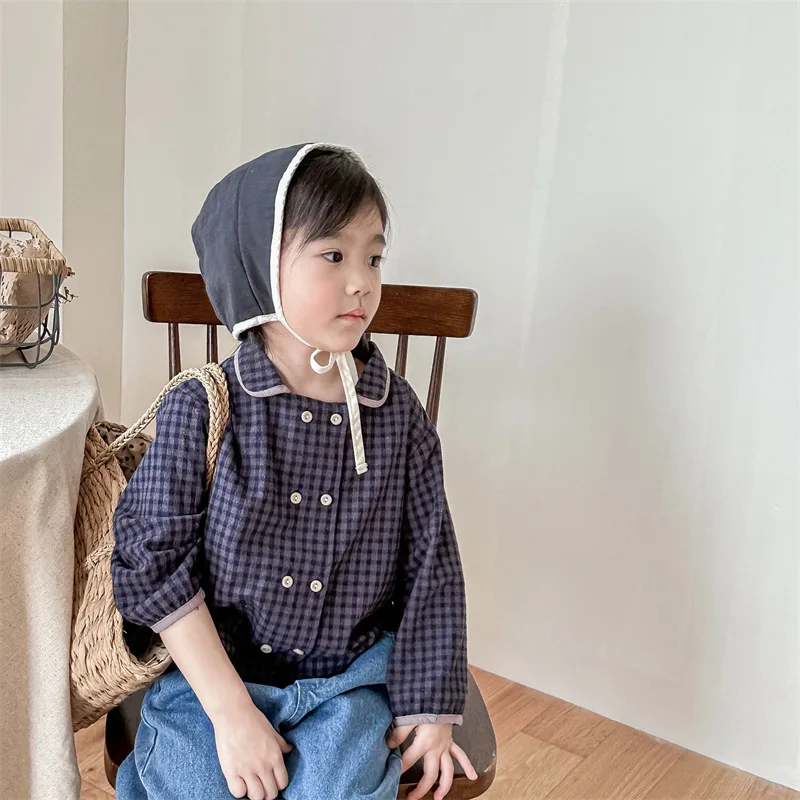 キッズ チェック ダブルボタン 長袖 ルーズ シャツ ブラウス