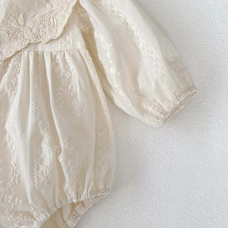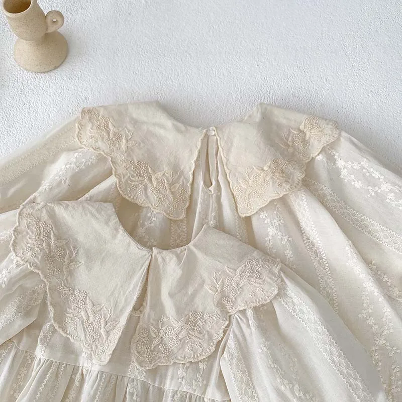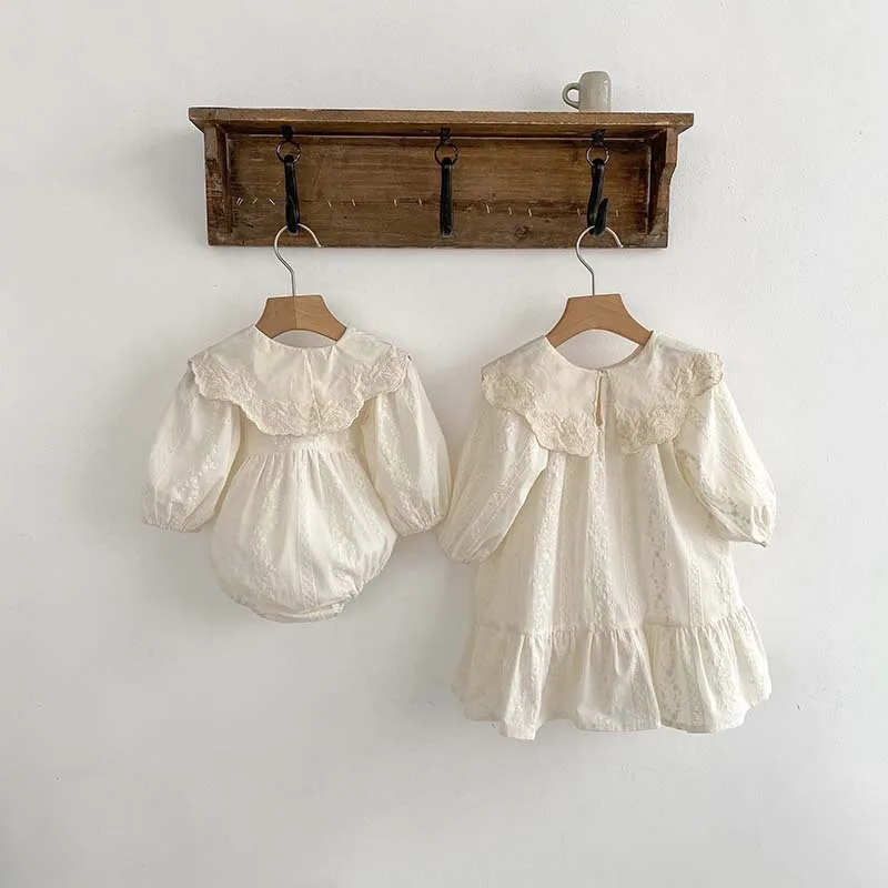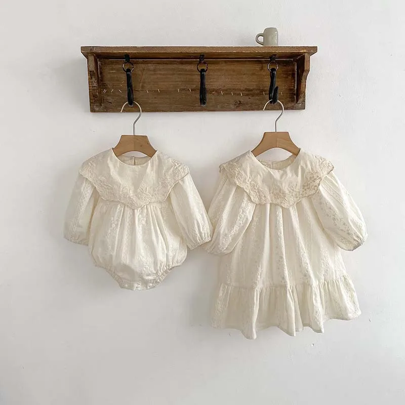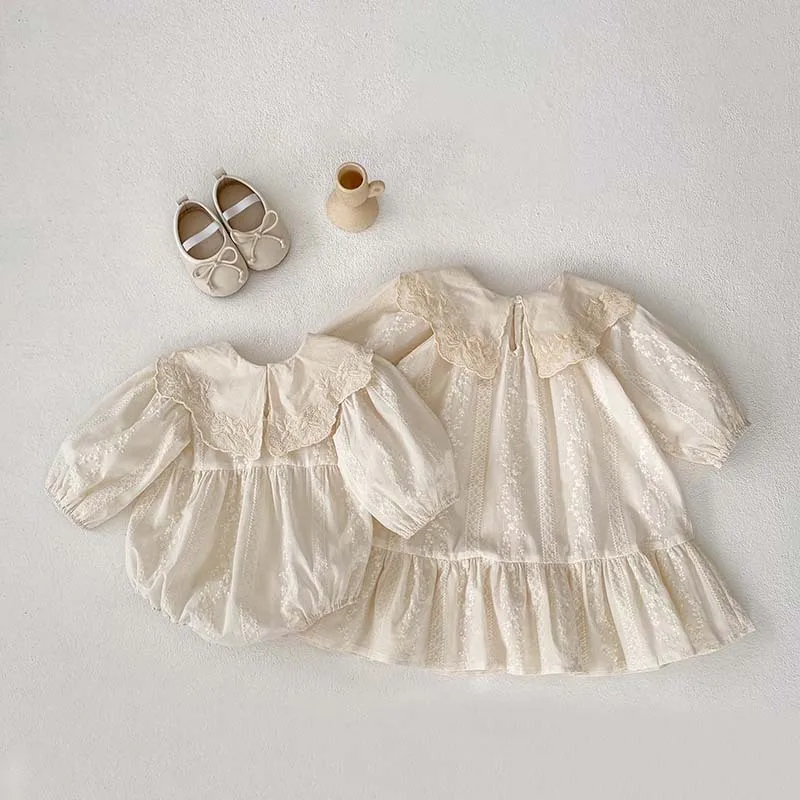 ベビーロンパース キッズワンピース 刺繍レース 長袖ドレス リンクコーデ 姉妹お揃い お出かけ ベージュ【mh0003922】