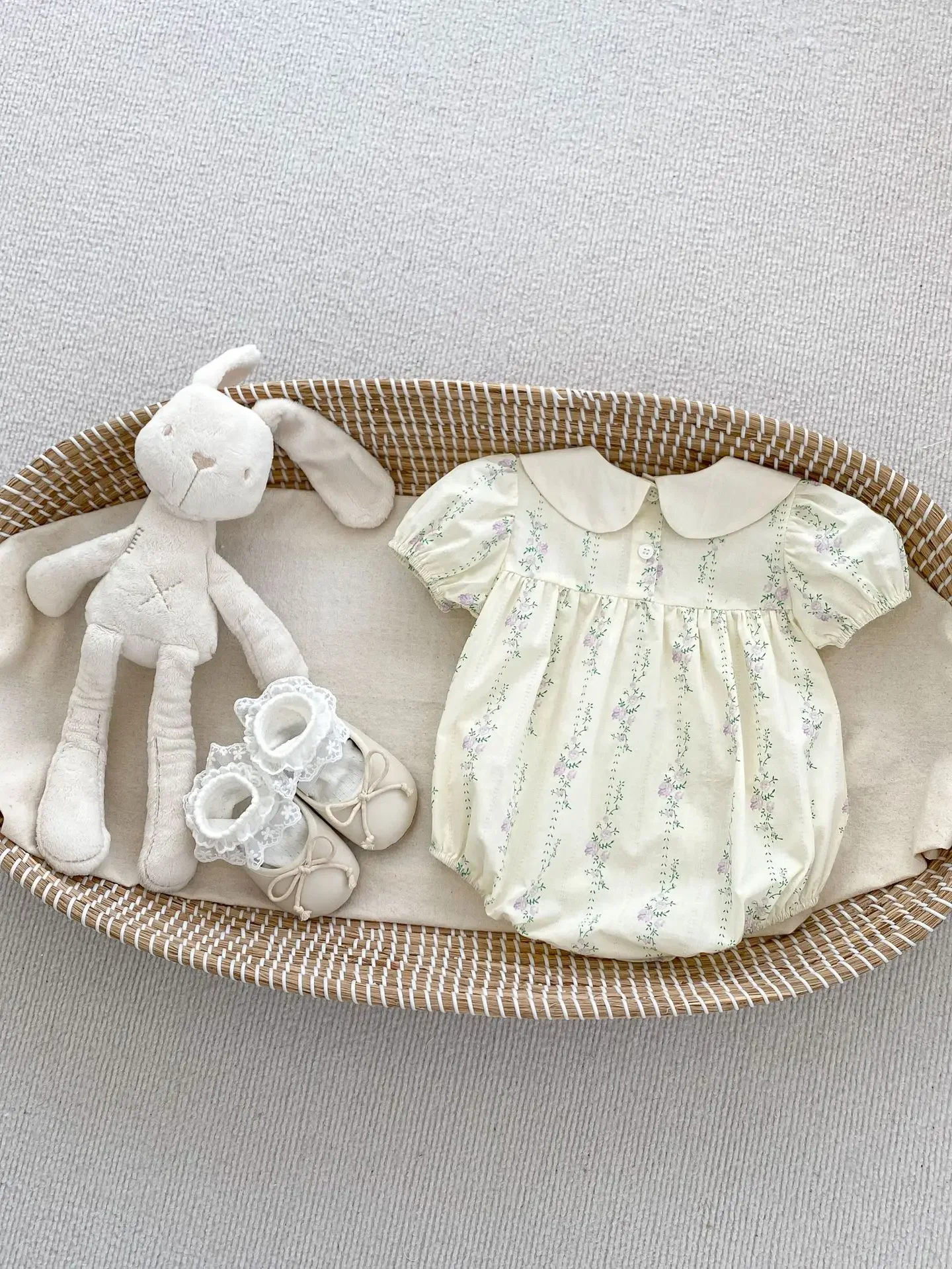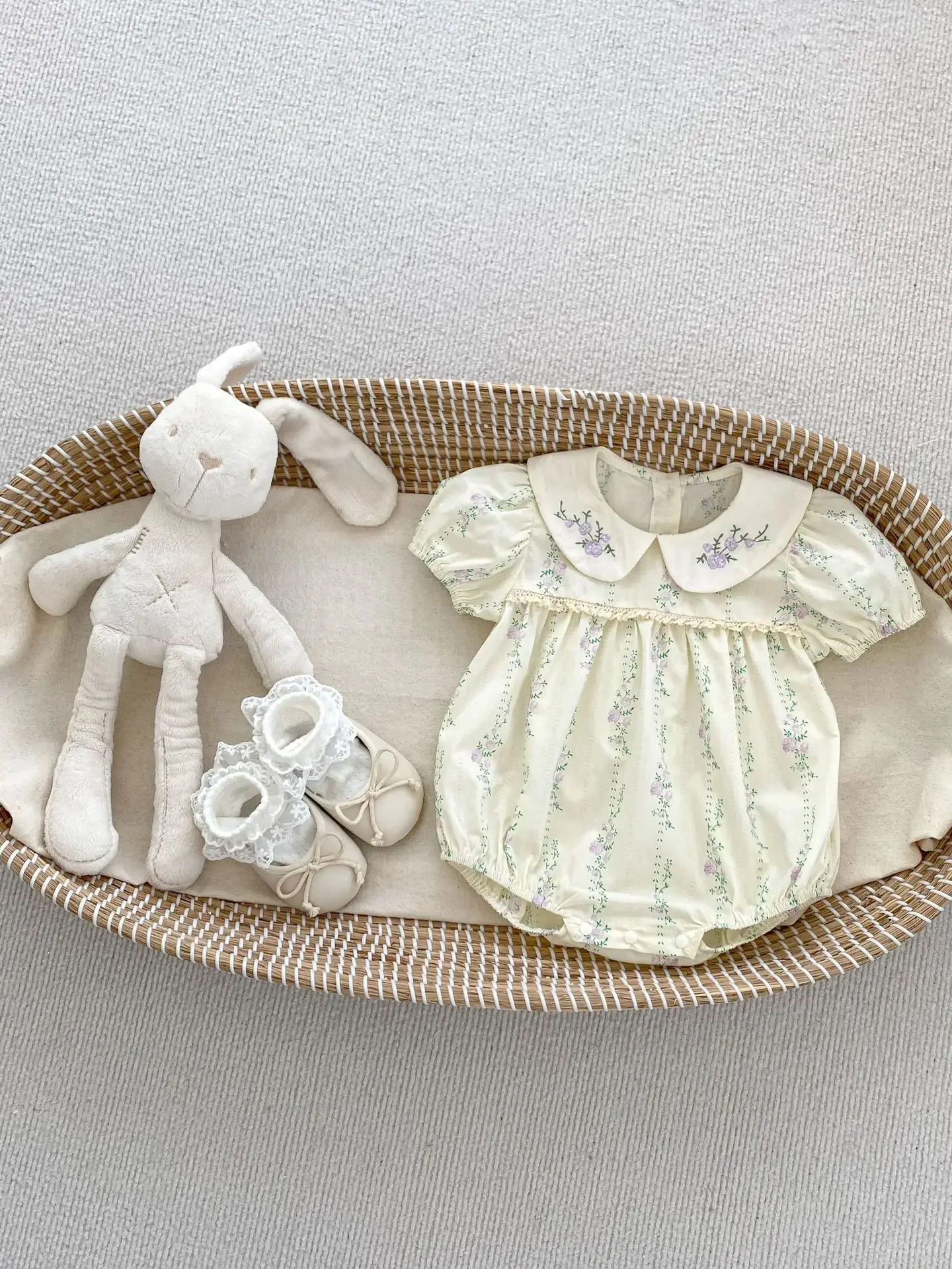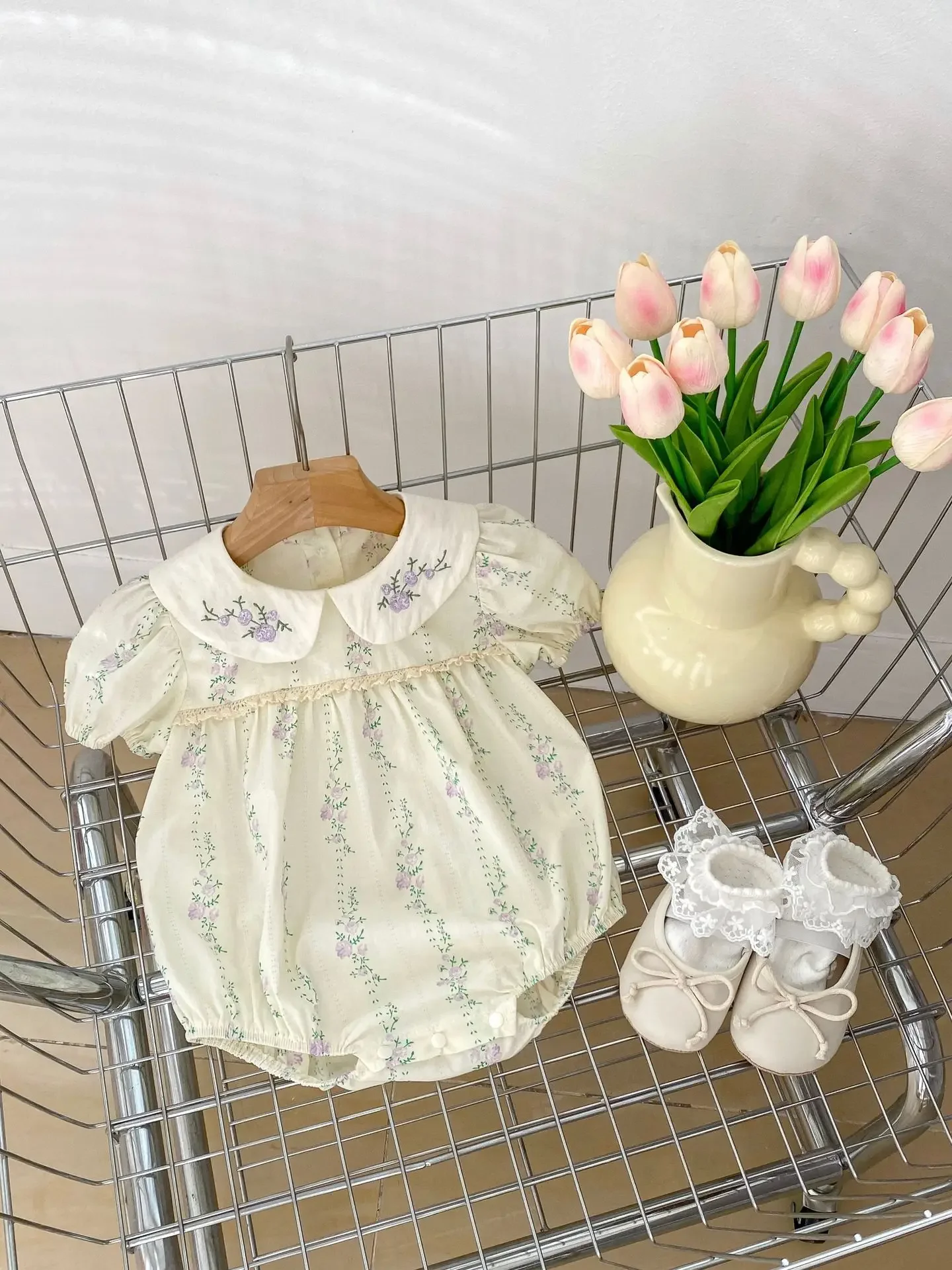 ベビーロンパース 半袖ボディースーツ 丸襟 フラワー花柄プリント【mh0005694】