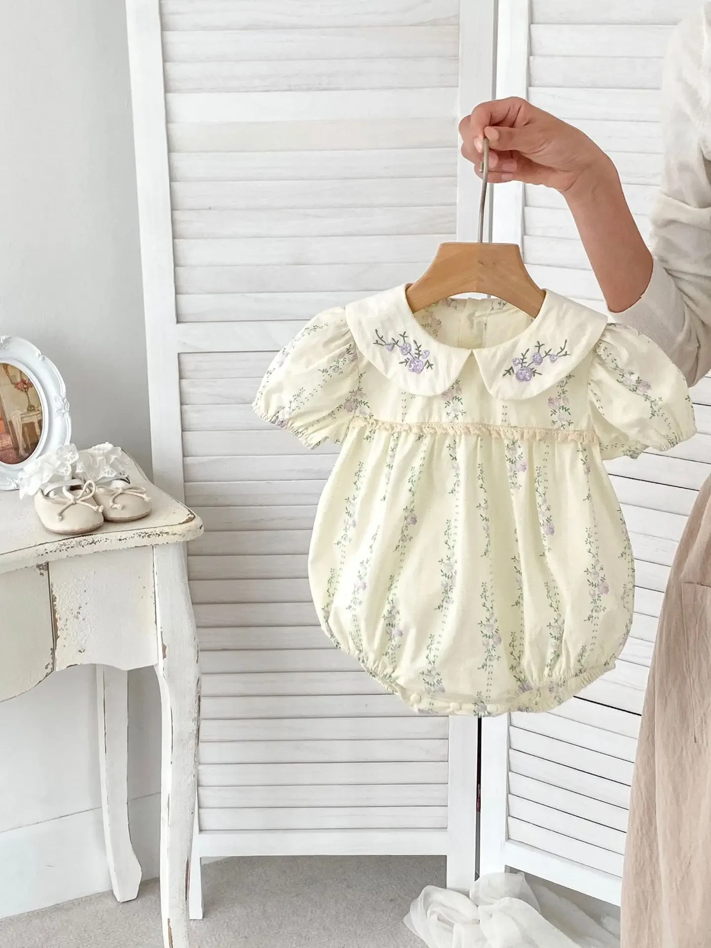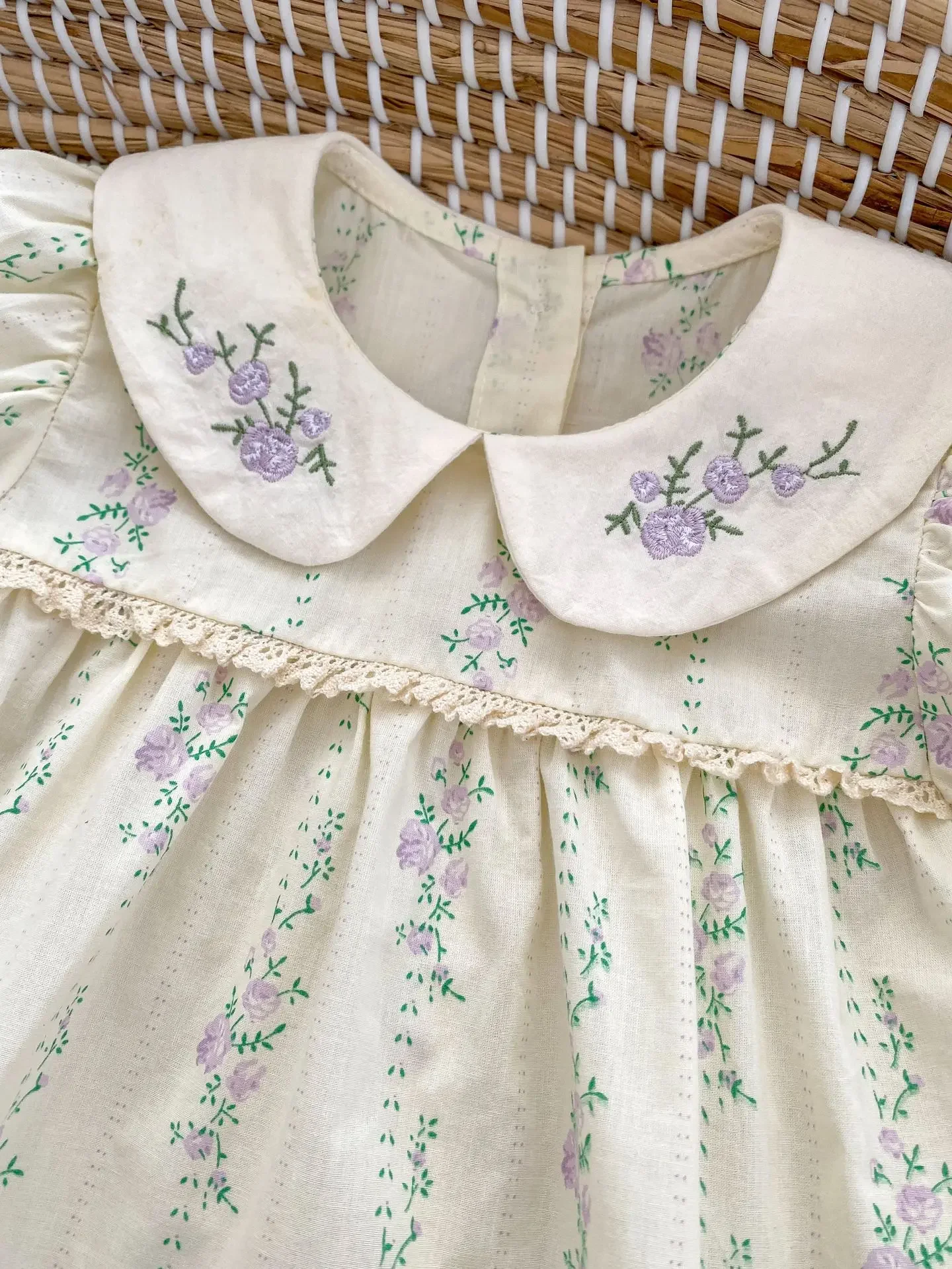 可愛らしい紫色の花柄プリントが印象的なベビーロンパースです。丸襟のデザインと女性らしい刺繍のついたつなぎ型で、夏にぴったりのお洋服です。赤ちゃんの動きを自由にさせる半袖仕様で、女の子らしさと快適さを両立できます。