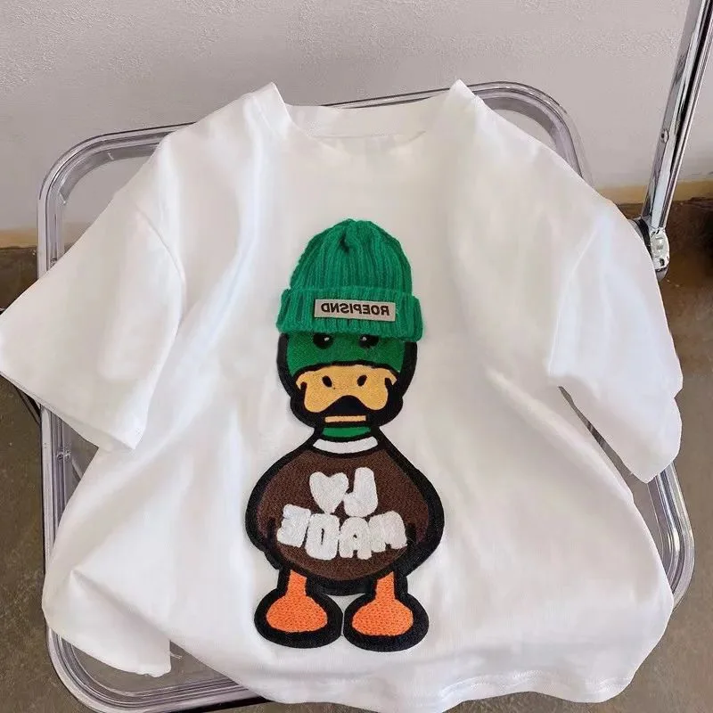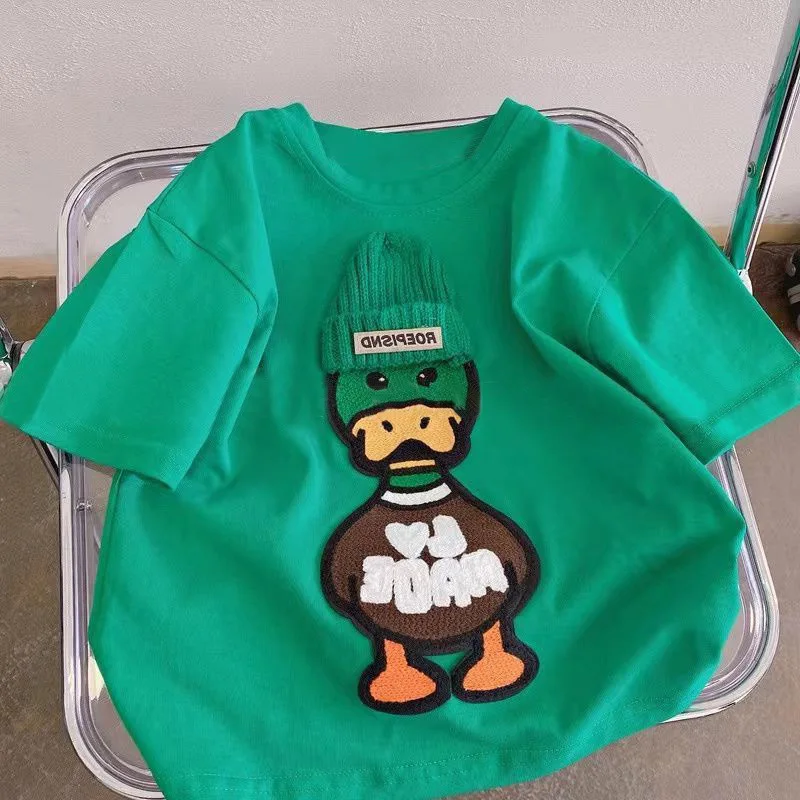 子どもたちのお気に入りのキャラクター、あひるのアップリケが可愛い半袖Tシャツです。男の子、女の子どちらにもおすすめの夏用のトップスです。2~6歳の子供たちにぴったりのサイズ感とクールなスタイルで、夏のお出かけにぴったりです。