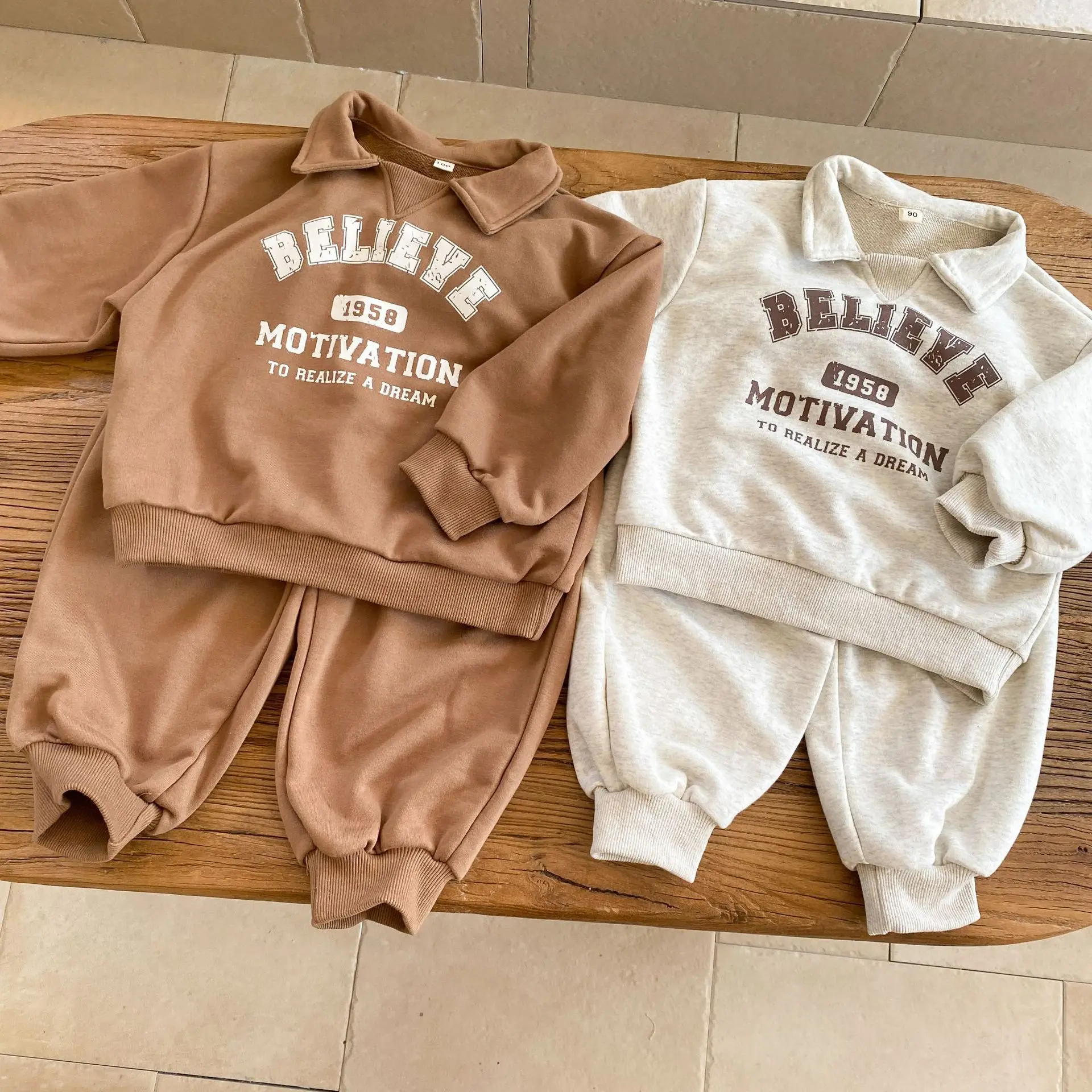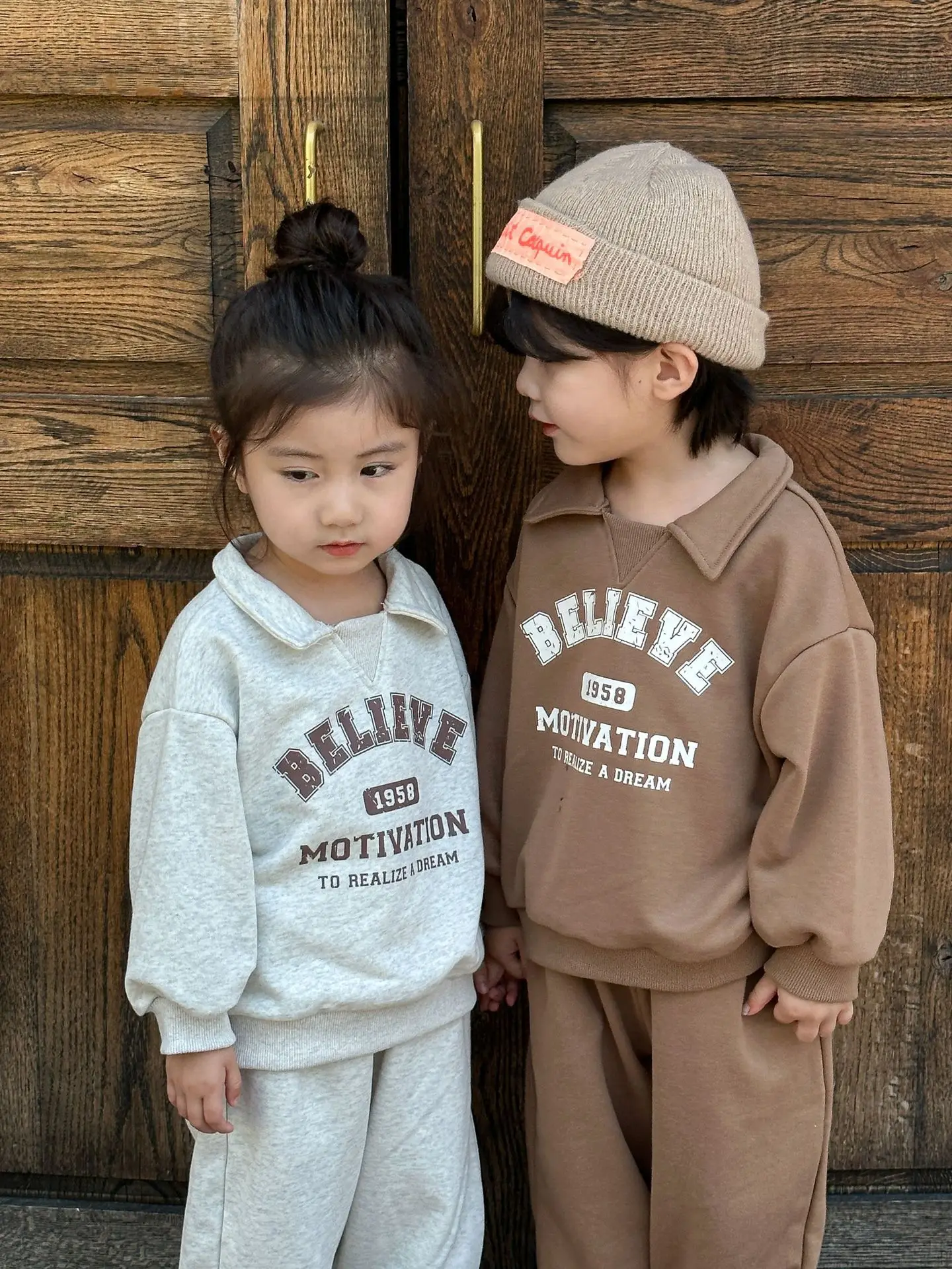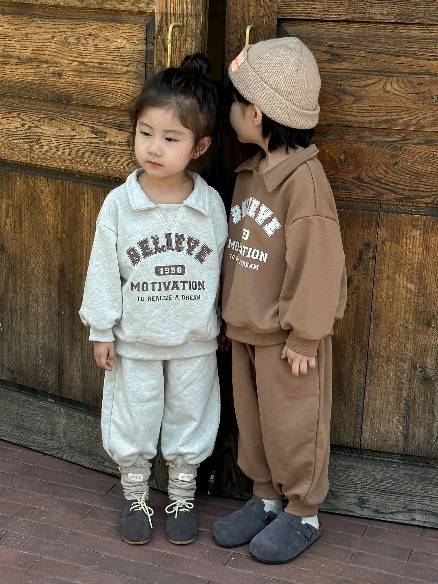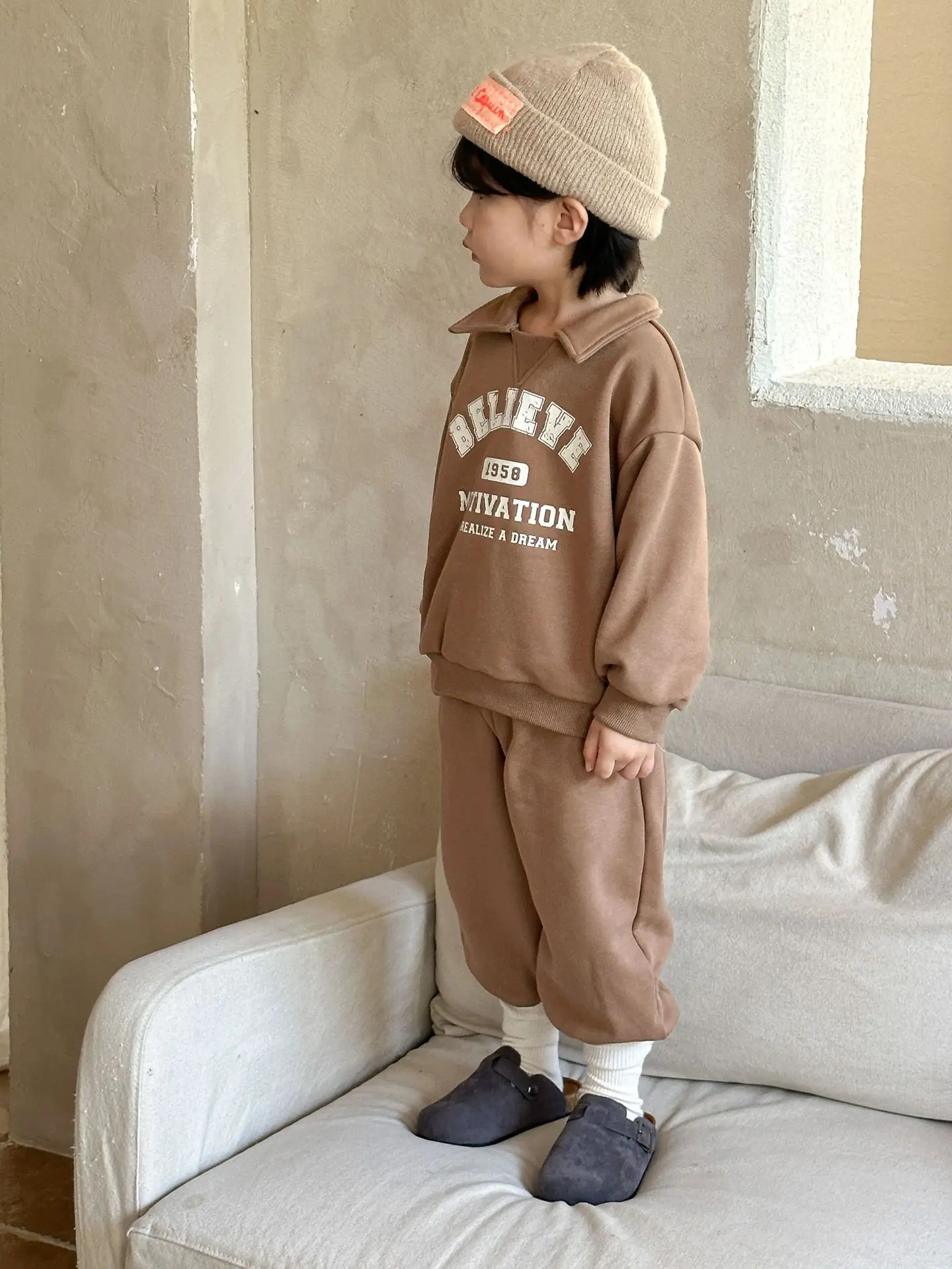 キッズセットアップ 2点セット 長袖襟付きスウェットシャツ+ロングパンツ レターロゴプリント 2カラー【mh0006563】