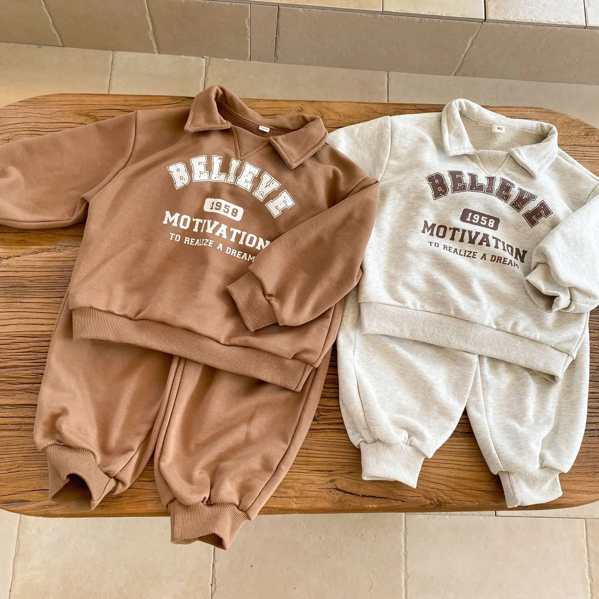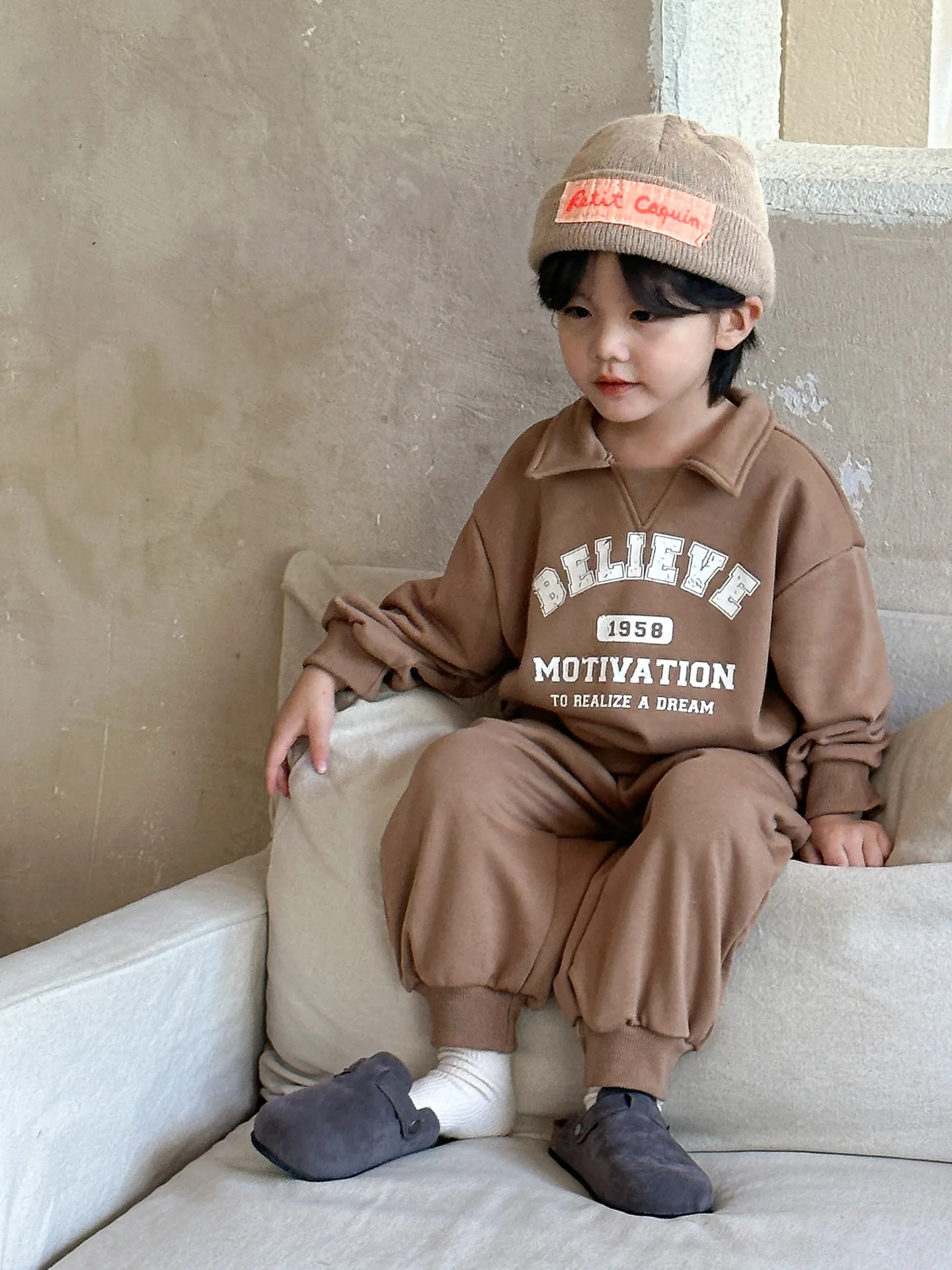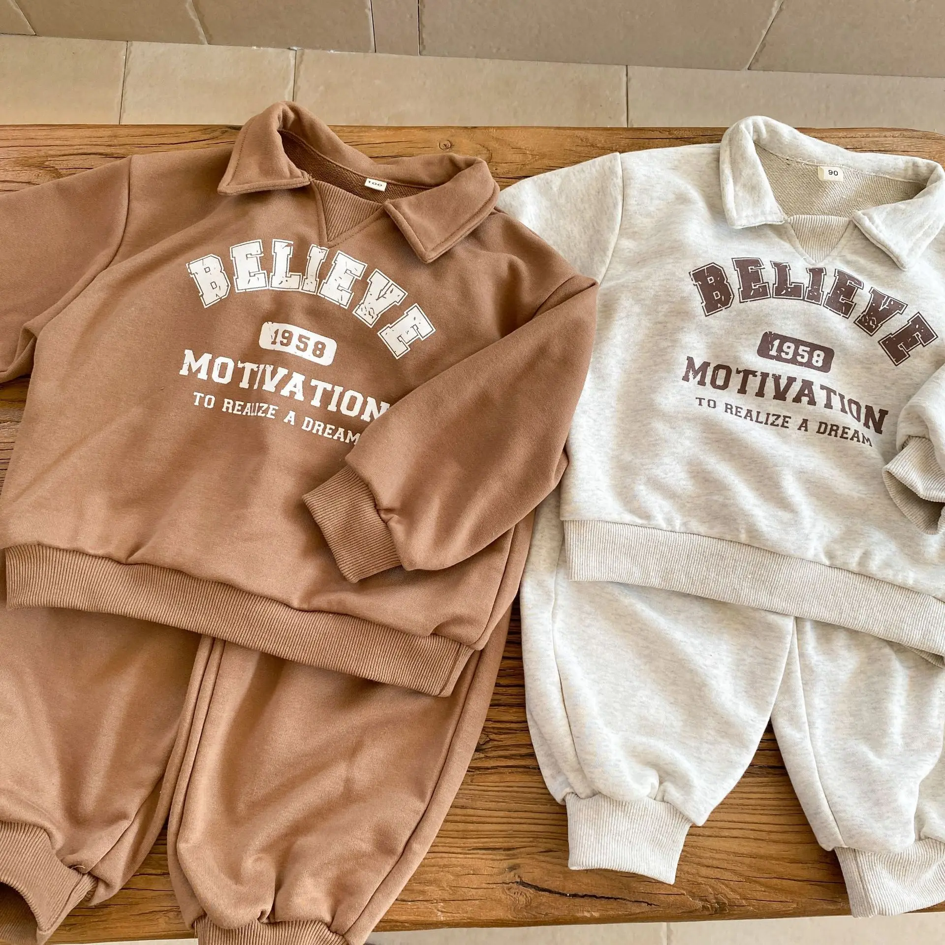 キッズセットアップ 2点セット 長袖襟付きスウェットシャツ+ロングパンツ レターロゴプリント 2カラー【mh0006563】