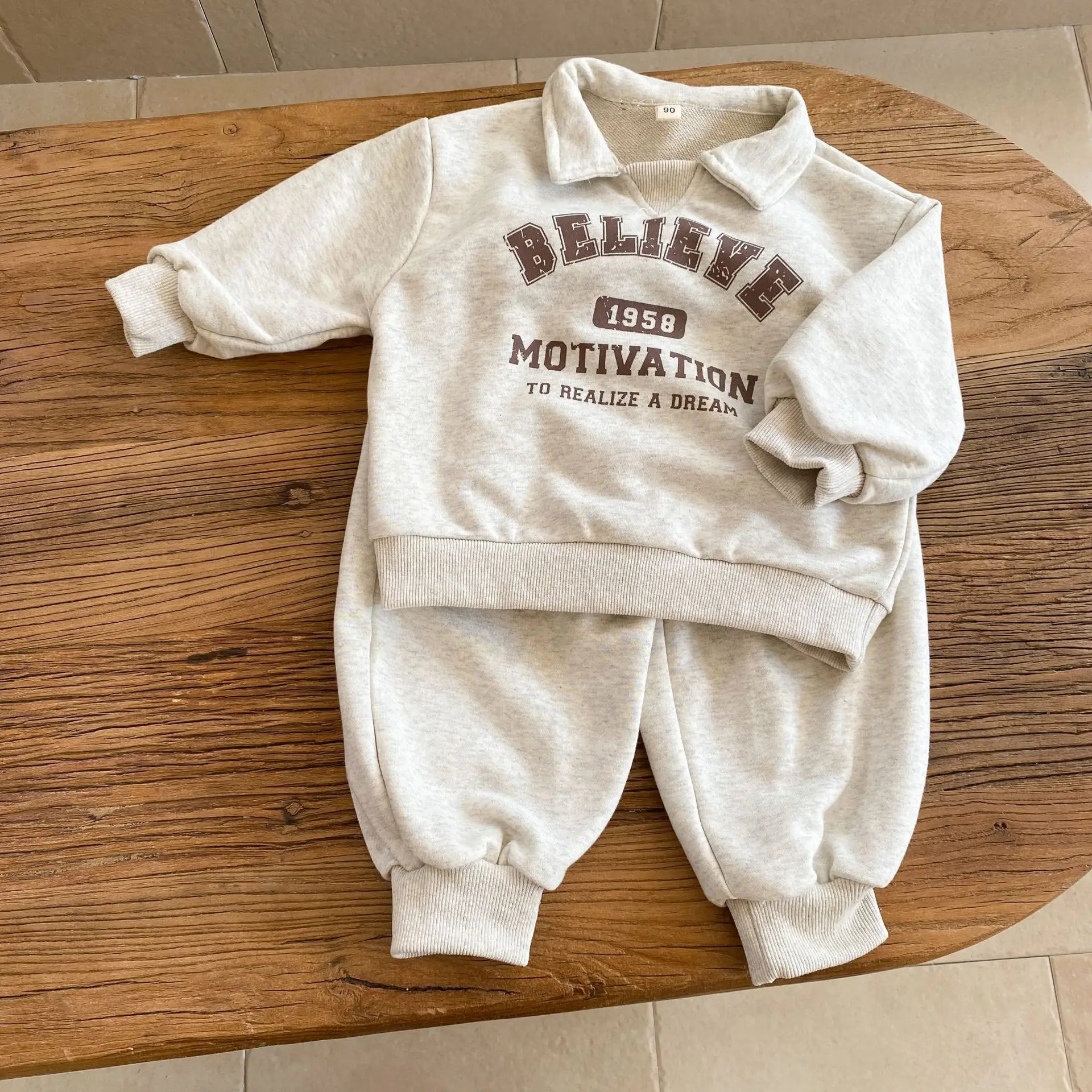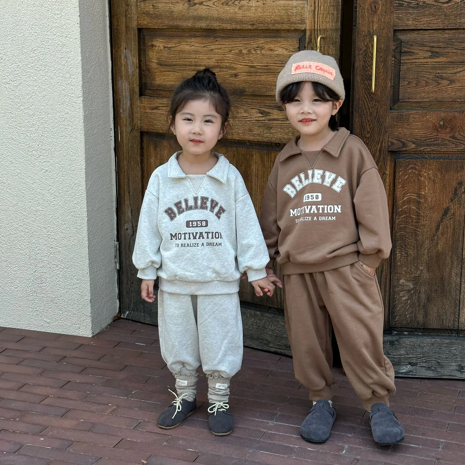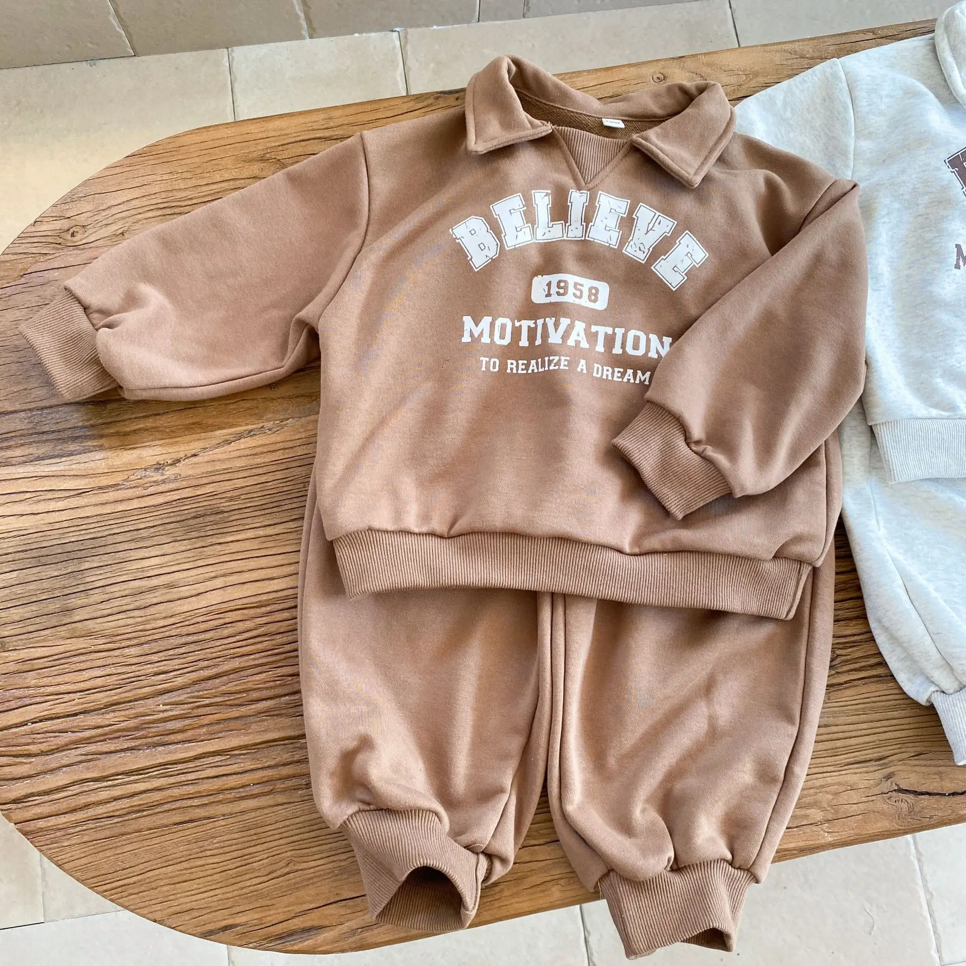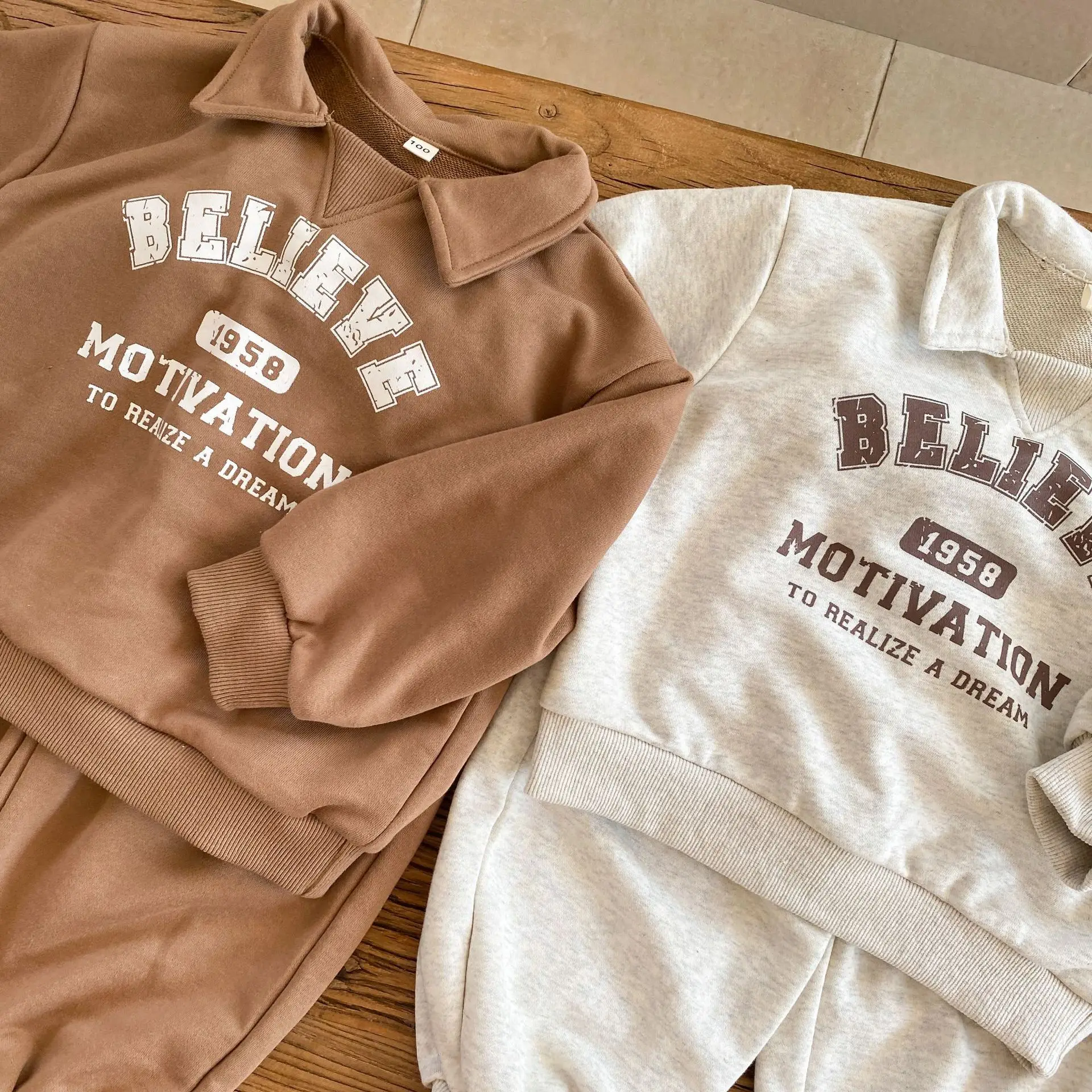 キッズセットアップ 2点セット 長袖襟付きスウェットシャツ+ロングパンツ レターロゴプリント 2カラー【mh0006563】