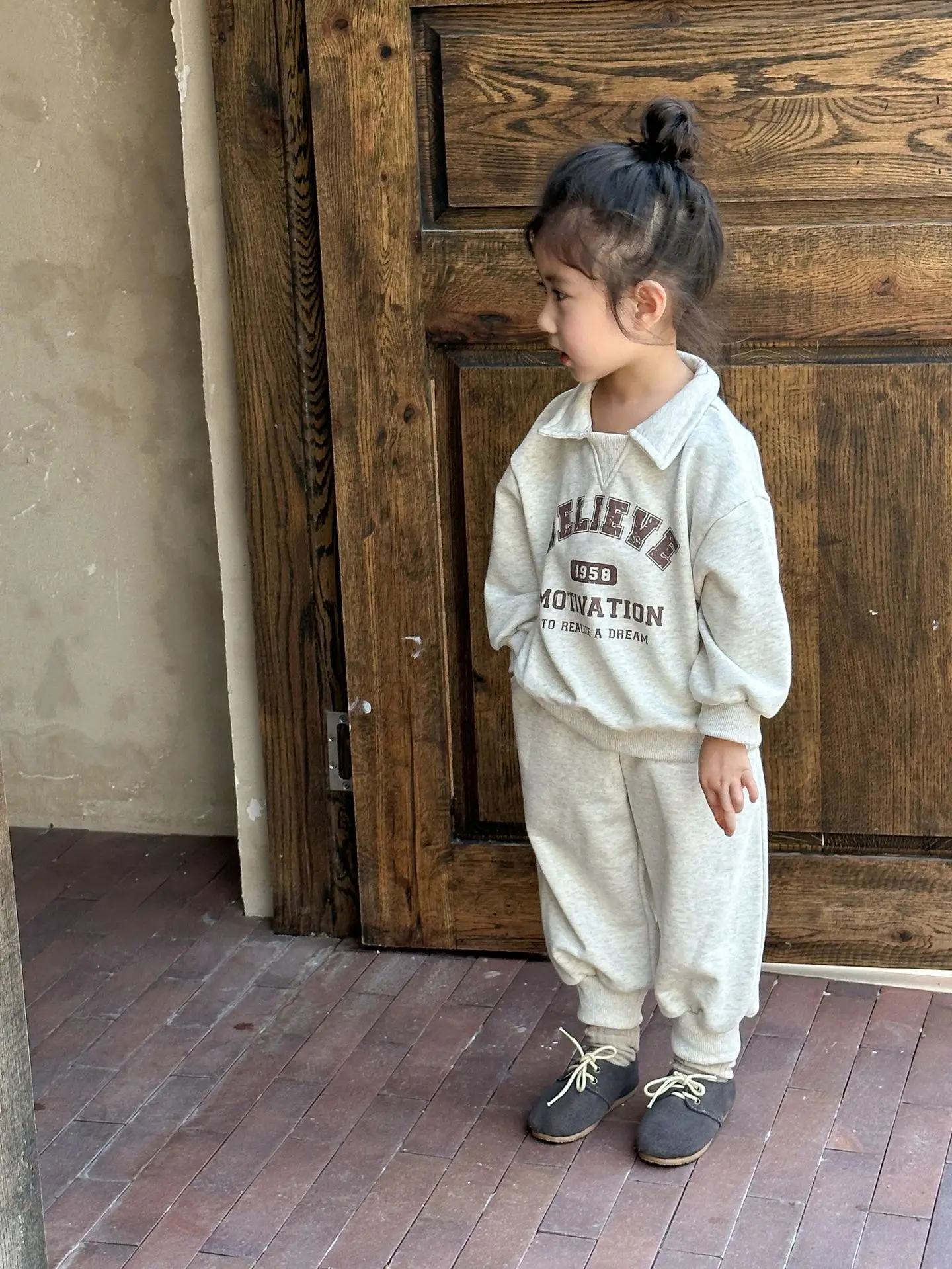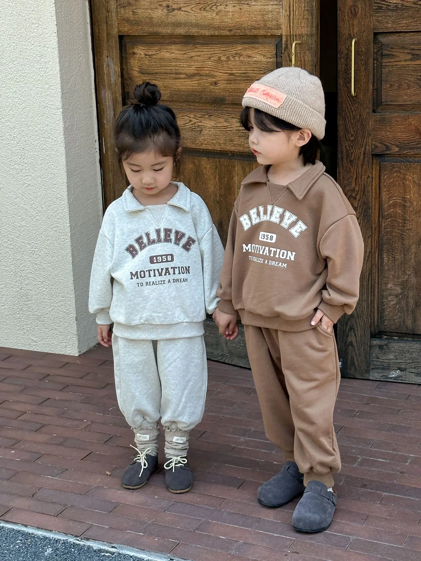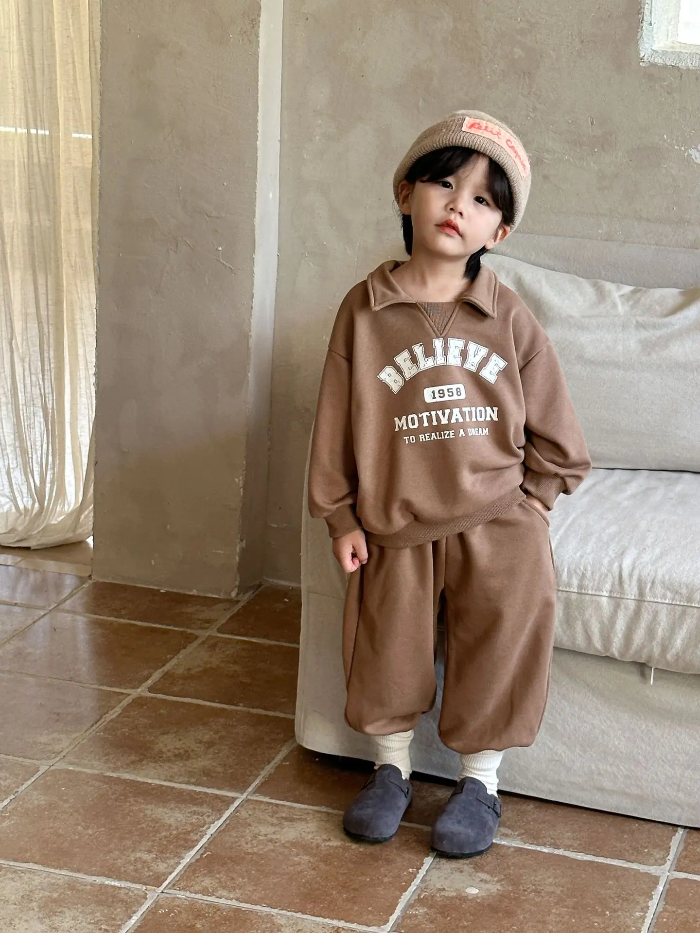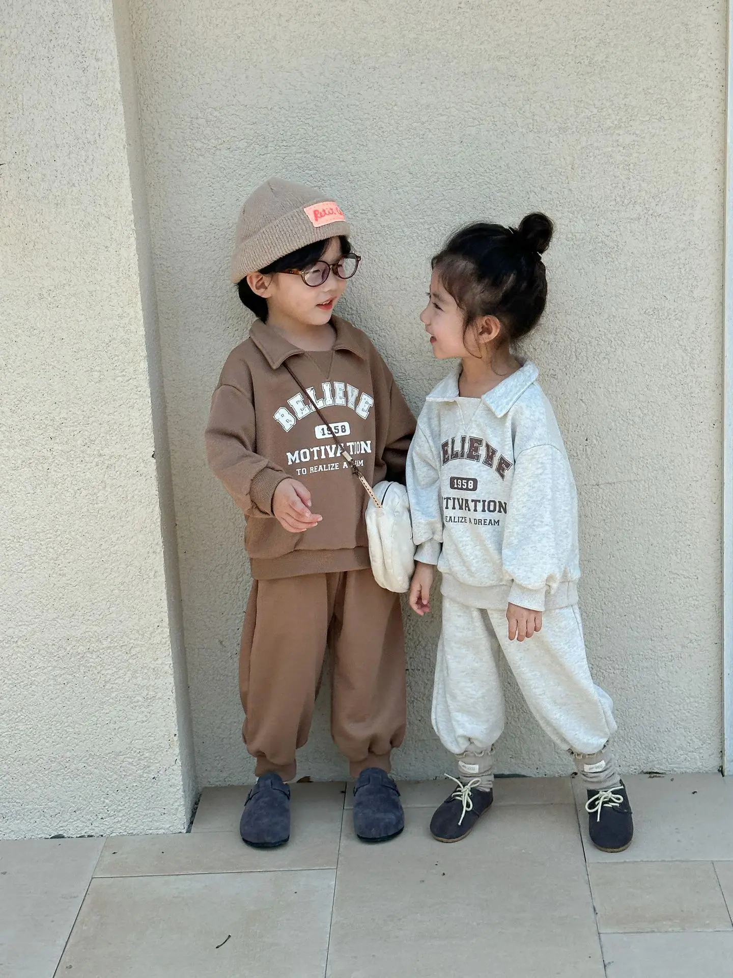 襟付きの長袖スウェットシャツとロングパンツの2点セットで、おしゃれと快適さを兼ね備えたキッズセットアップです。レターロゴプリントがカジュアルなアクセントを加え、日常のコーディネートにぴったり。柔らかなコットン素材で、動きやすく、一日中快適に過ごせます。秋のシーズンにぴったりのこのセットアップで、子どもの毎日をもっと楽しく彩りましょう。