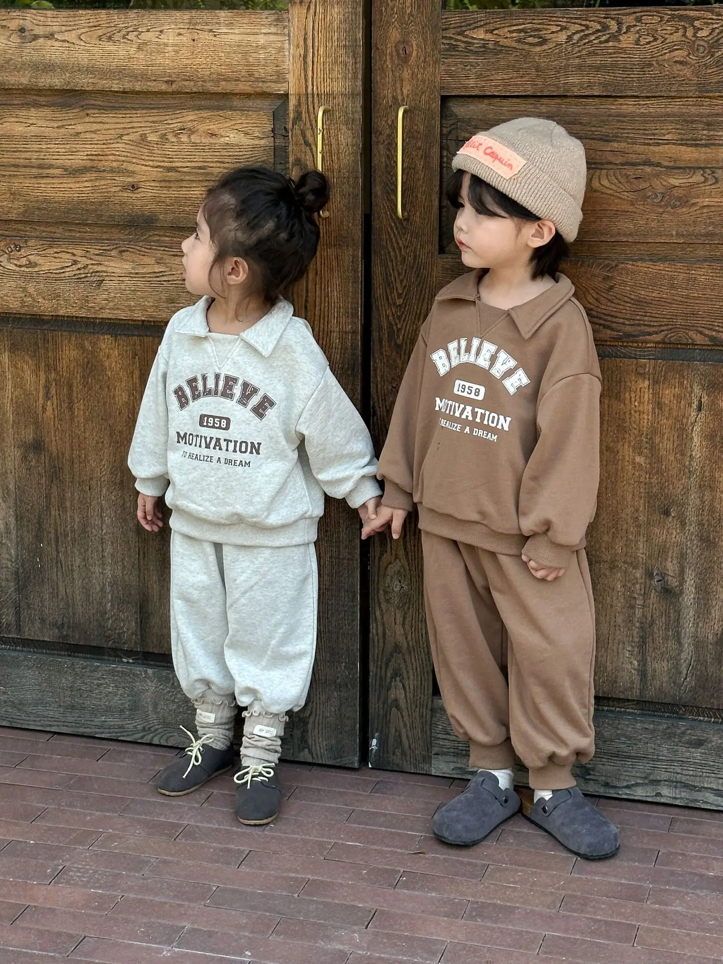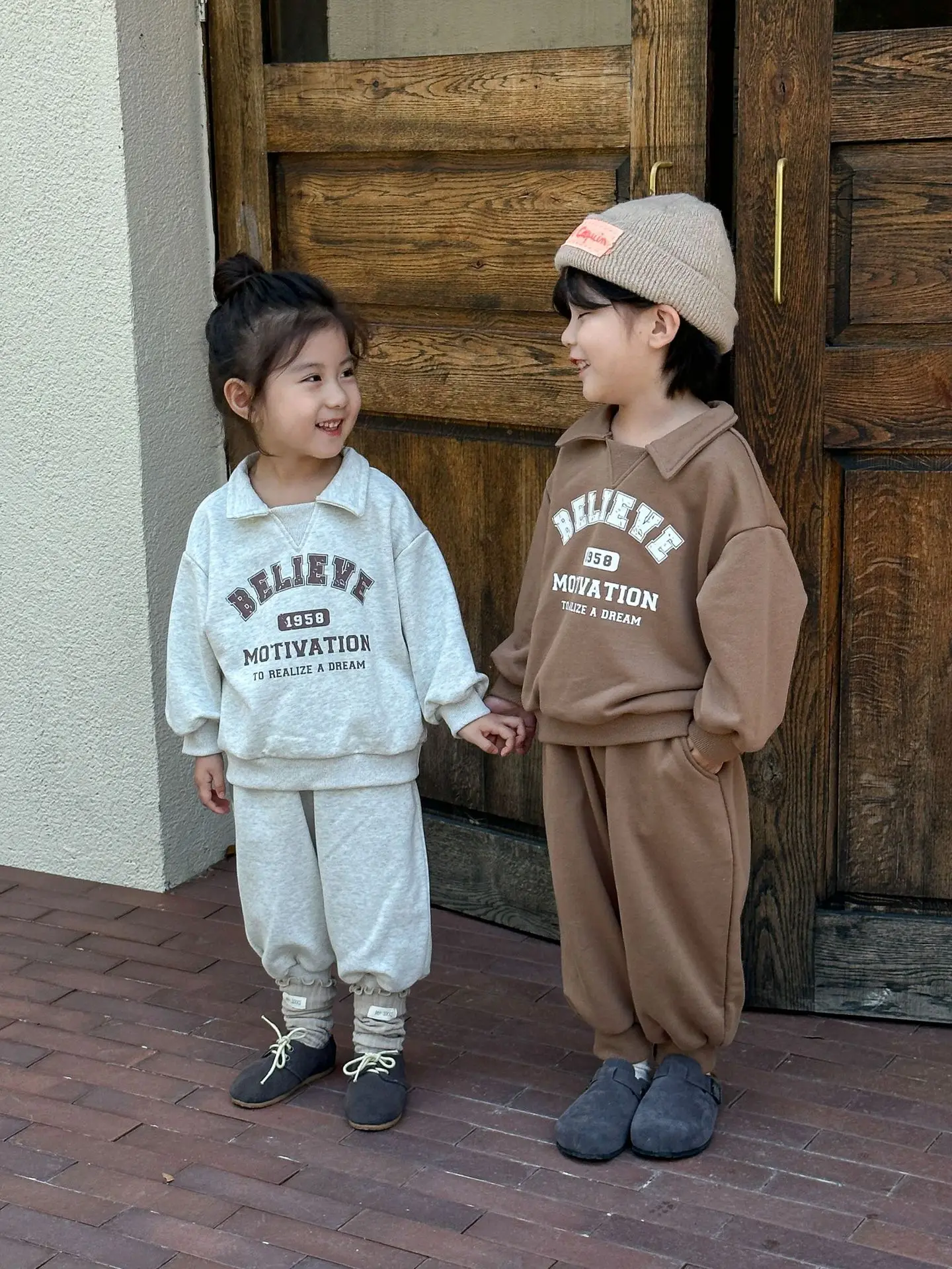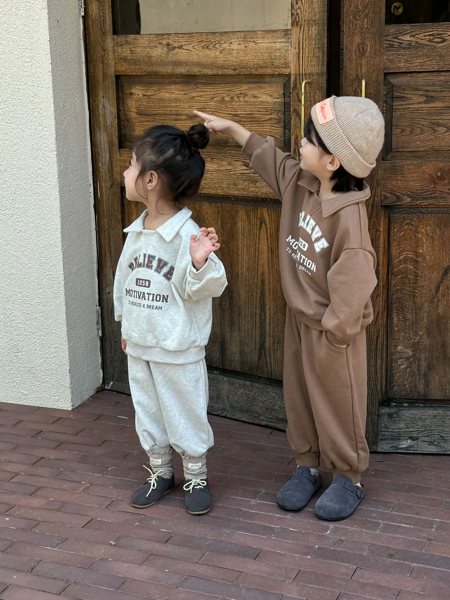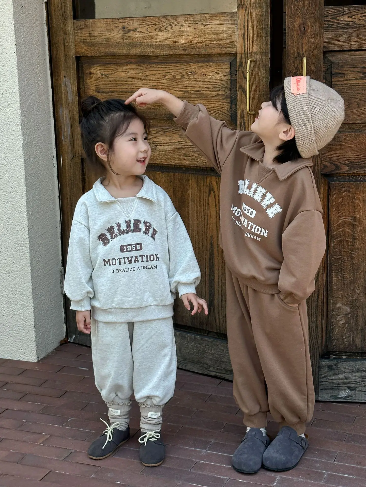 襟付きの長袖スウェットシャツとロングパンツの2点セットで、おしゃれと快適さを兼ね備えたキッズセットアップです。レターロゴプリントがカジュアルなアクセントを加え、日常のコーディネートにぴったり。柔らかなコットン素材で、動きやすく、一日中快適に過ごせます。秋のシーズンにぴったりのこのセットアップで、子どもの毎日をもっと楽しく彩りましょう。