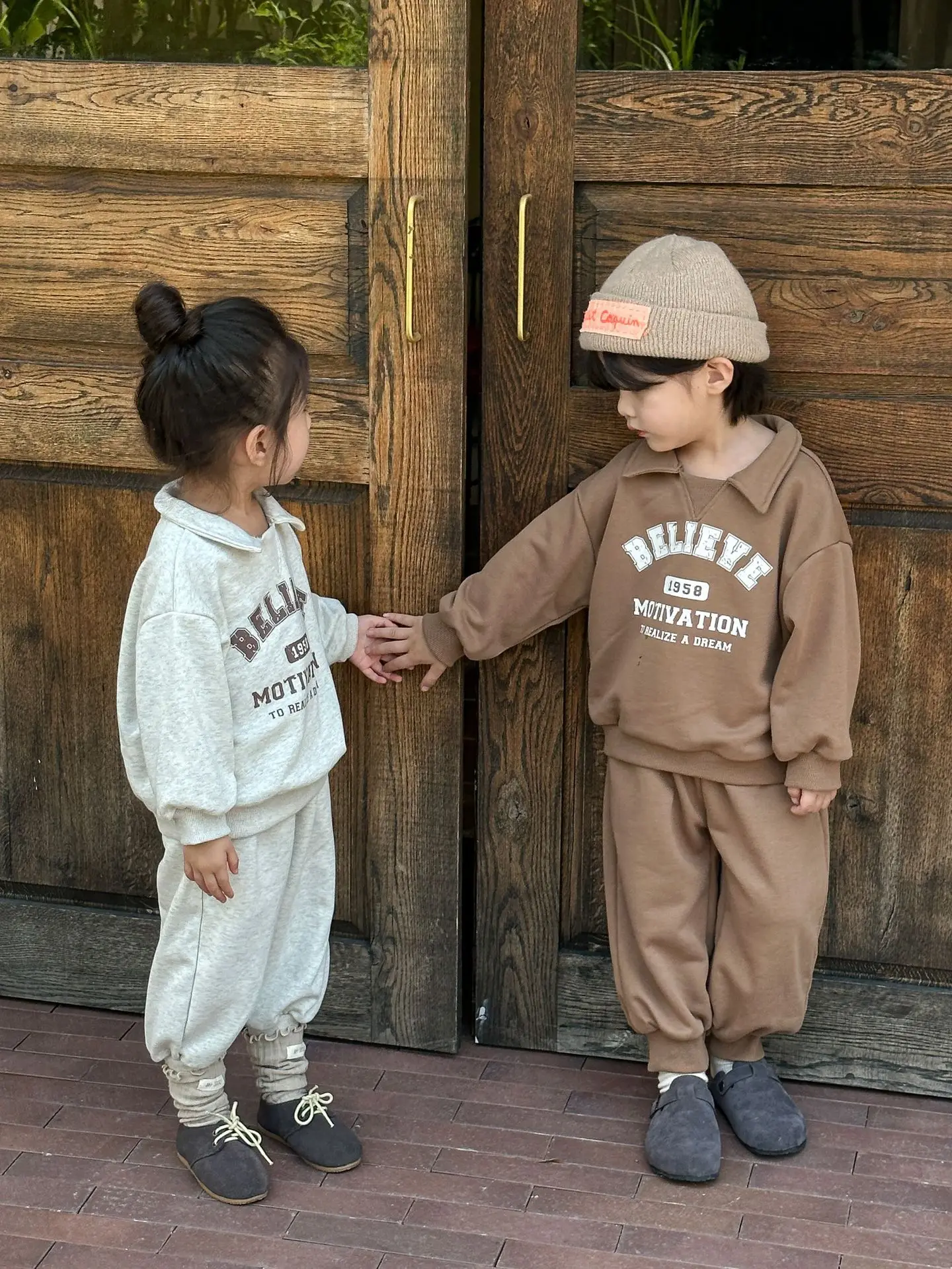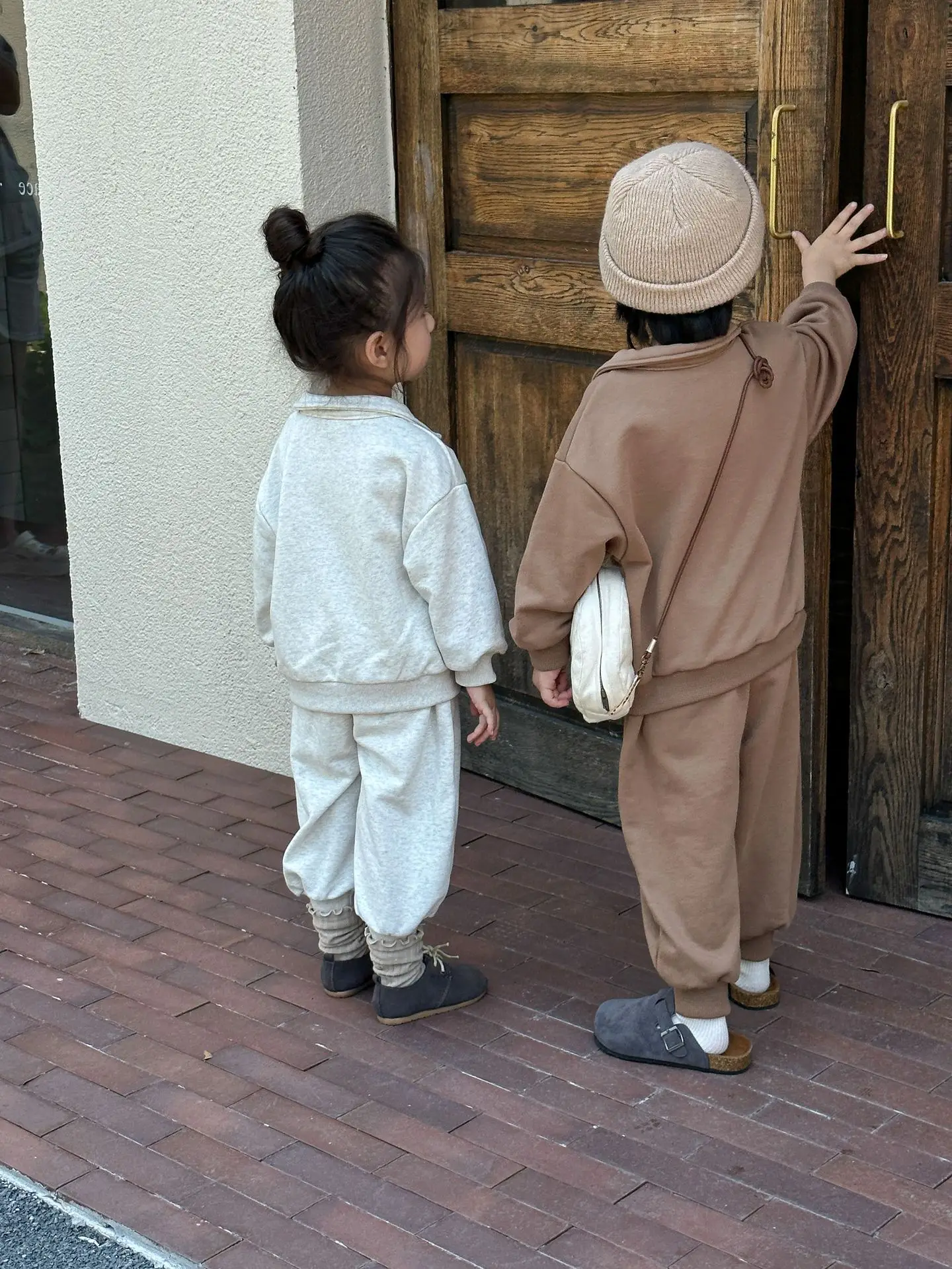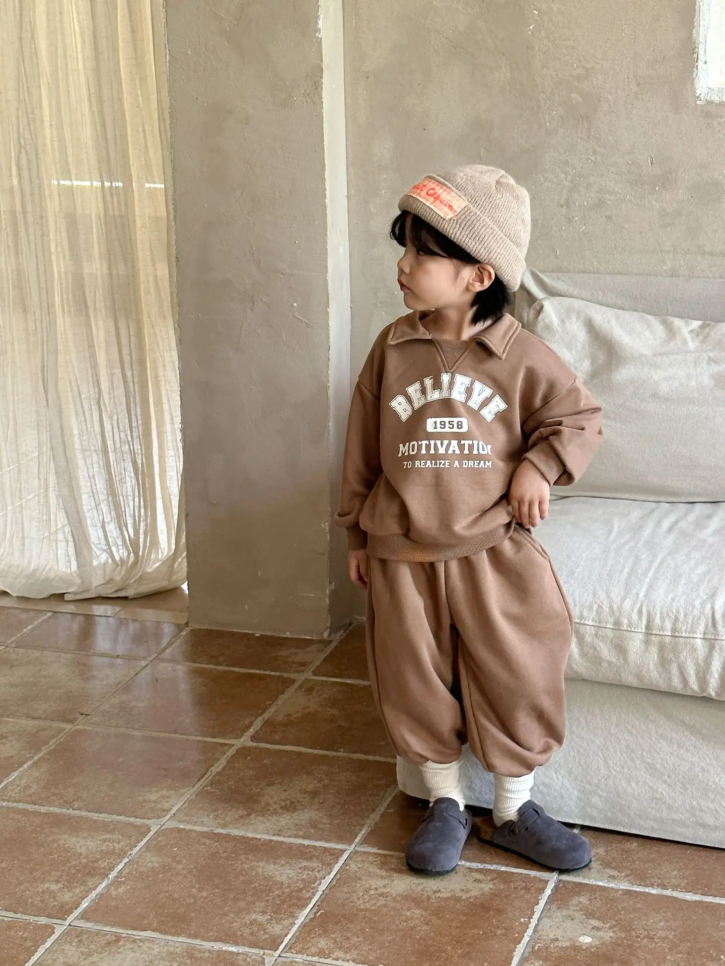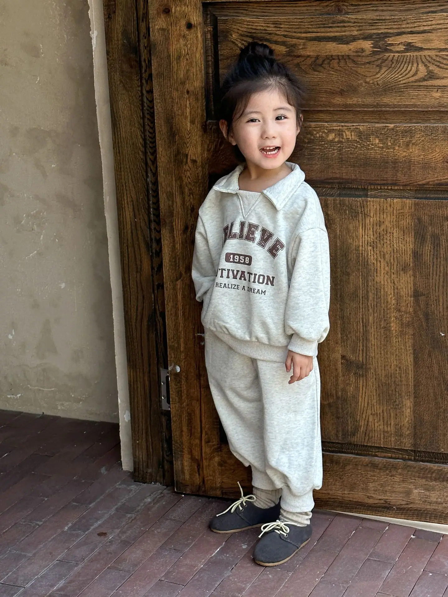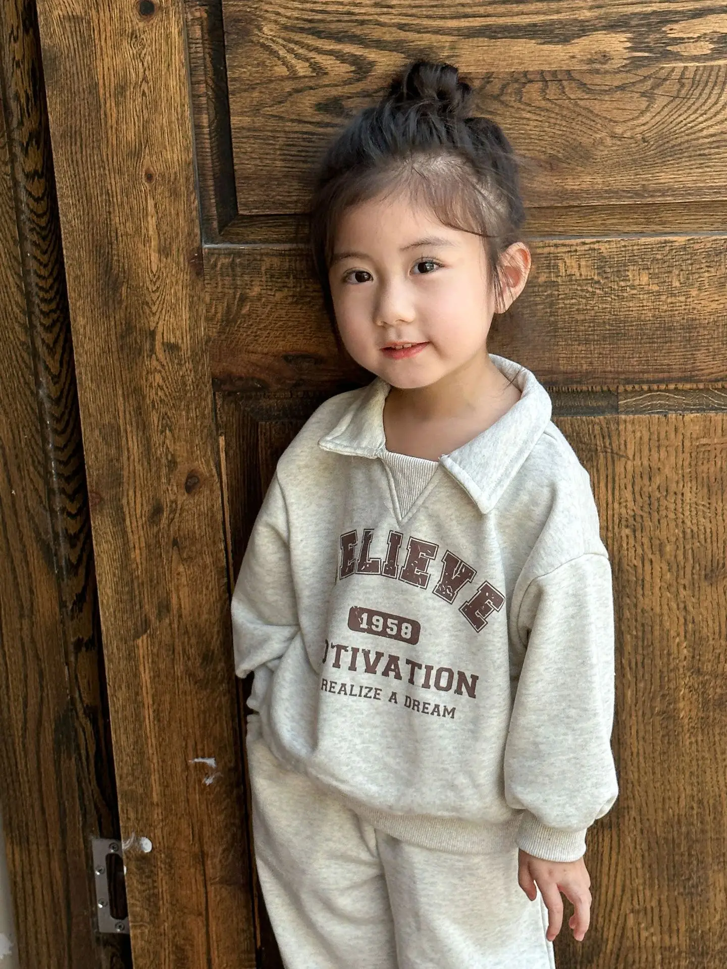 襟付きの長袖スウェットシャツとロングパンツの2点セットで、おしゃれと快適さを兼ね備えたキッズセットアップです。レターロゴプリントがカジュアルなアクセントを加え、日常のコーディネートにぴったり。柔らかなコットン素材で、動きやすく、一日中快適に過ごせます。秋のシーズンにぴったりのこのセットアップで、子どもの毎日をもっと楽しく彩りましょう。