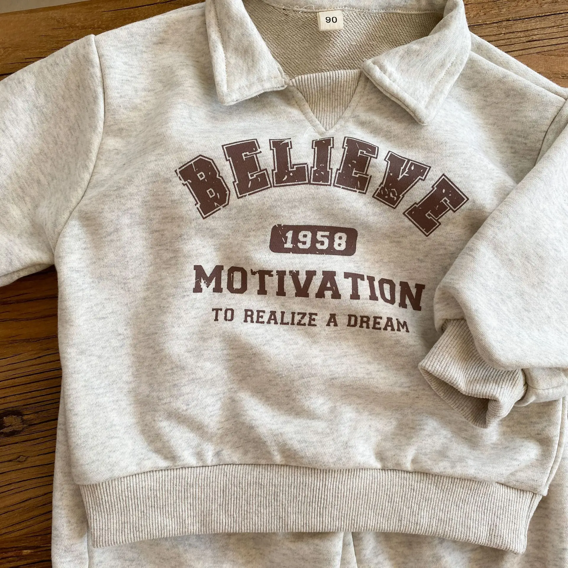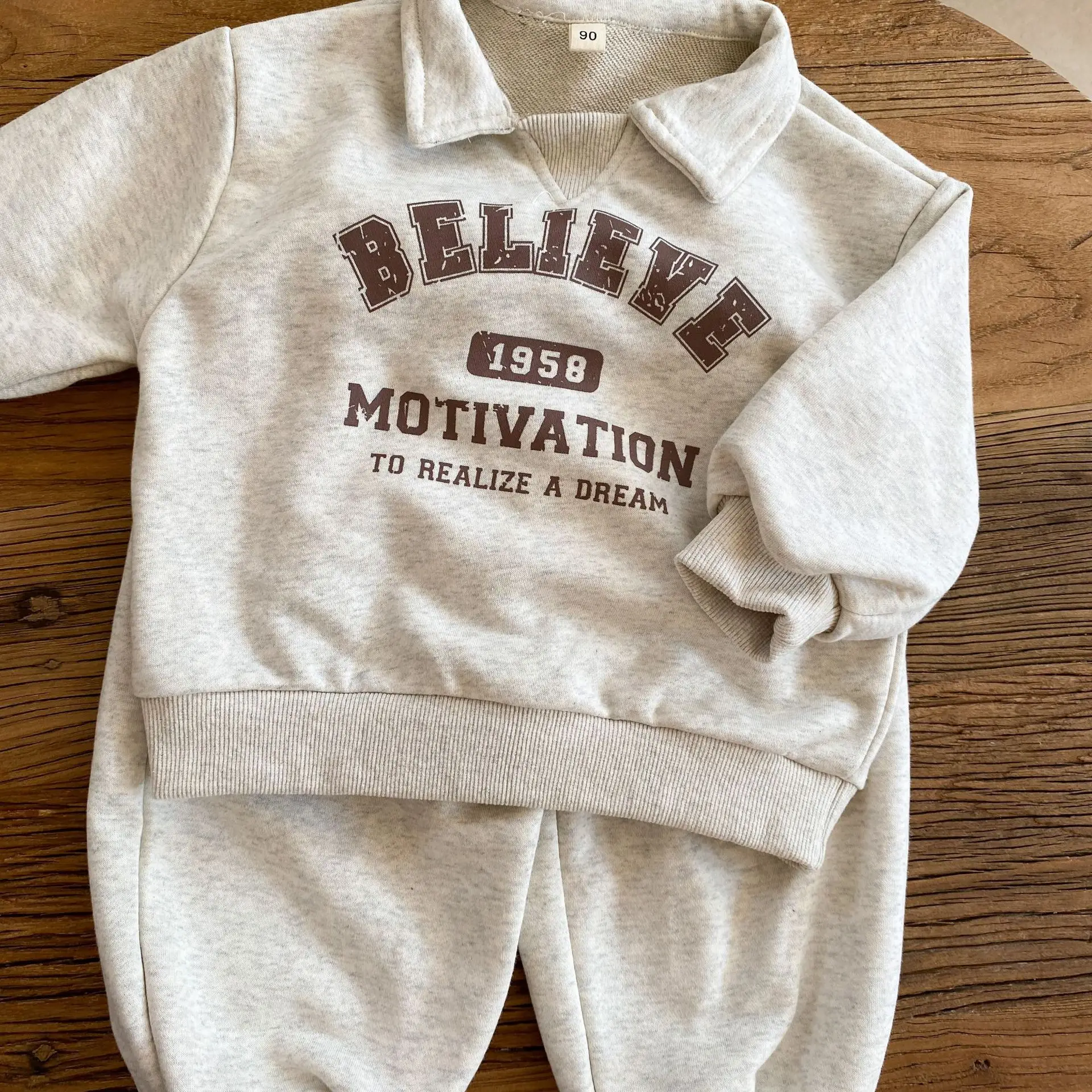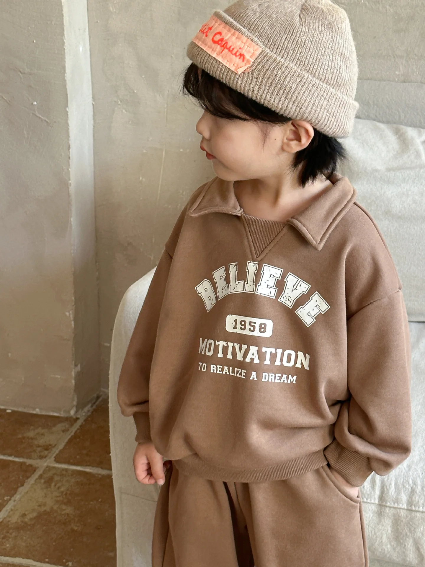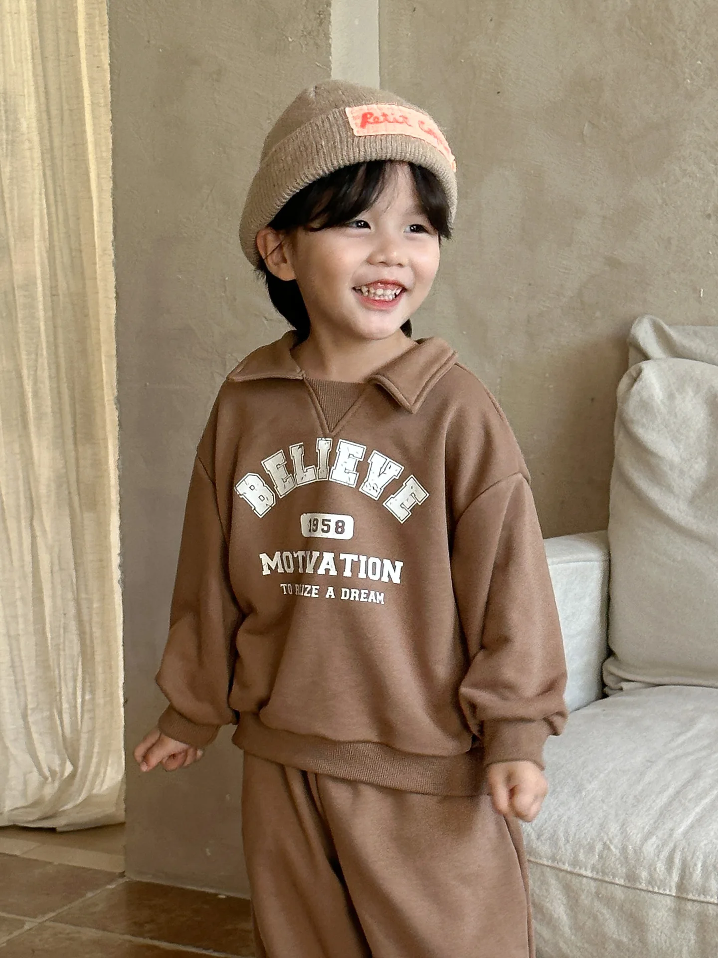 襟付きの長袖スウェットシャツとロングパンツの2点セットで、おしゃれと快適さを兼ね備えたキッズセットアップです。レターロゴプリントがカジュアルなアクセントを加え、日常のコーディネートにぴったり。柔らかなコットン素材で、動きやすく、一日中快適に過ごせます。秋のシーズンにぴったりのこのセットアップで、子どもの毎日をもっと楽しく彩りましょう。