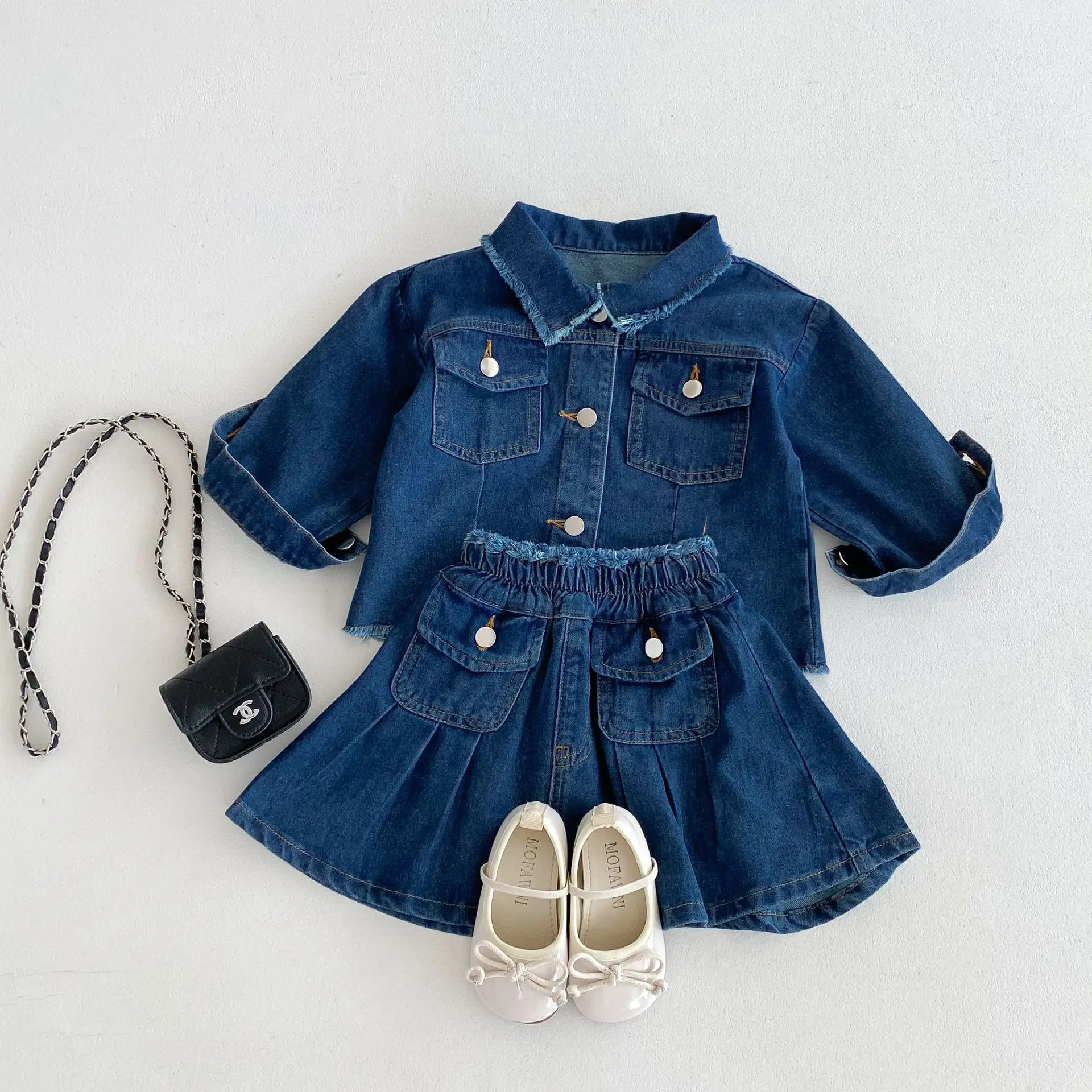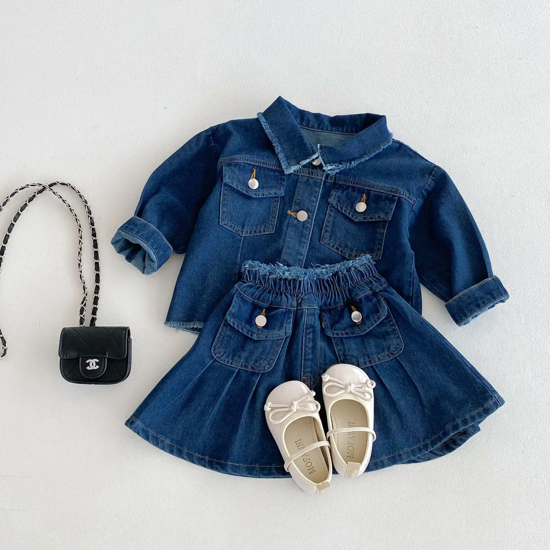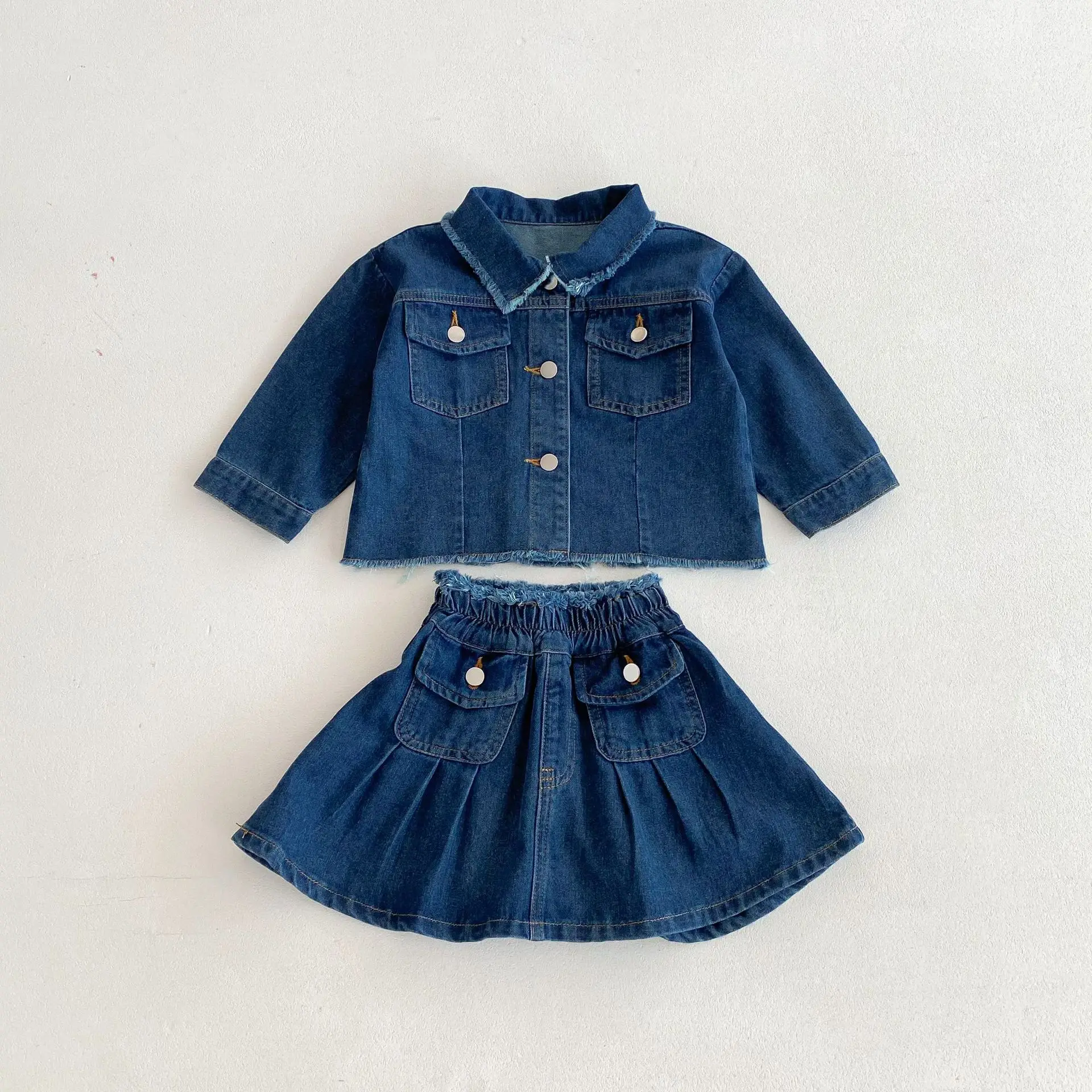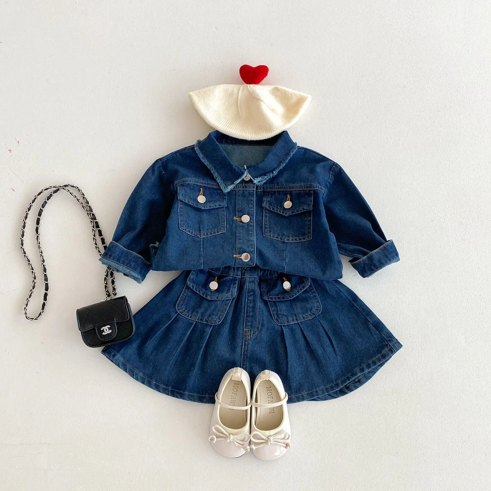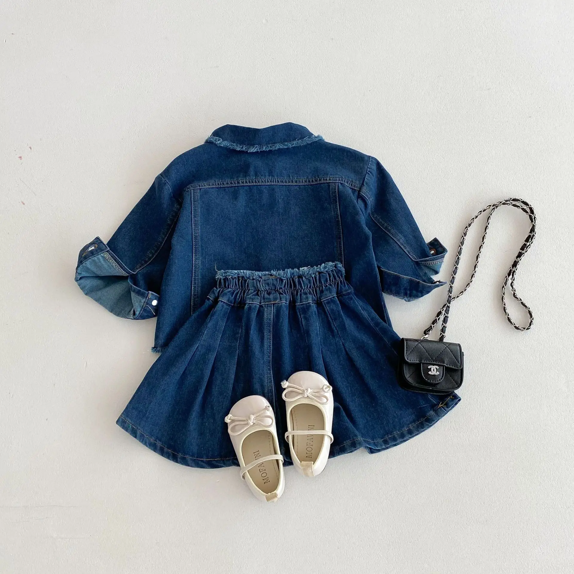 キッズセットアップ 2点セット デニム長袖シャツ+ポケットアクセントデニムスカート【mh0006981】