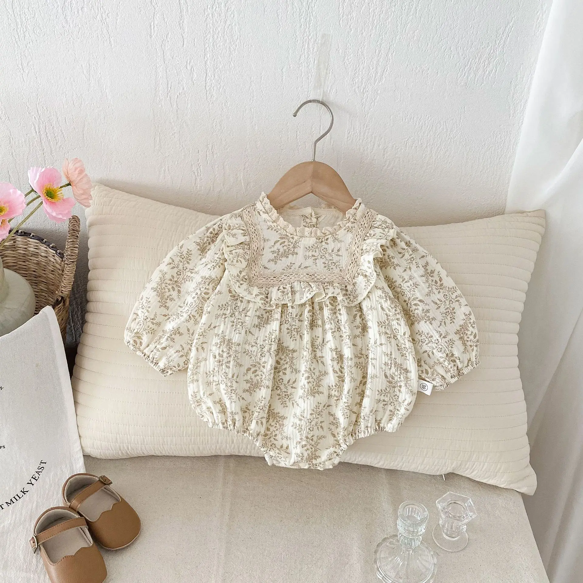ベビーロンパース フリルフラワープリント長袖ボディスーツ アプリコット【mh0007301】