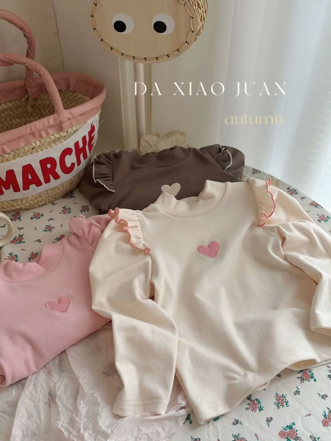 キッズトップス ハート刺繍ショルダーフリル長袖Tシャツ 3カラー【mh0007540】