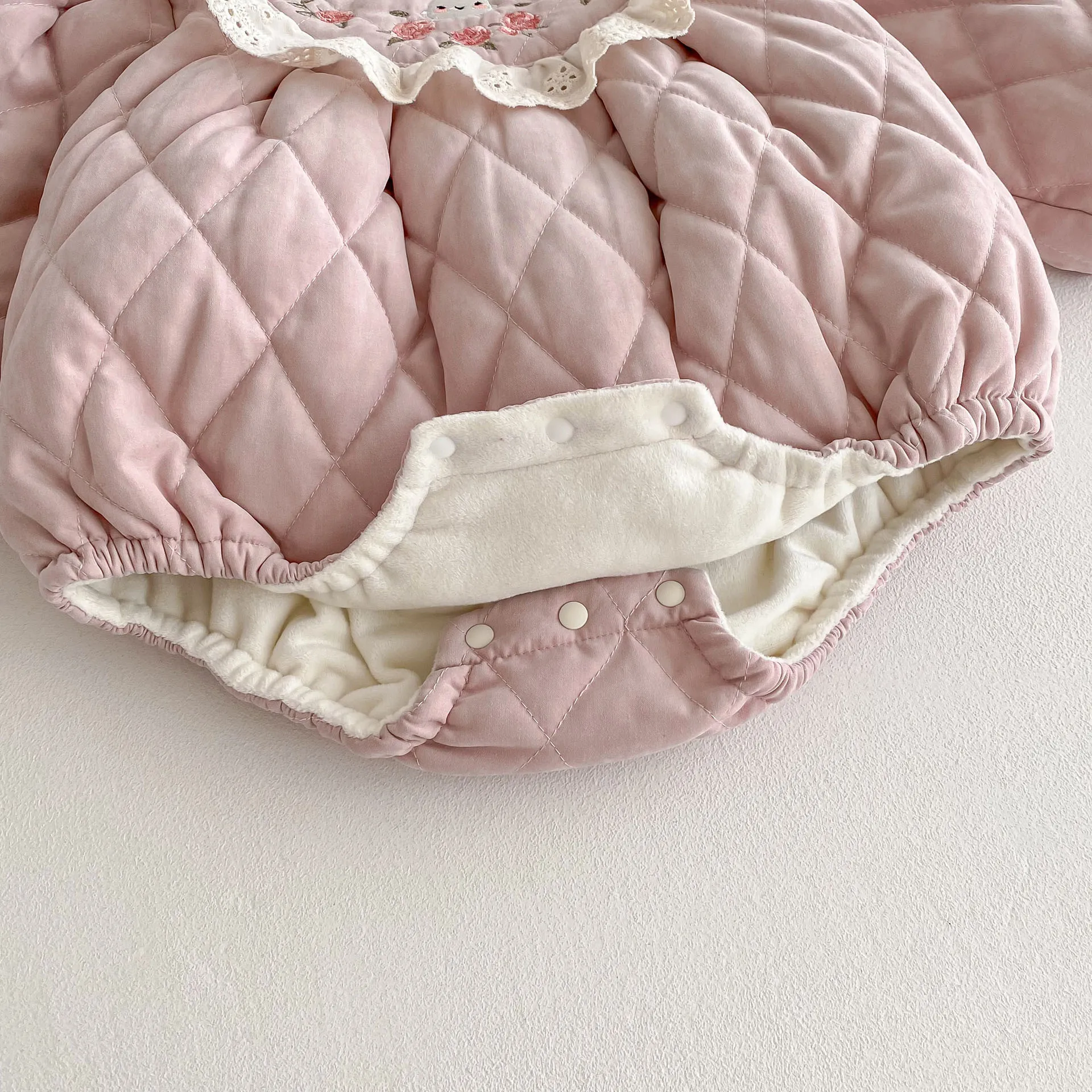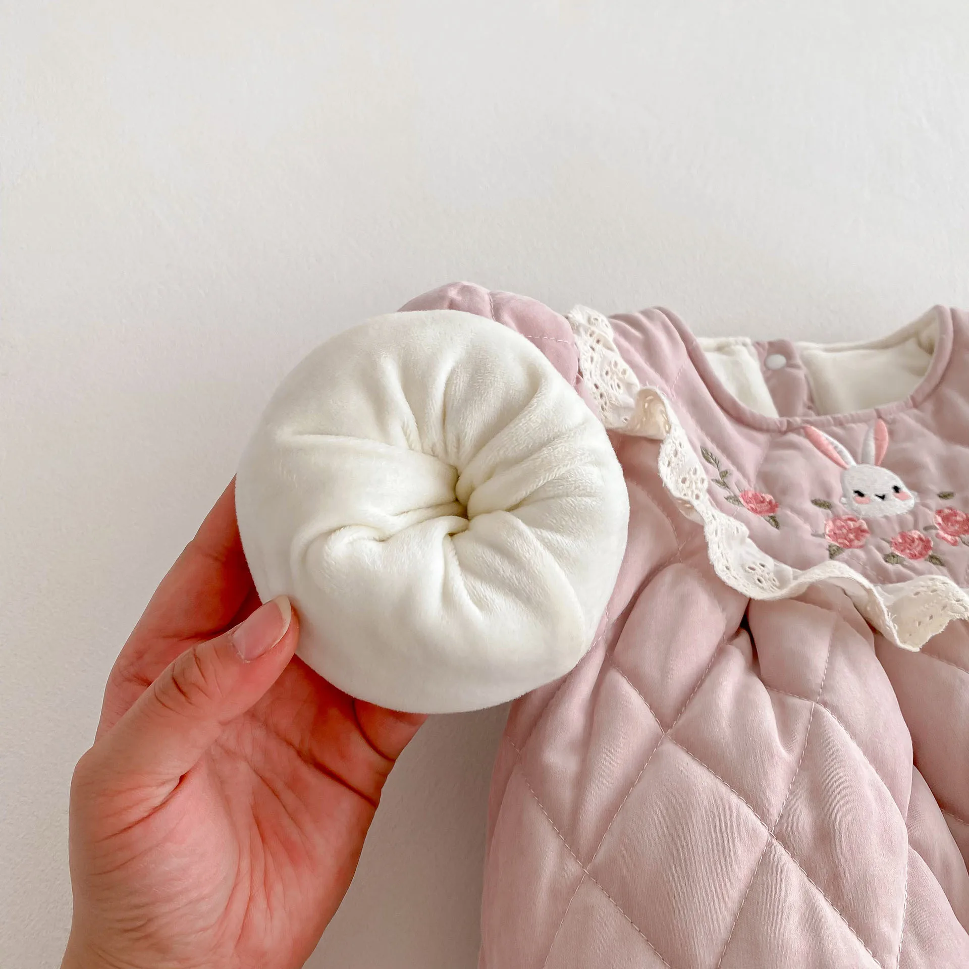 ベビーロンパース/ジャンプスーツ うさぎ刺繍キルティング長袖アウターボディースーツ ピンク【mh0007624】