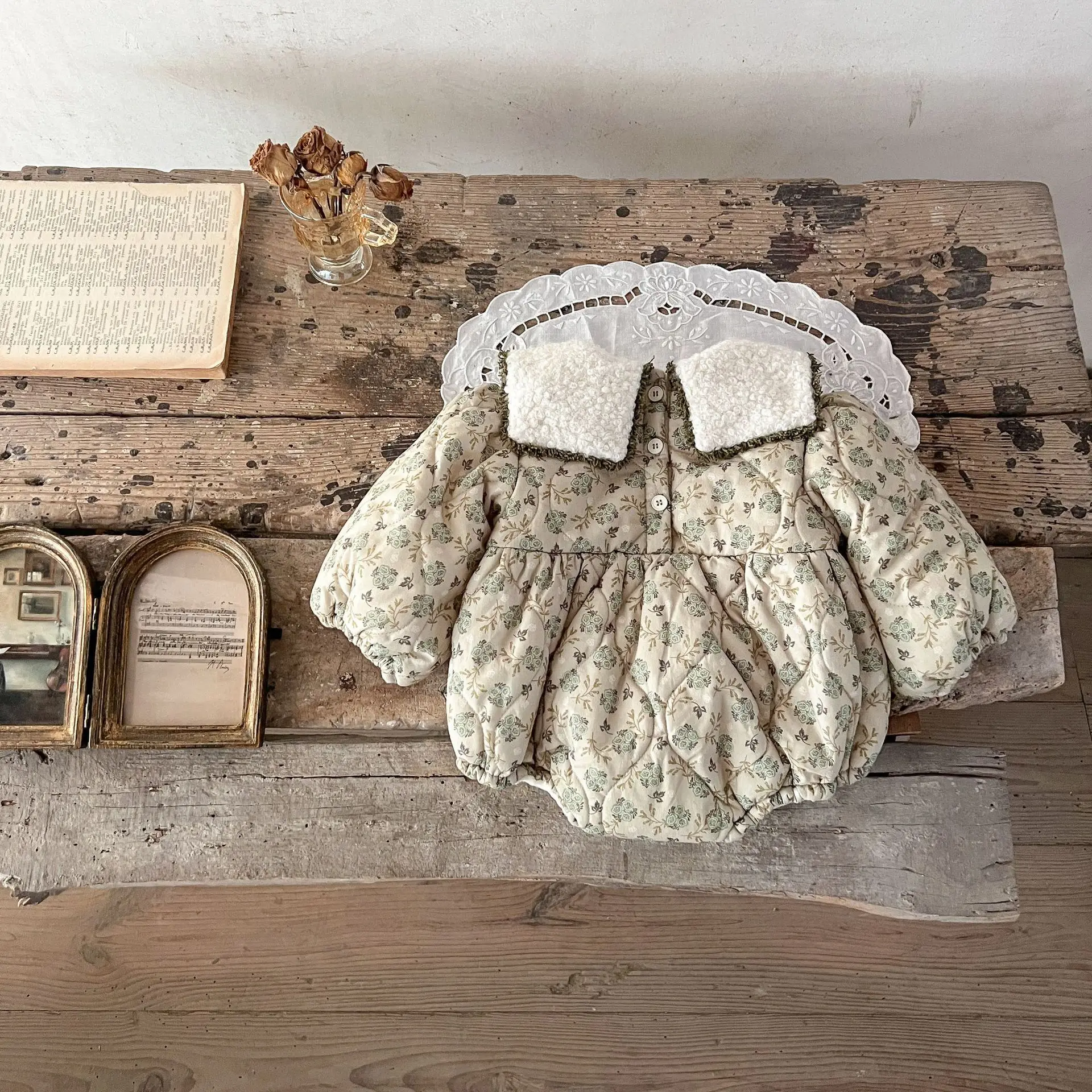 ベビーロンパース フラワープリントボアフリースセーラーカラーキルティング厚手長袖ボディスーツ【mh0007626】