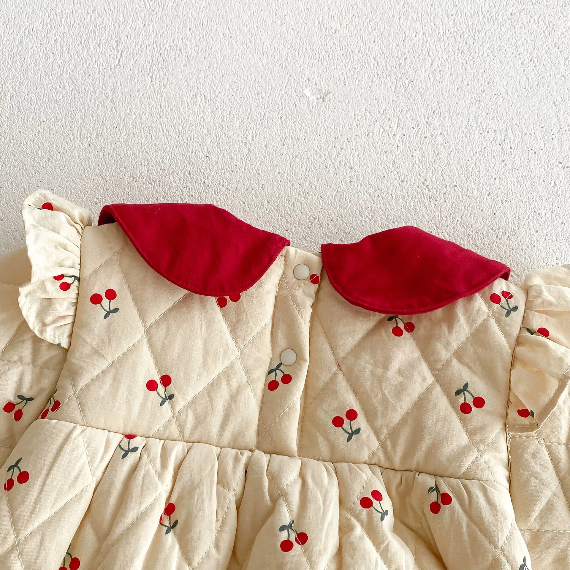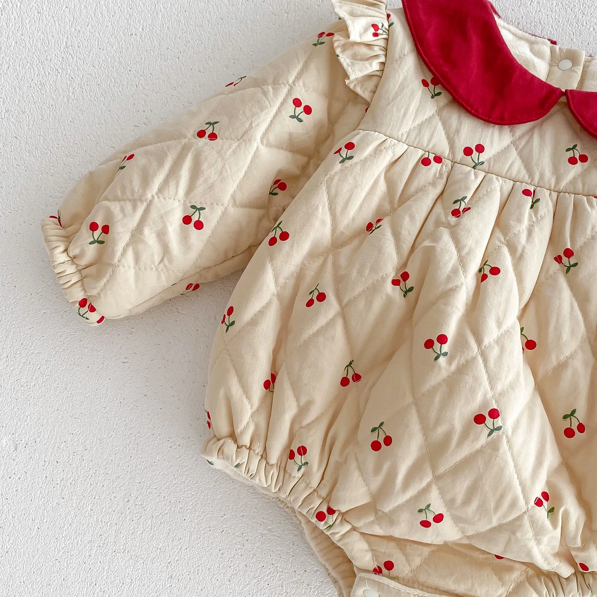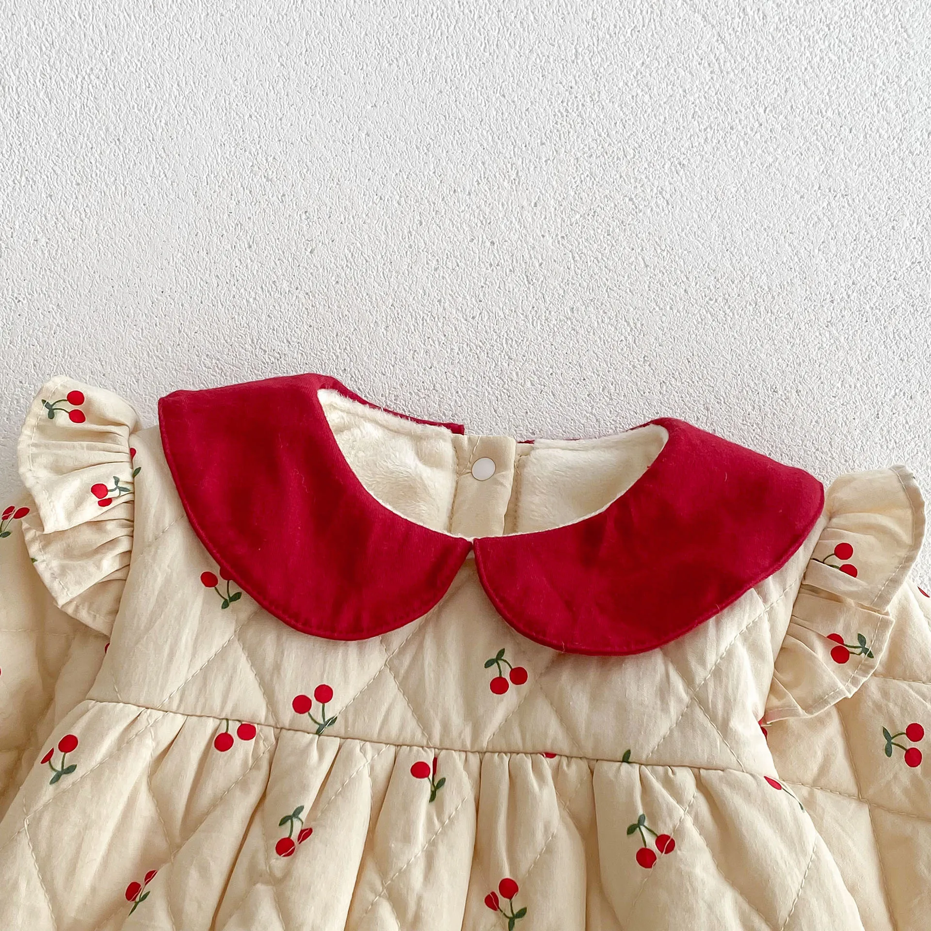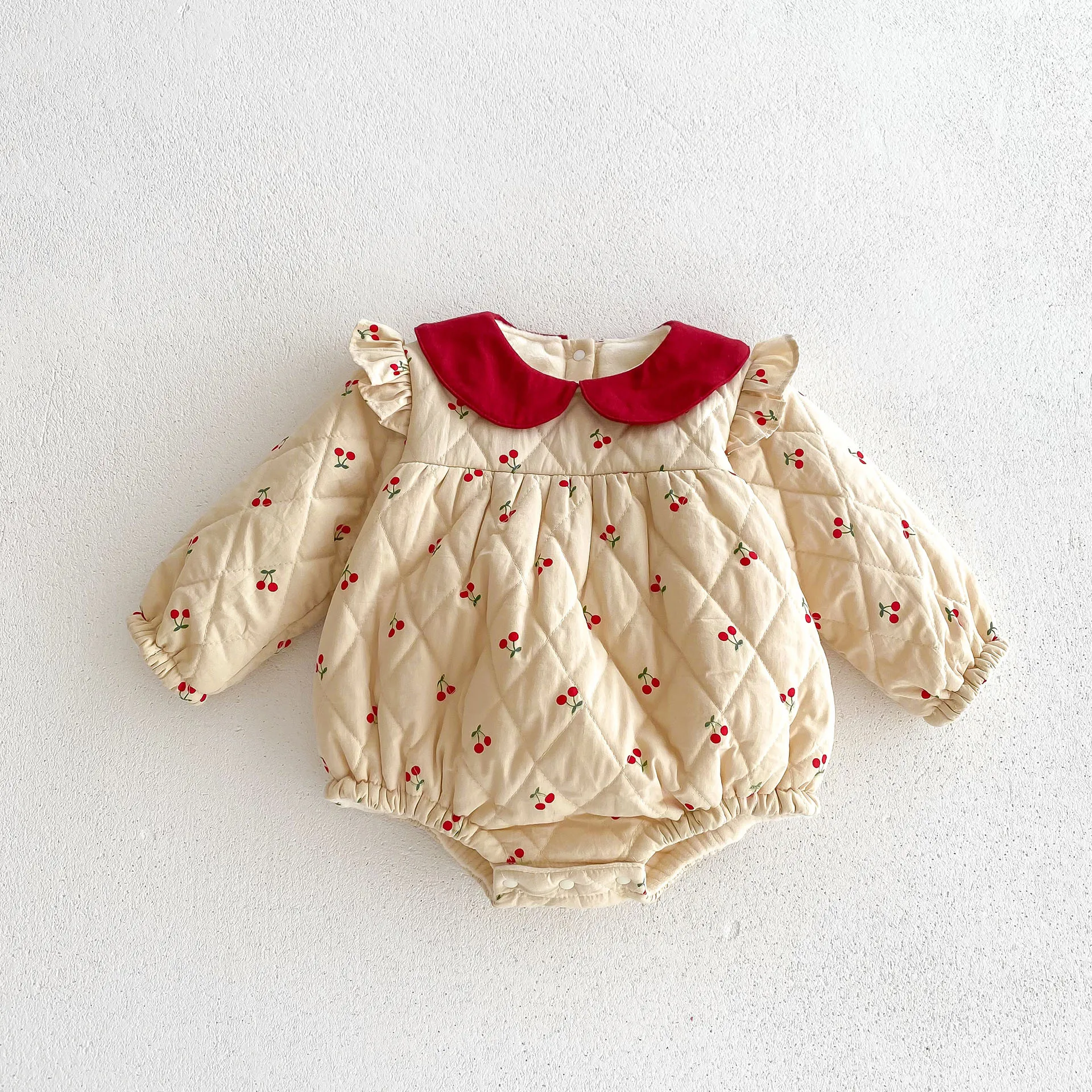 #ベビー服 #ロンパース #チェリープリント #フリルショルダー #裏フリース #ピーターパンカラー #韓国子供服 #冬用ボディスーツ