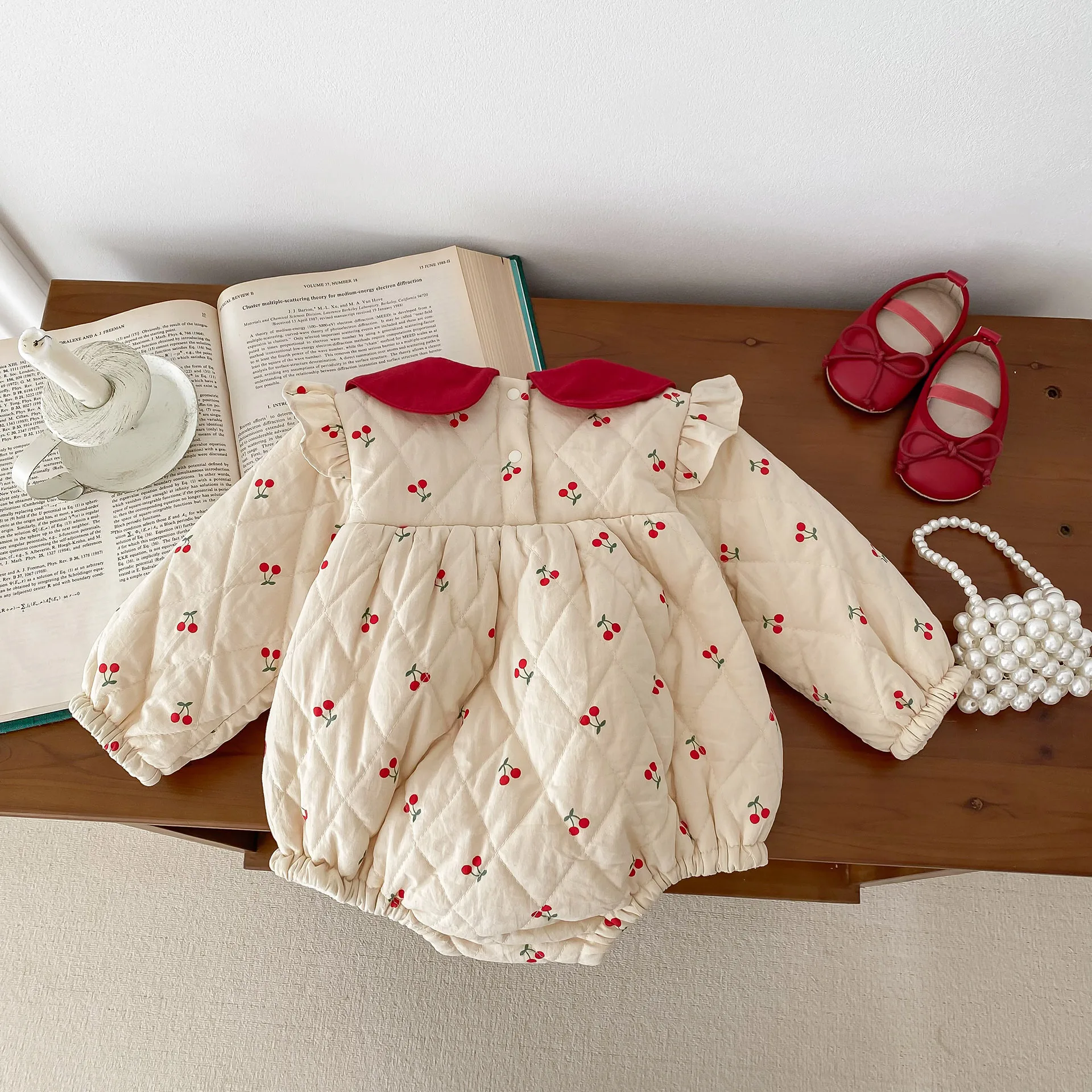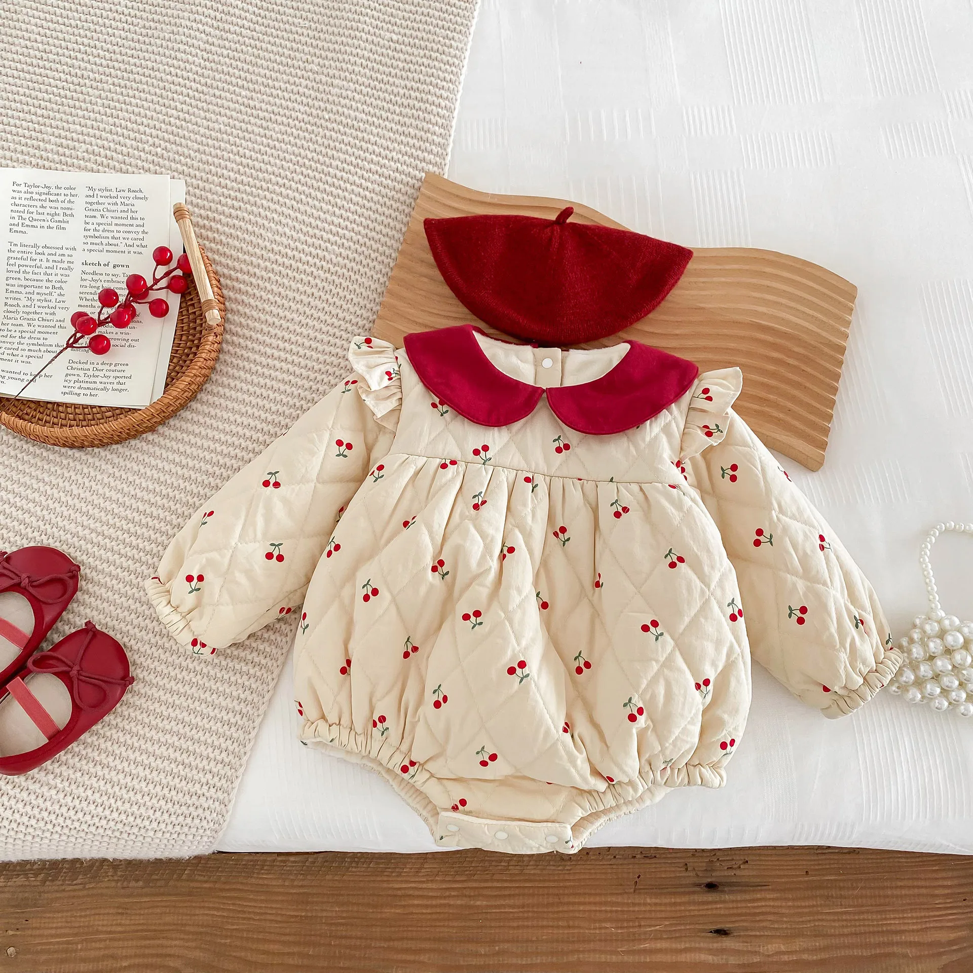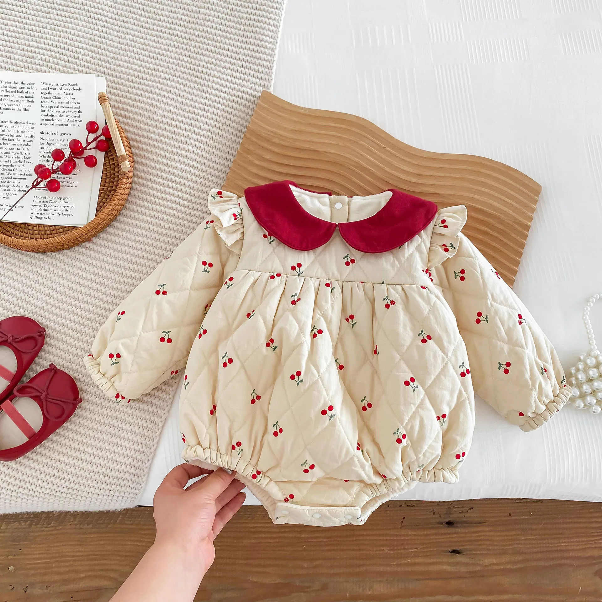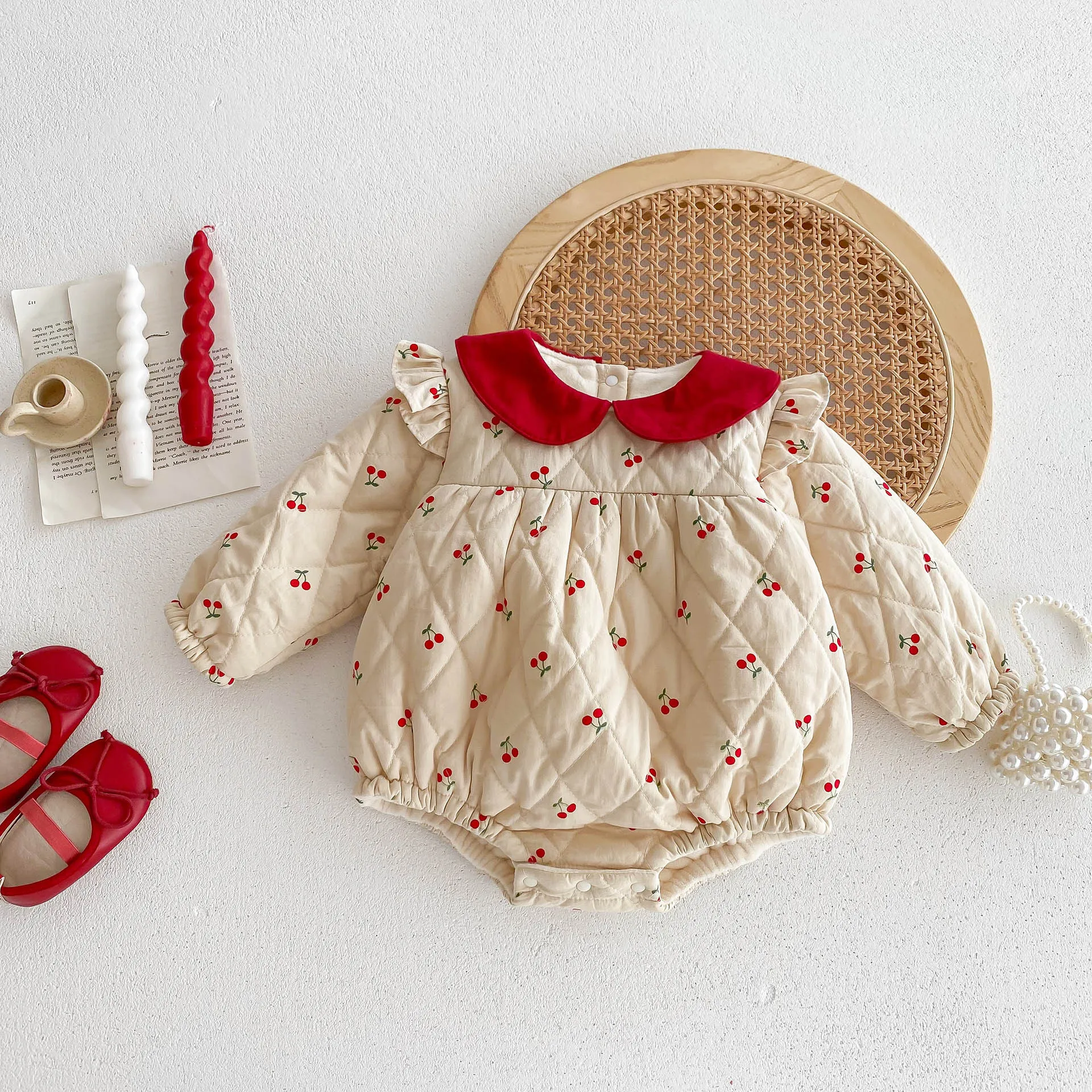 #ベビー服 #ロンパース #チェリープリント #フリルショルダー #裏フリース #ピーターパンカラー #韓国子供服 #冬用ボディスーツ