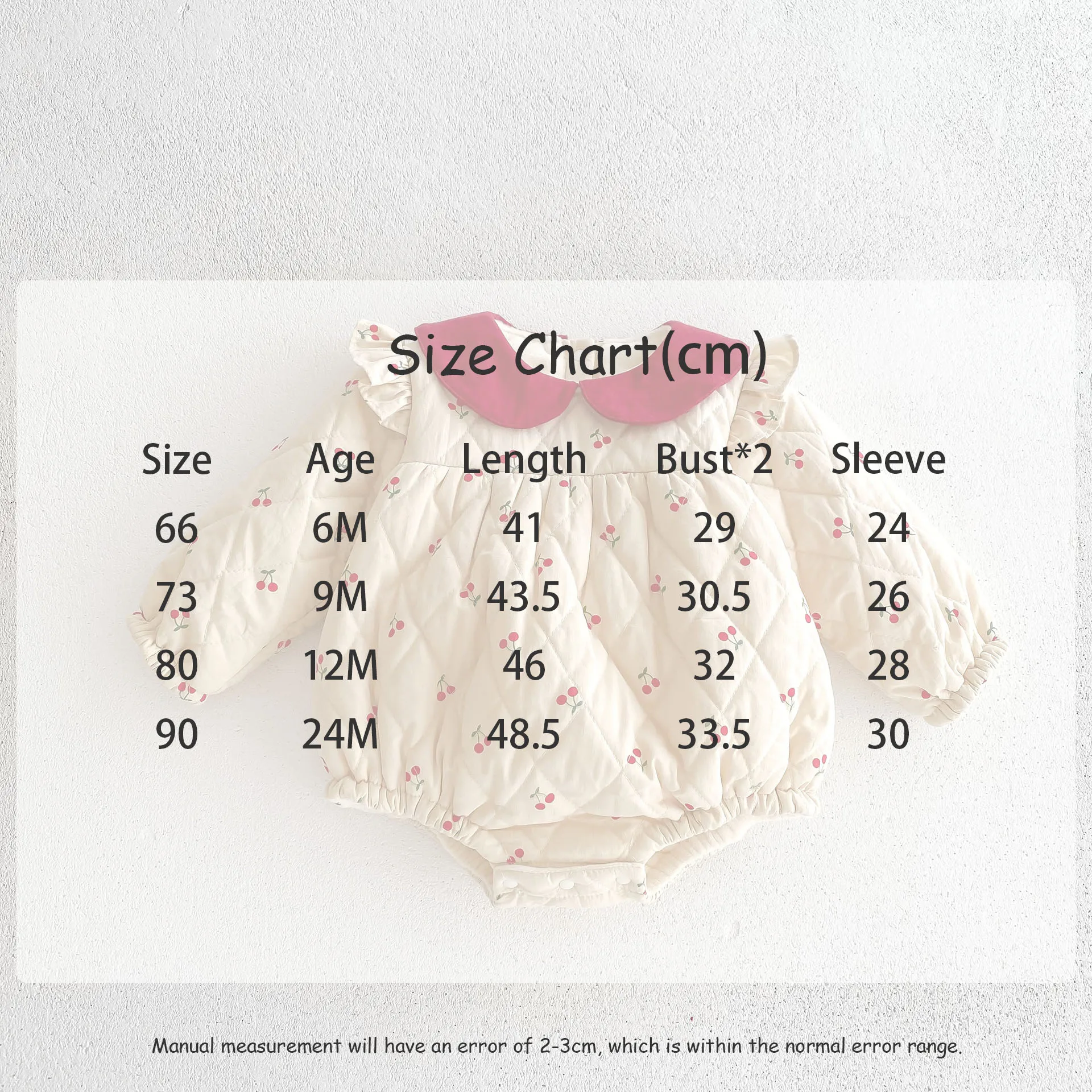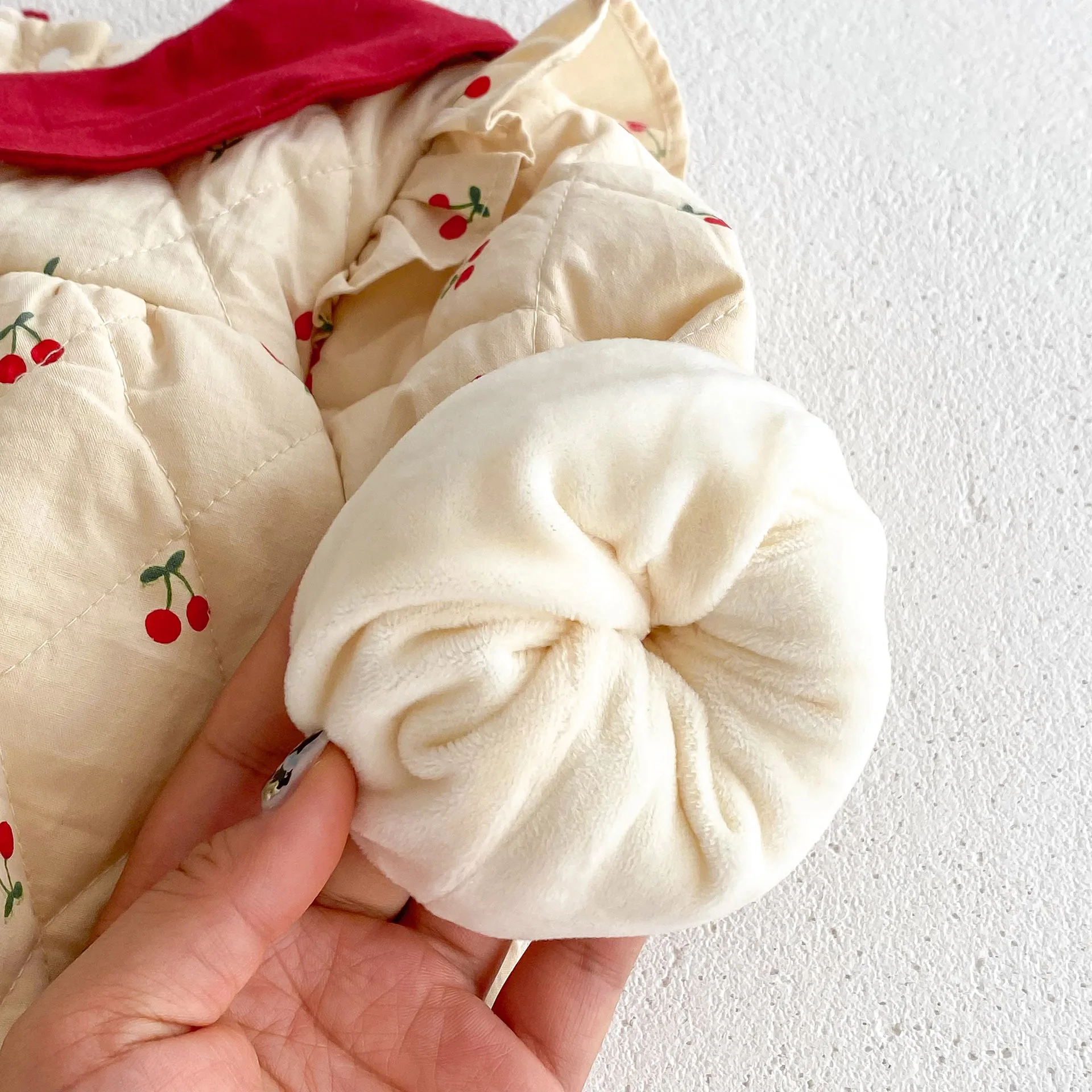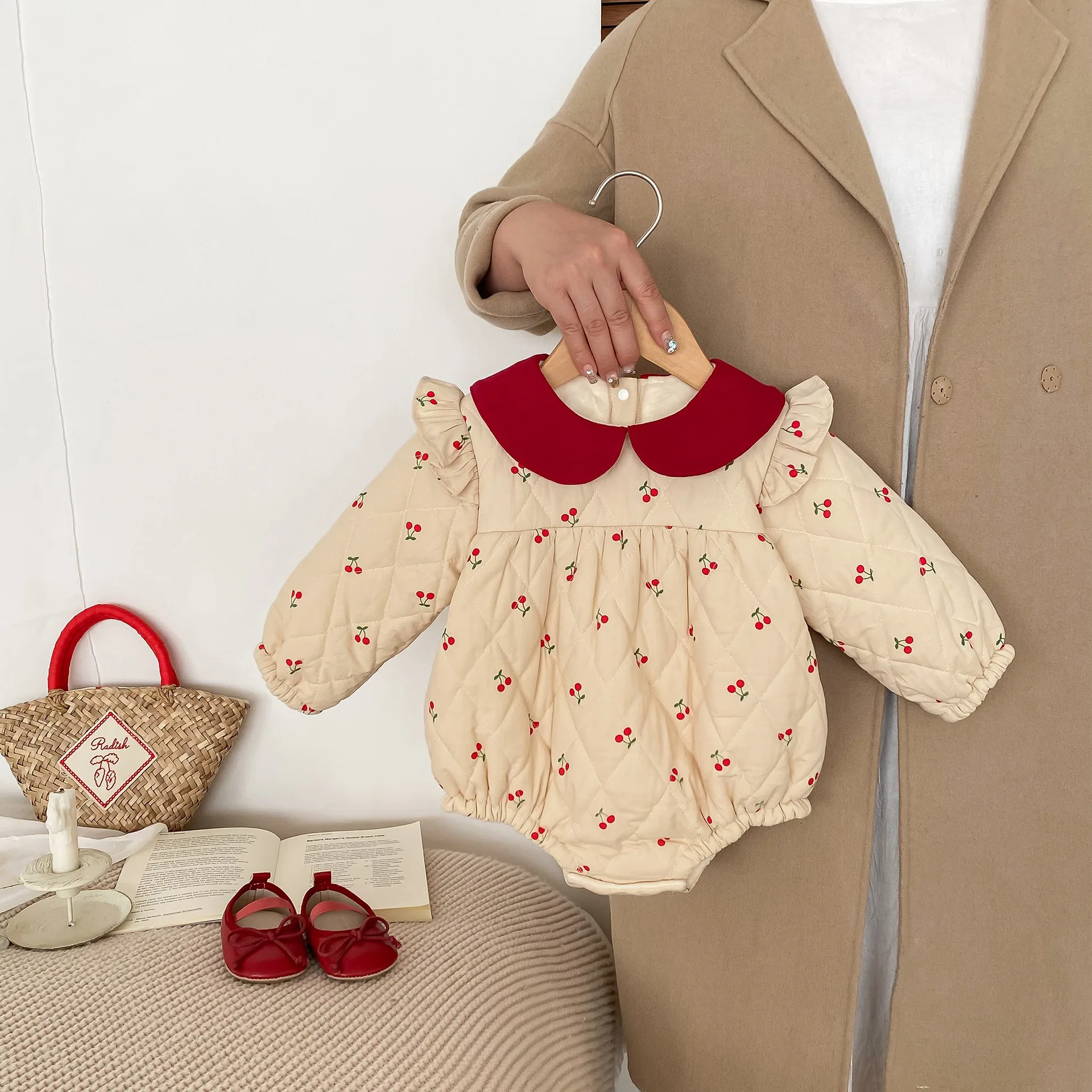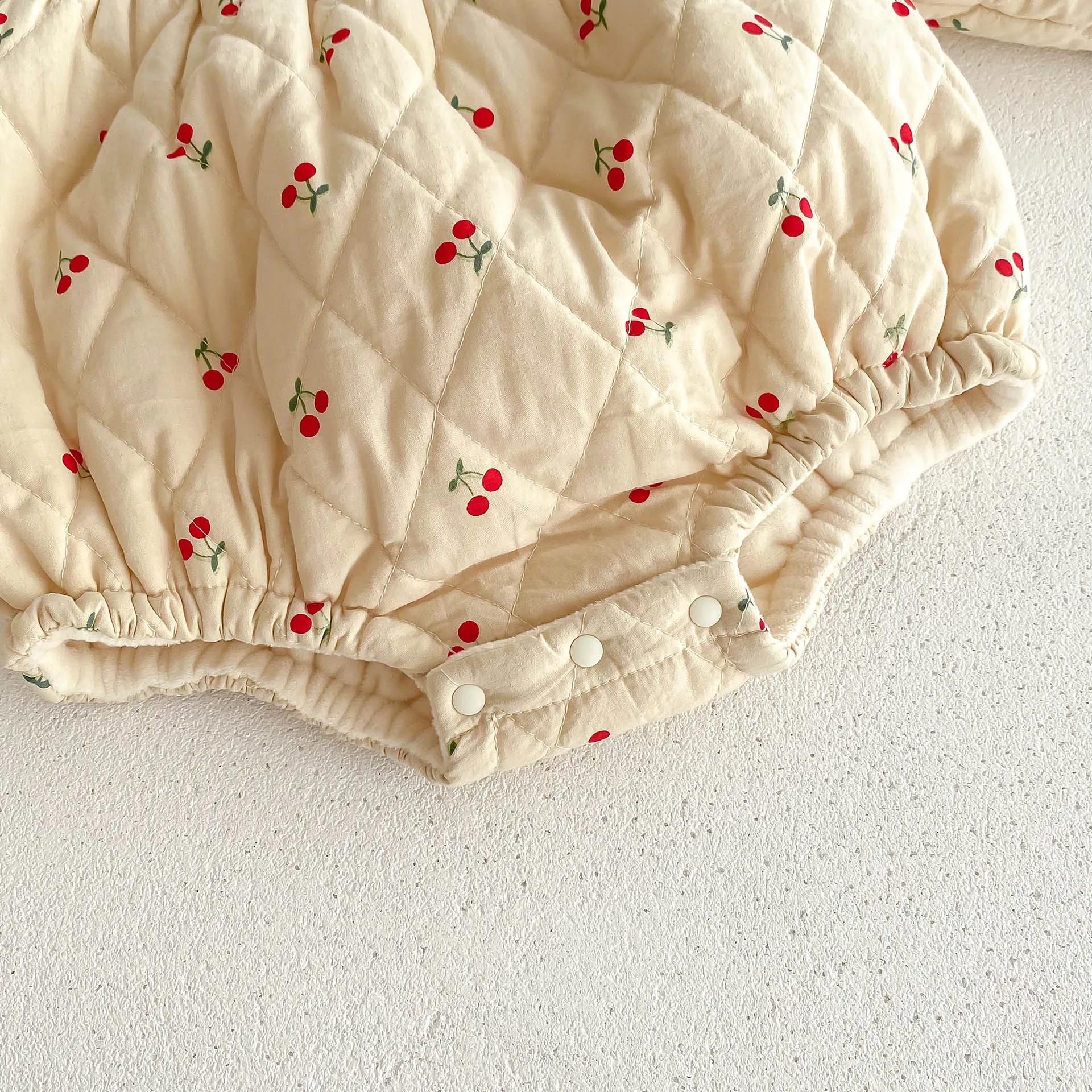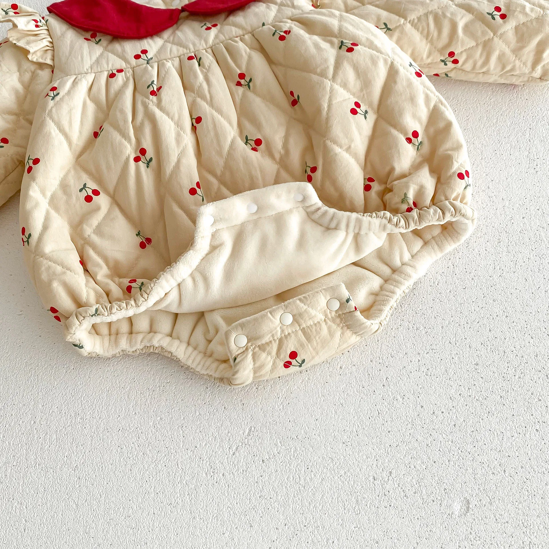 チェリープリントとフリルショルダーが可愛らしい長袖キルティングボディスーツは、寒い季節にぴったりのベビーアイテムです。裏地には柔らかなフリースが使用されており、全身を暖かく包み込んで快適な着心地を提供します。ピーターパンカラーが上品な印象を加え、デザインに可憐さを添えています。スナップボタン仕様で着脱も簡単で、おむつ替えもスムーズです。特別な日のお出かけや日常使いにも適した、機能性と愛らしさを兼ね備えた一着です。