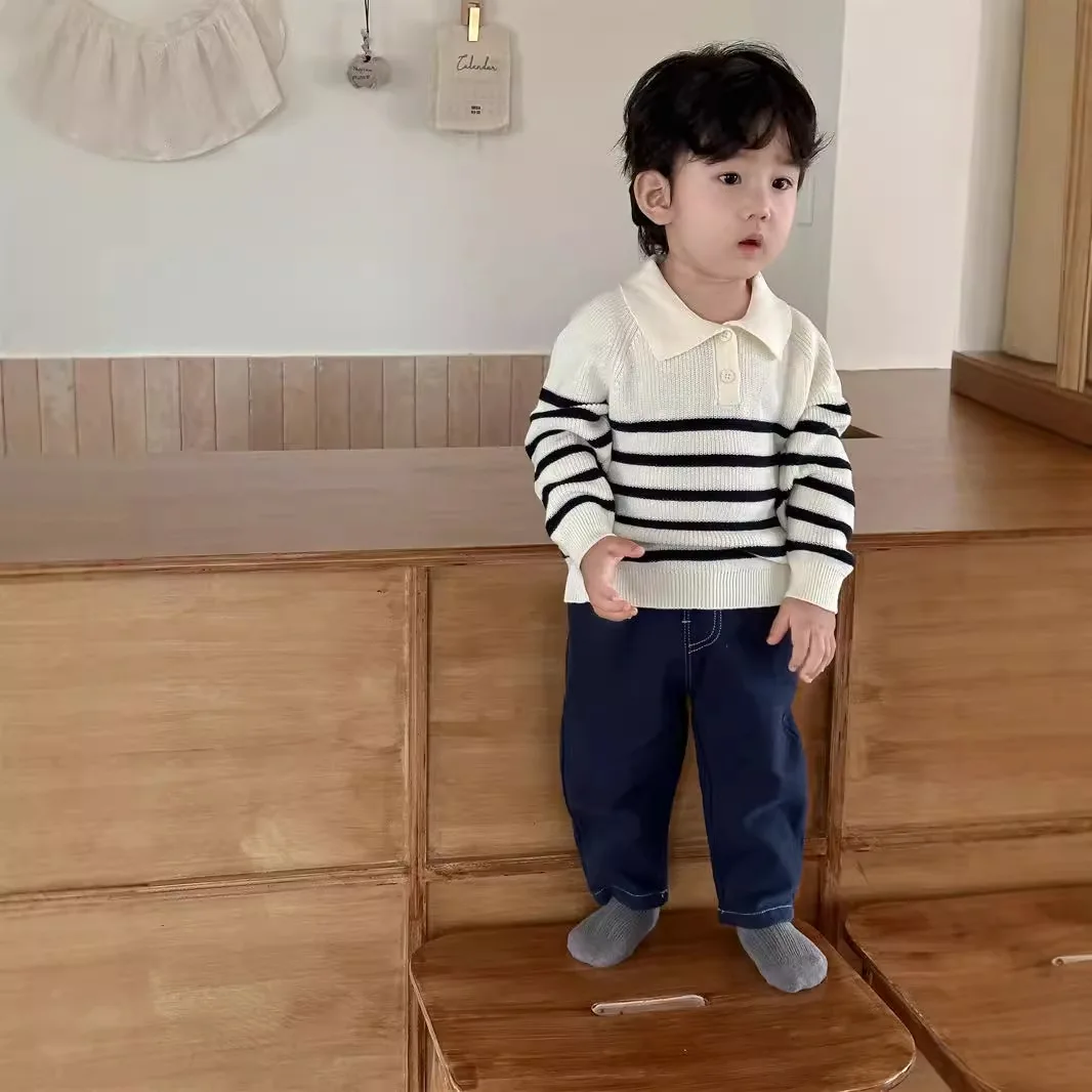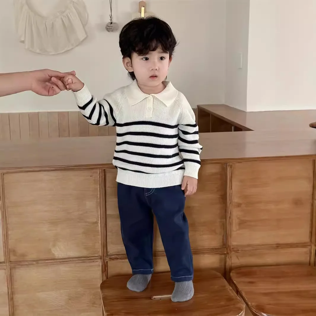 ベビートップス/パンツ ボーダーニット長袖ポロシャツ/シンプルデニムパンツジーンズ【mh0008313】