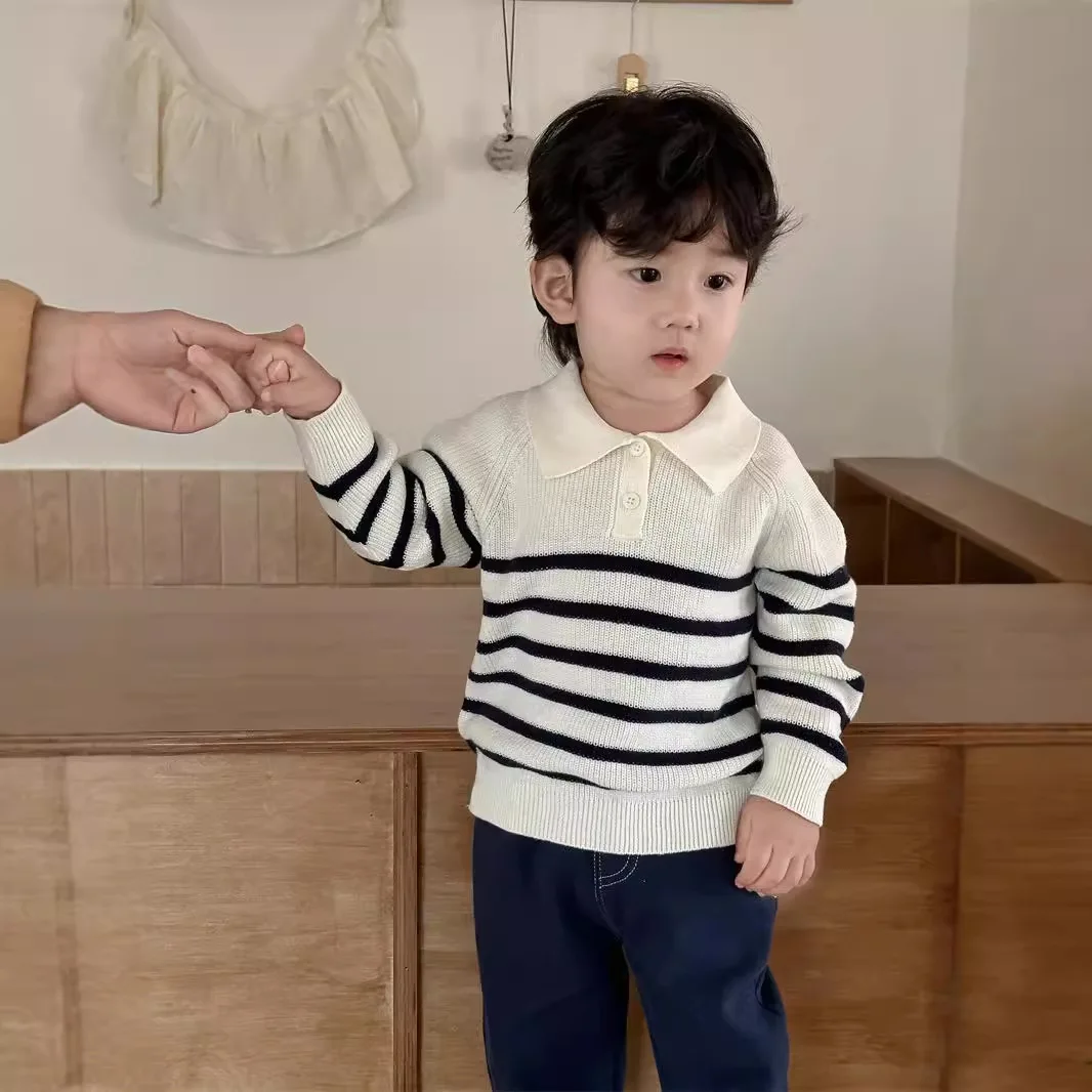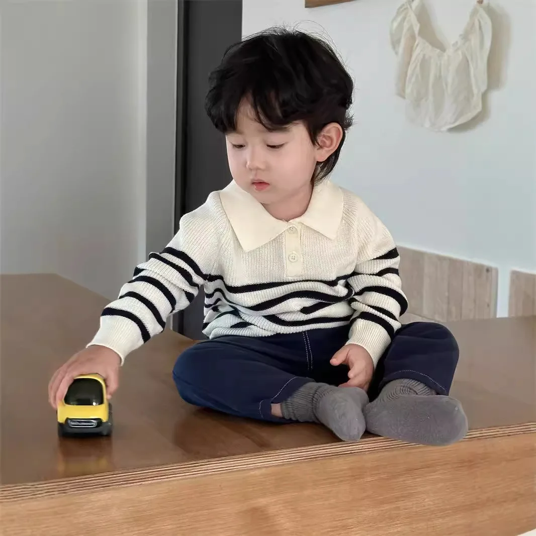 ボーダーニットの長袖ポロシャツとシンプルなデニムパンツの組み合わせは、赤ちゃんの日常にぴったりのカジュアルでスタイリッシュなコーディネートです。ポロシャツは柔らかなニット素材を使用し、心地よい着心地を提供します。ボーダー柄が目を引くデザインで、どんなスタイルにも合わせやすく、おしゃれさをプラスします。デニムパンツはシンプルでありながらも、タフな素材感が特徴で、日常のアクティブな動きにも対応。重ね着やアウターとの相性も良く、季節を問わず活躍する便利なアイテムです。