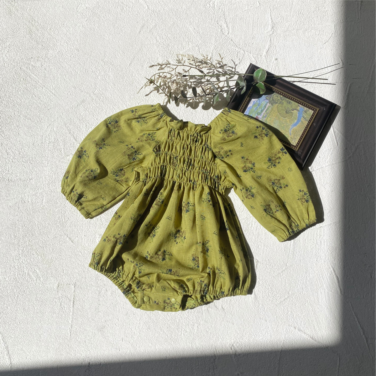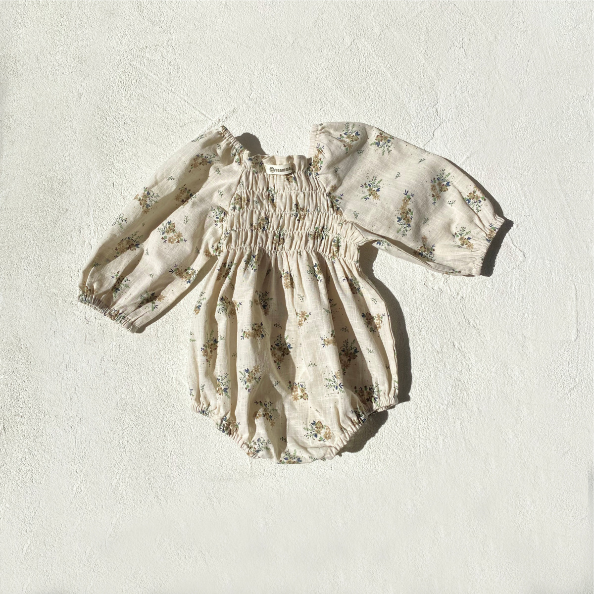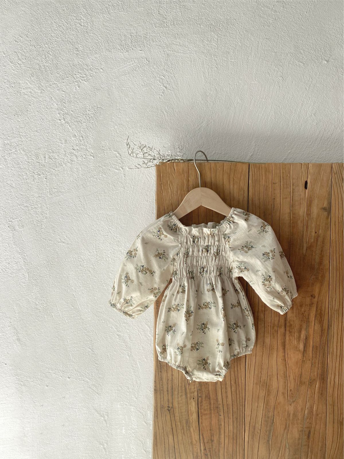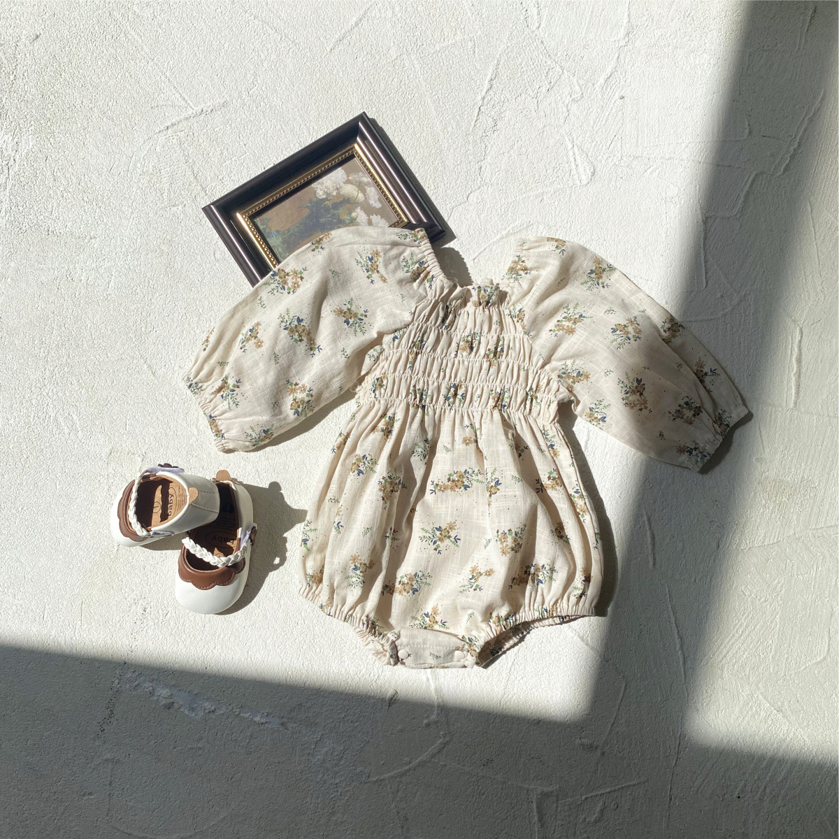 ベビーロンパース フラワープリント長袖パフスリーブスモックボディスーツ【mh0009039】