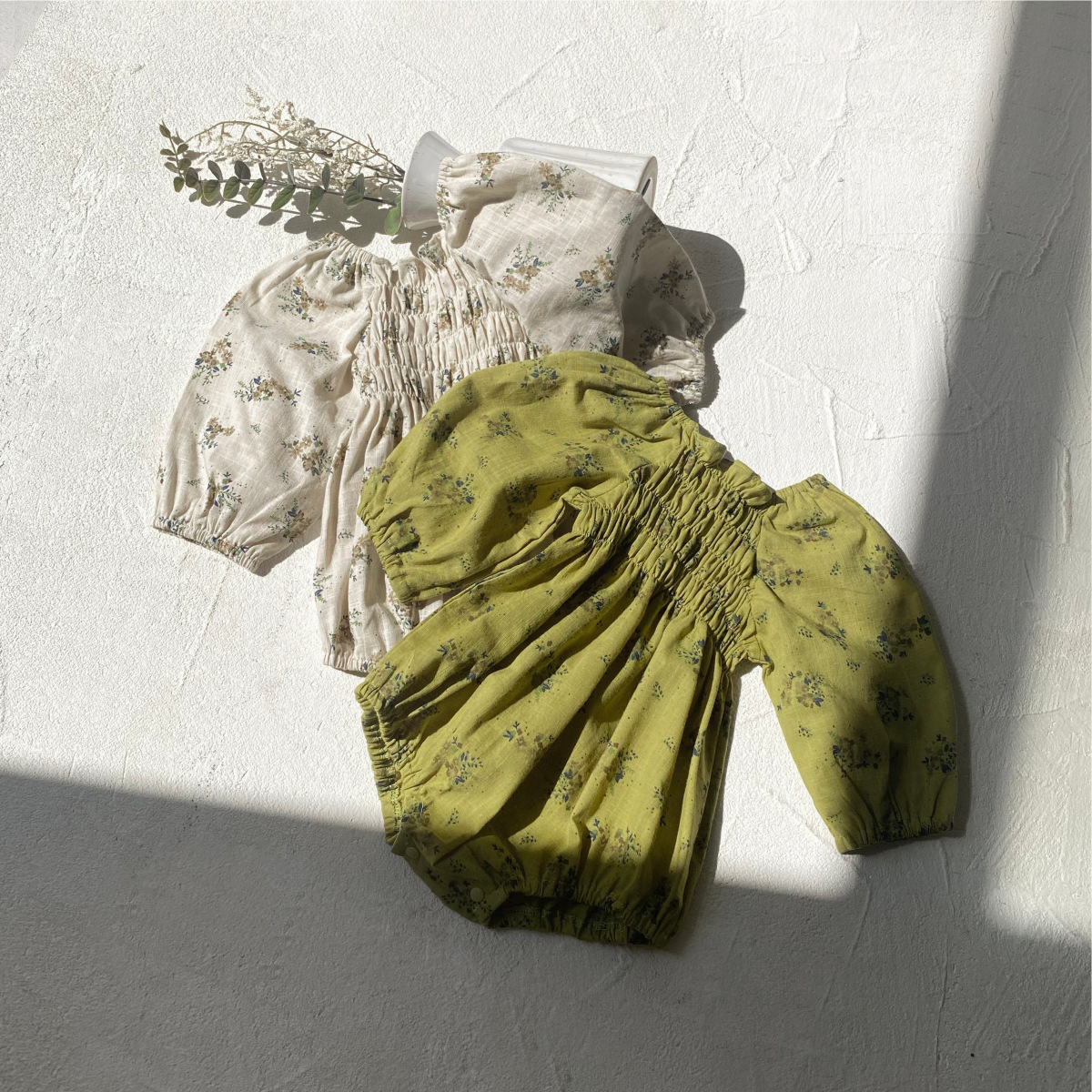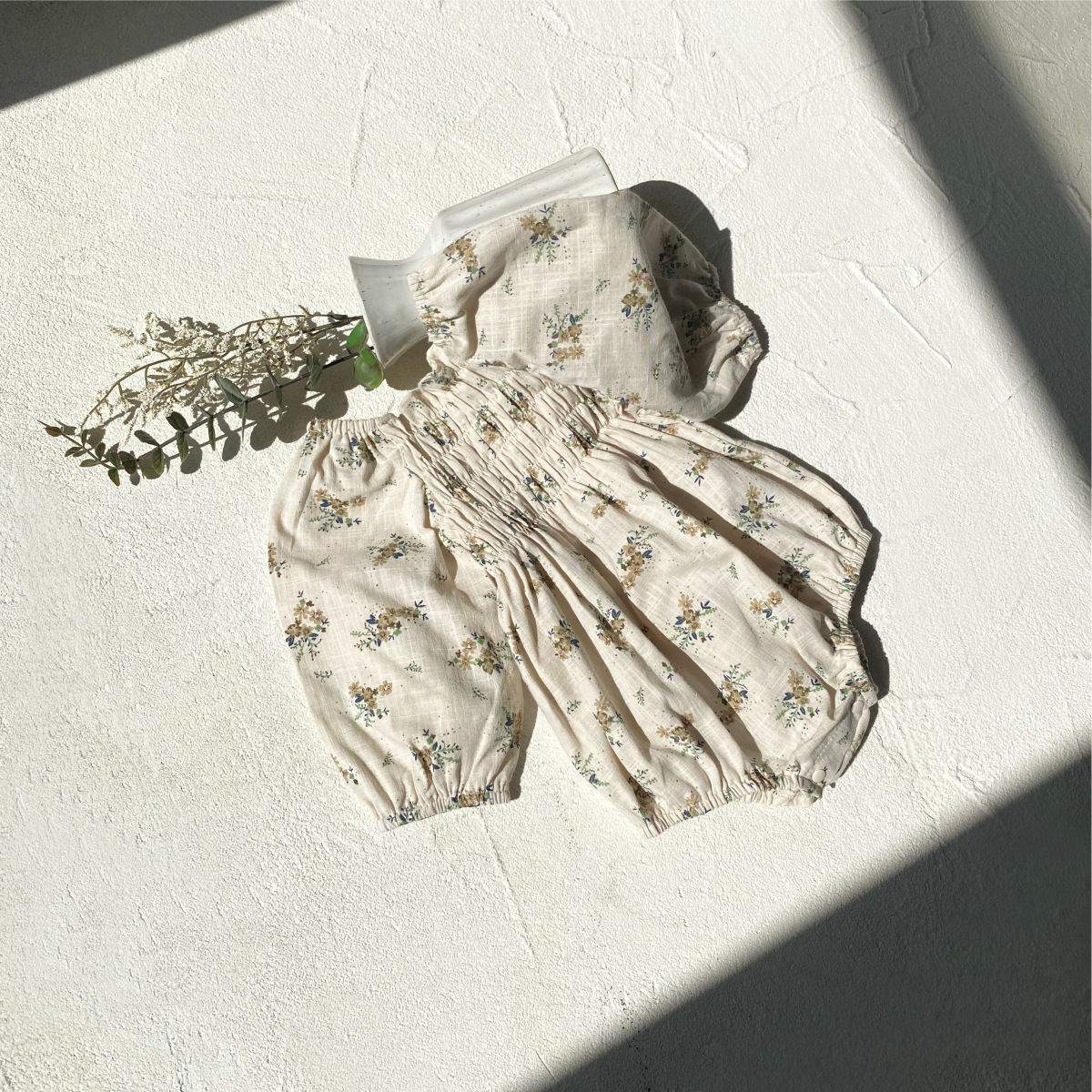 #ベビーロンパース #フラワープリント #パフスリーブ #スモックボディスーツ #赤ちゃん服 #可愛いコーデ