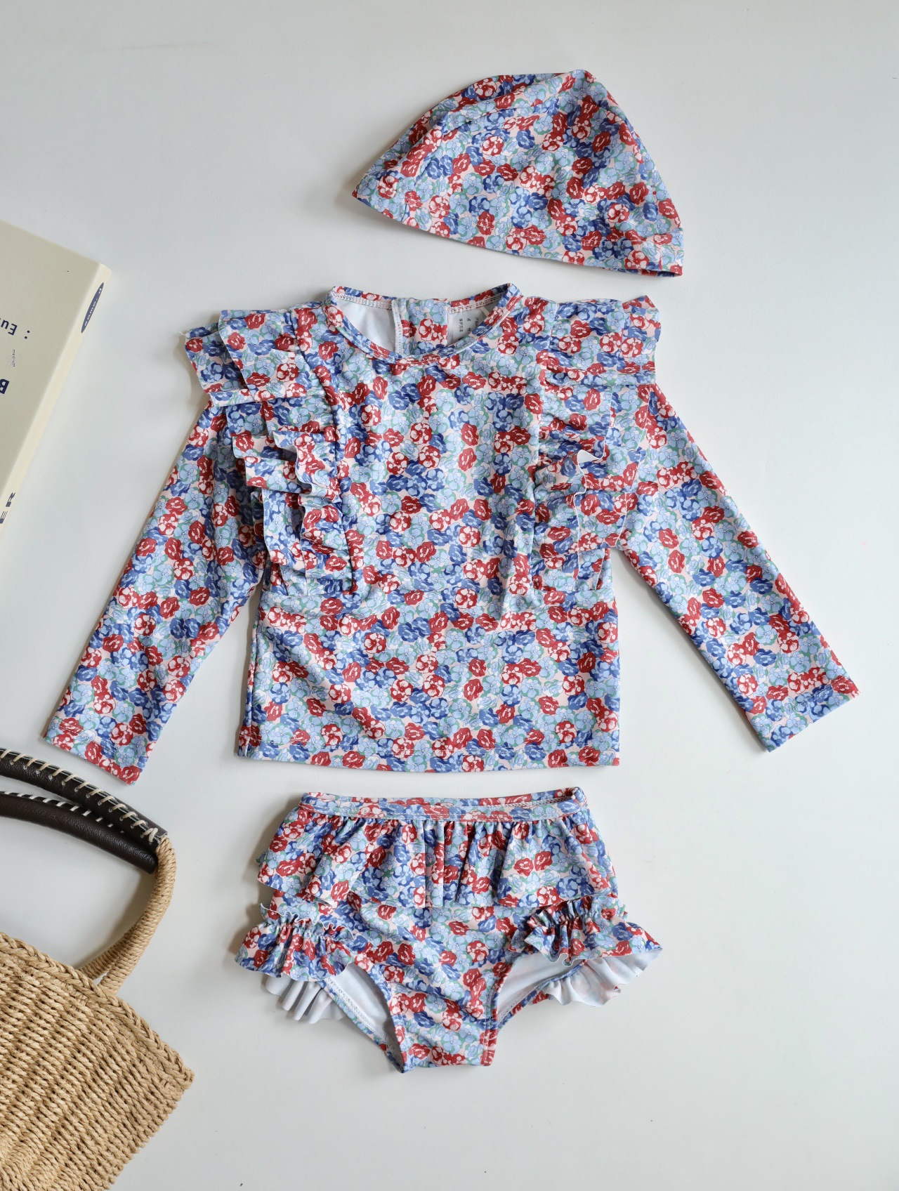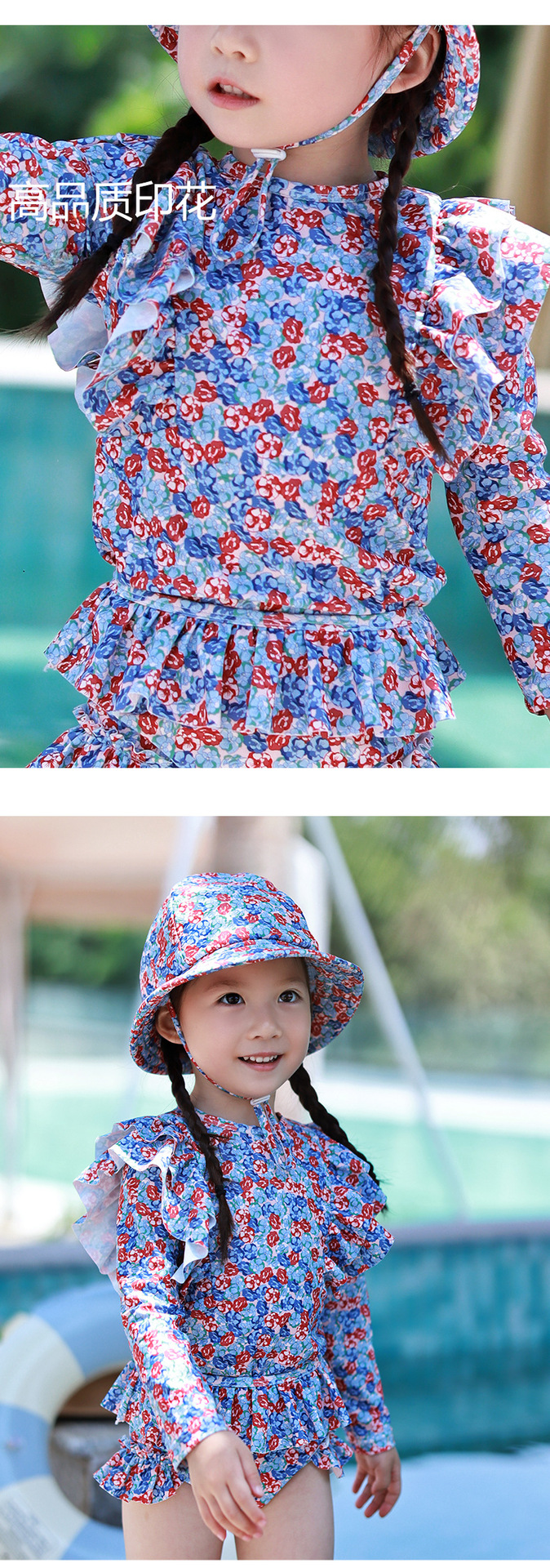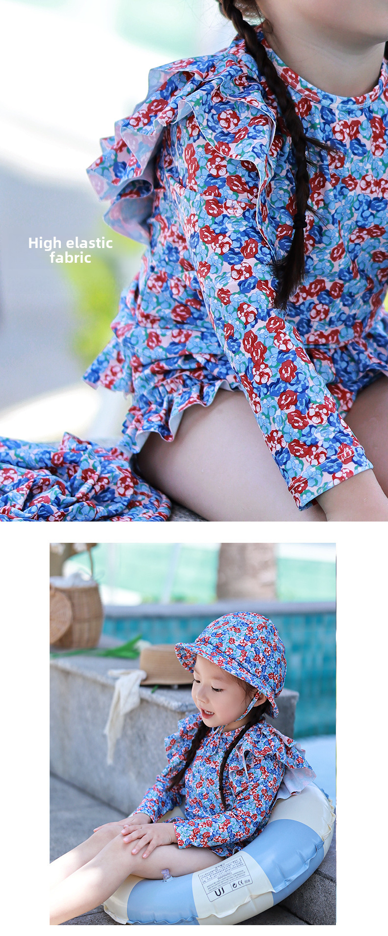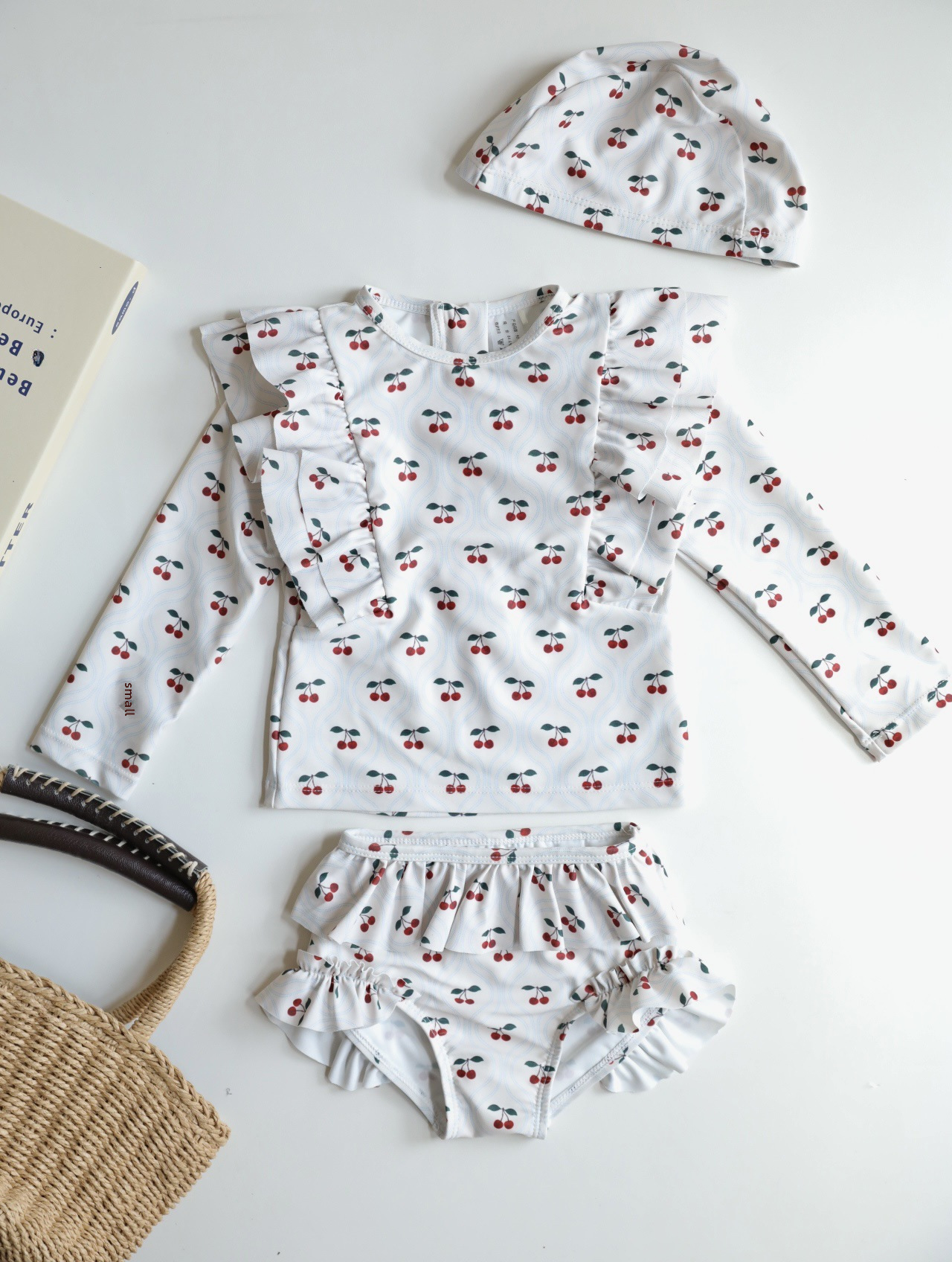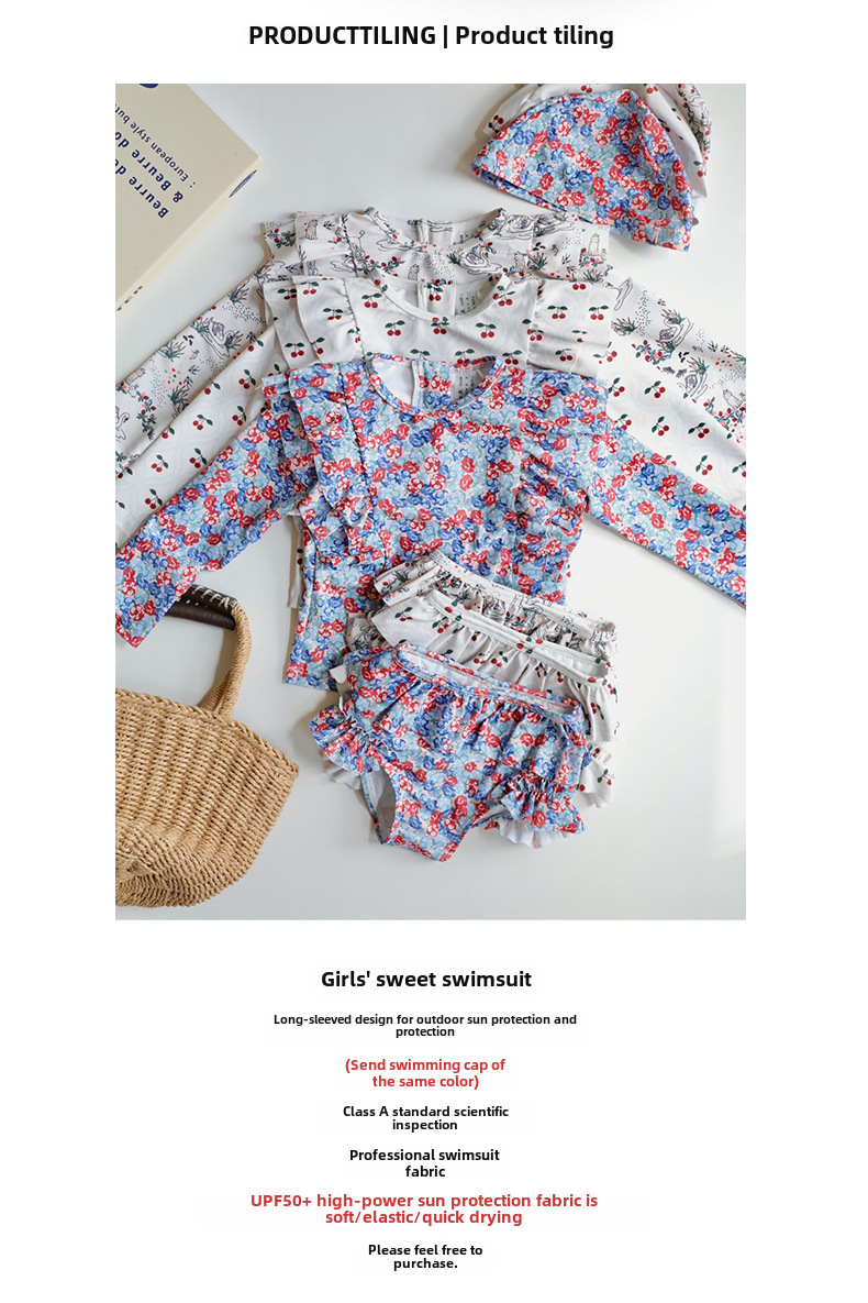 キッズ水着 ガールズ長袖セパレートフリルスイムウェア チェリー/フラワー 帽子セット【mh0009084】