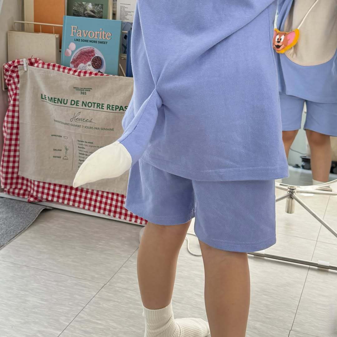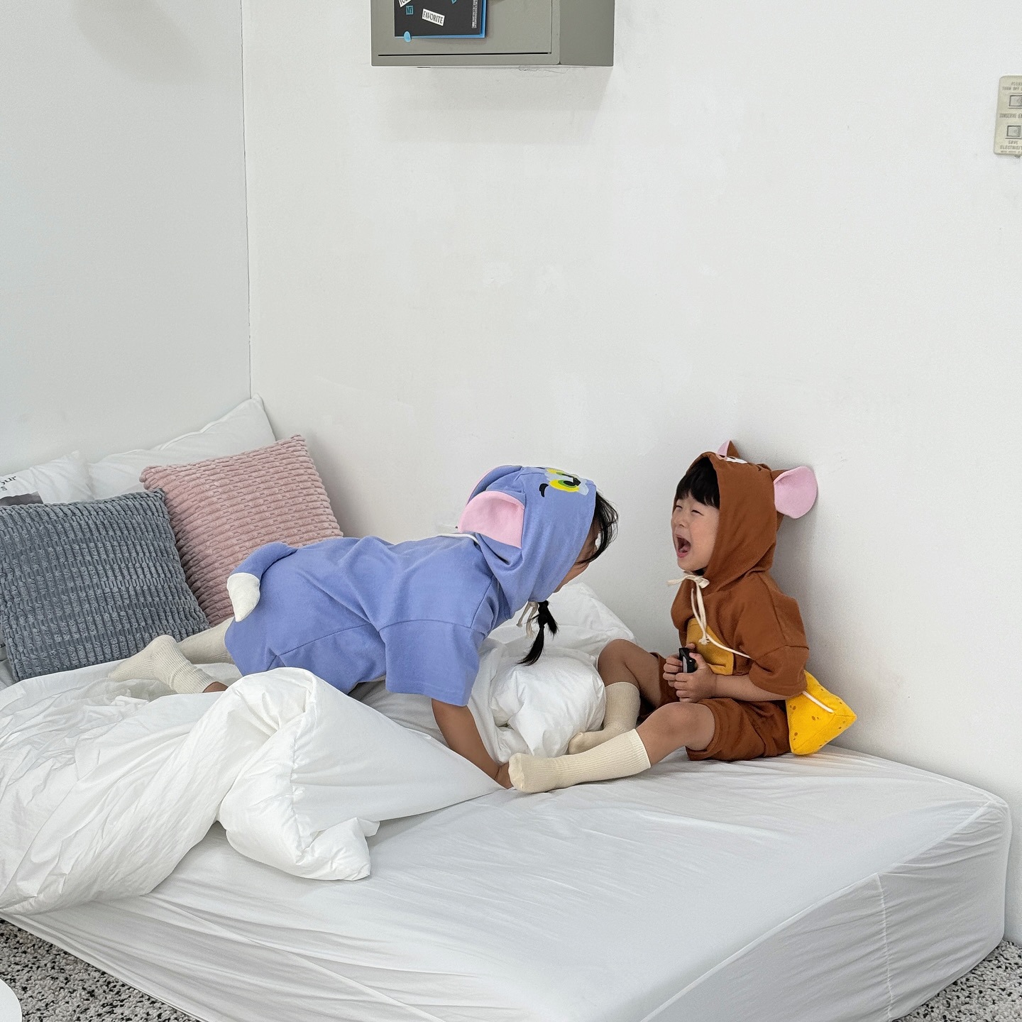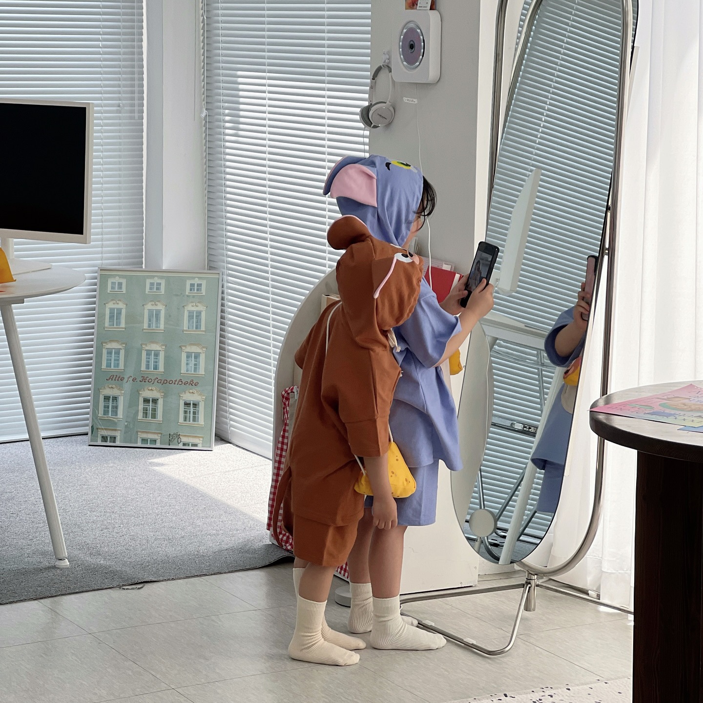 ねことネズミをイメージした、遊び心たっぷりのフーディ半袖トップス、ショートパンツ、ポシェットの3点セット。キャラクターらしいシルエットやカラーが可愛らしく、ポシェットがアクセントになった特別なデザインです。軽やかな素材で動きやすく、元気いっぱいのキッズにぴったり。イベントや写真撮影にも映えるセットアップで、楽しいおしゃれを楽しめます。