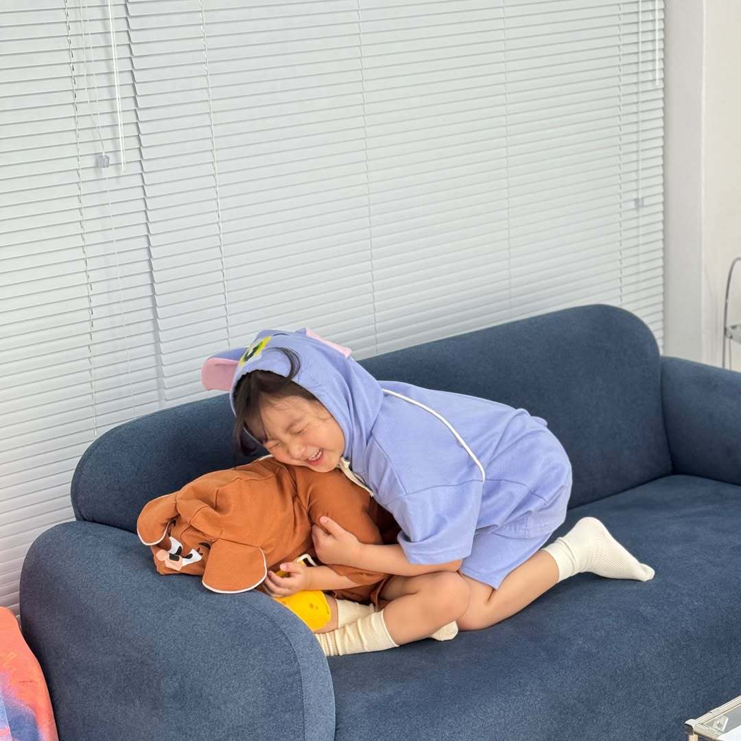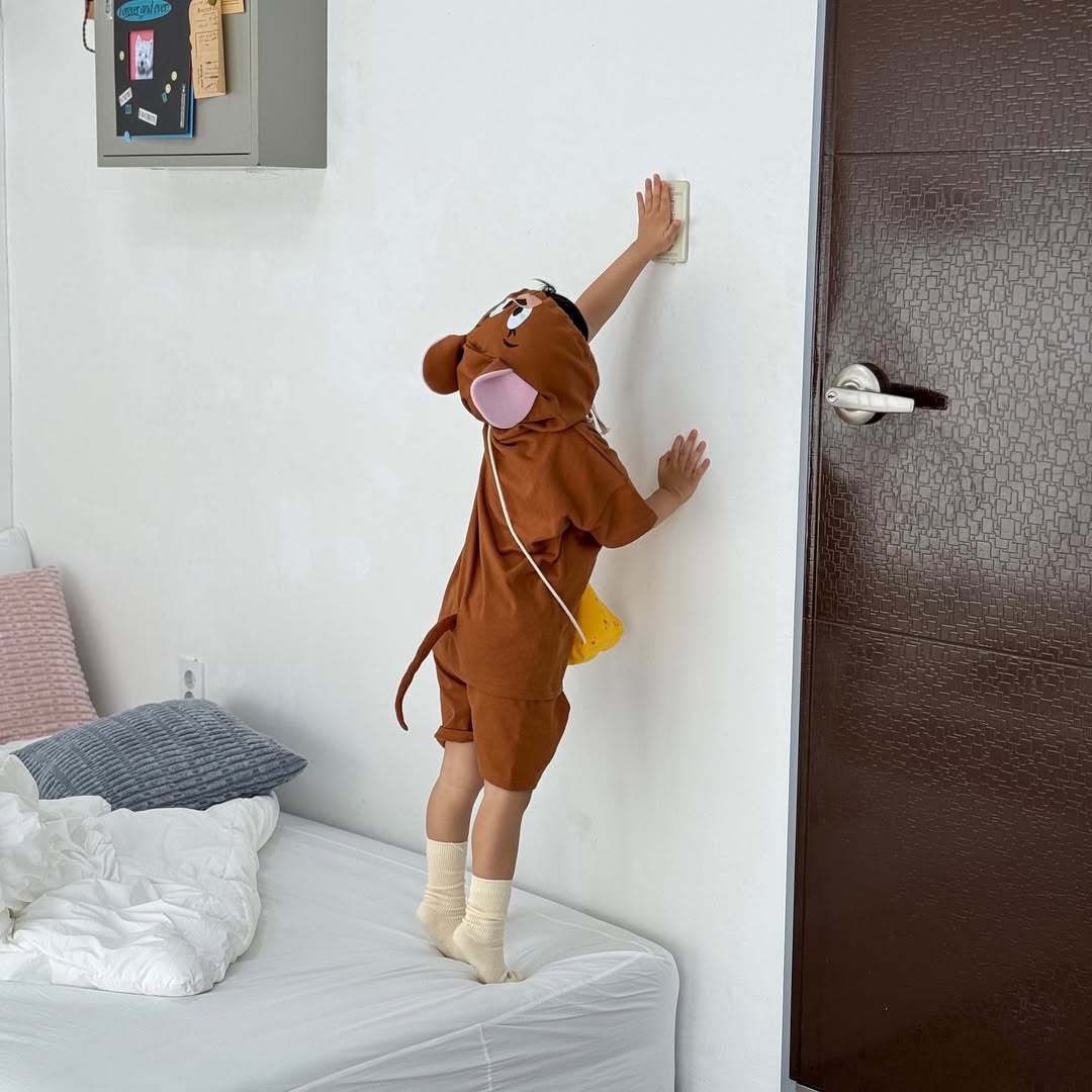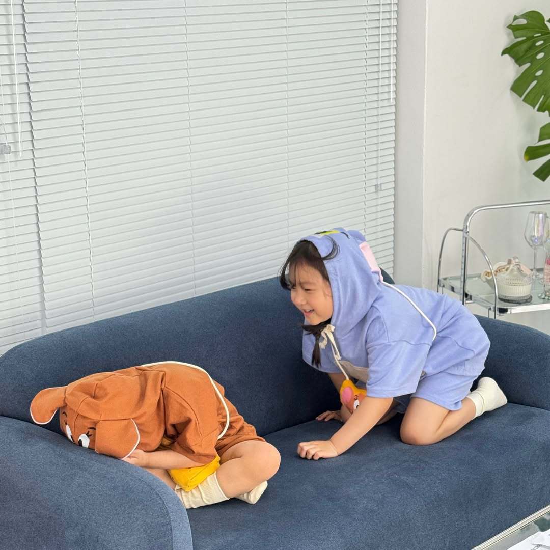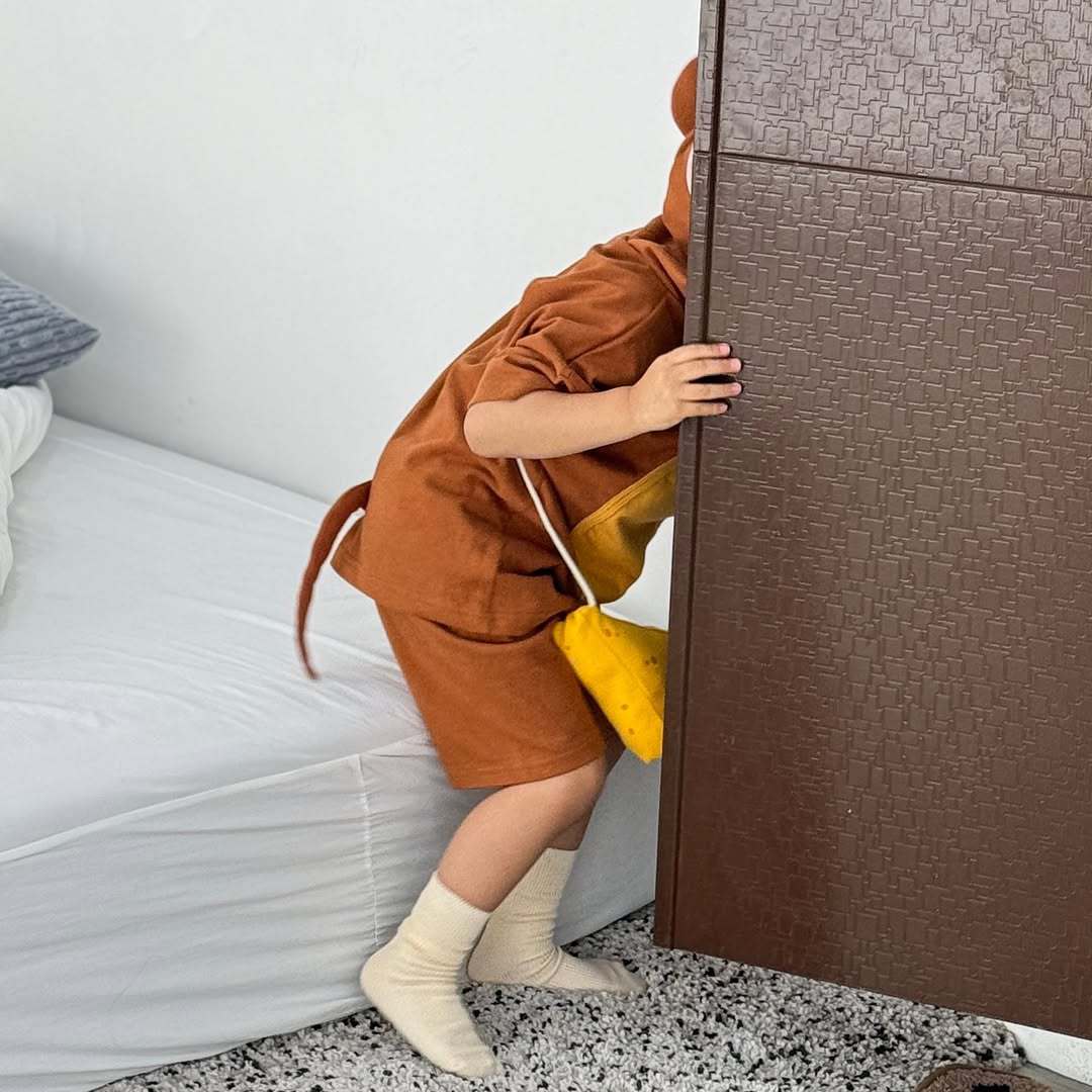 ねことネズミをイメージした、遊び心たっぷりのフーディ半袖トップス、ショートパンツ、ポシェットの3点セット。キャラクターらしいシルエットやカラーが可愛らしく、ポシェットがアクセントになった特別なデザインです。軽やかな素材で動きやすく、元気いっぱいのキッズにぴったり。イベントや写真撮影にも映えるセットアップで、楽しいおしゃれを楽しめます。