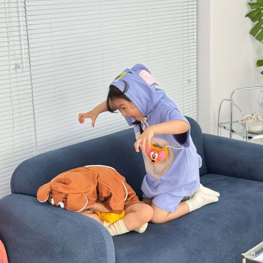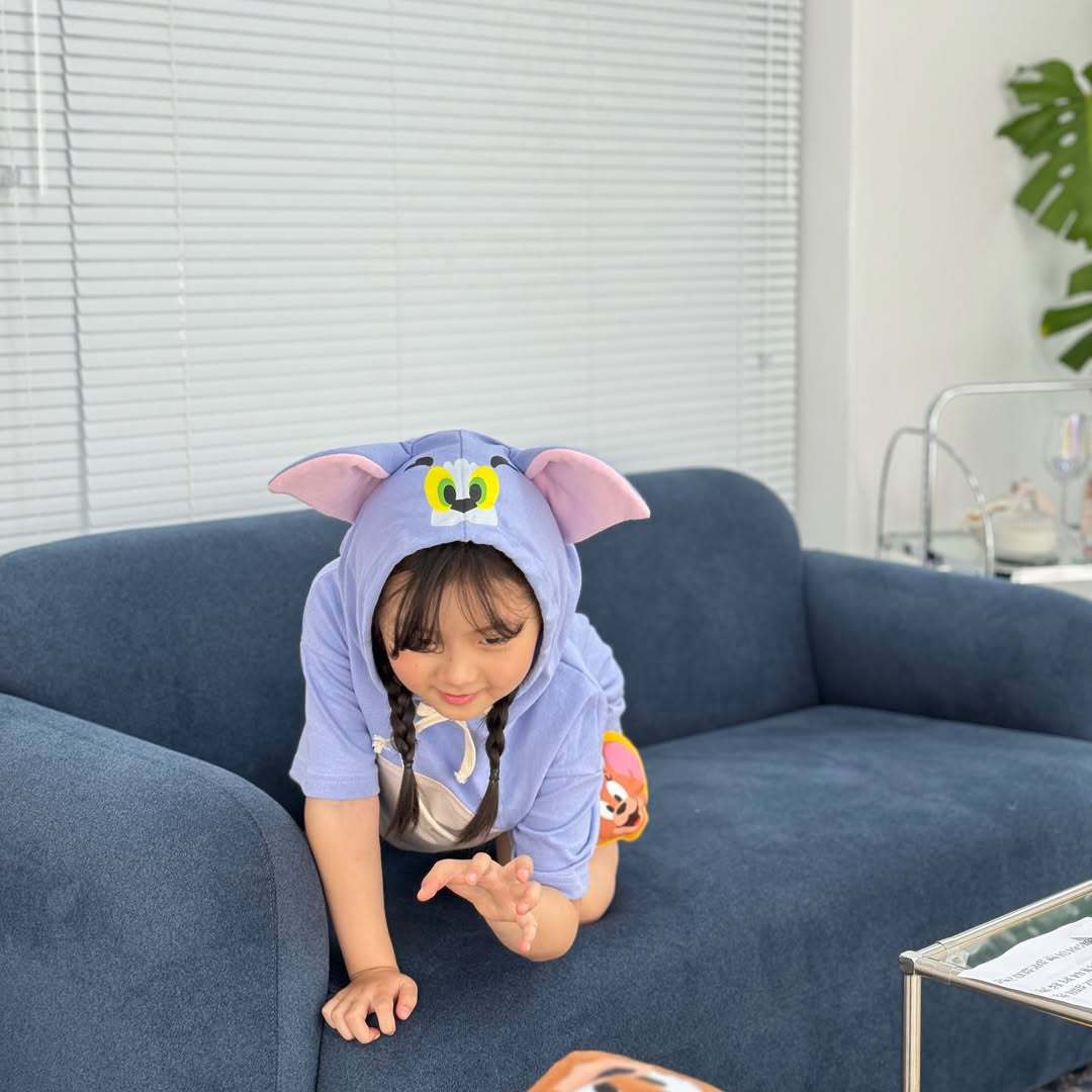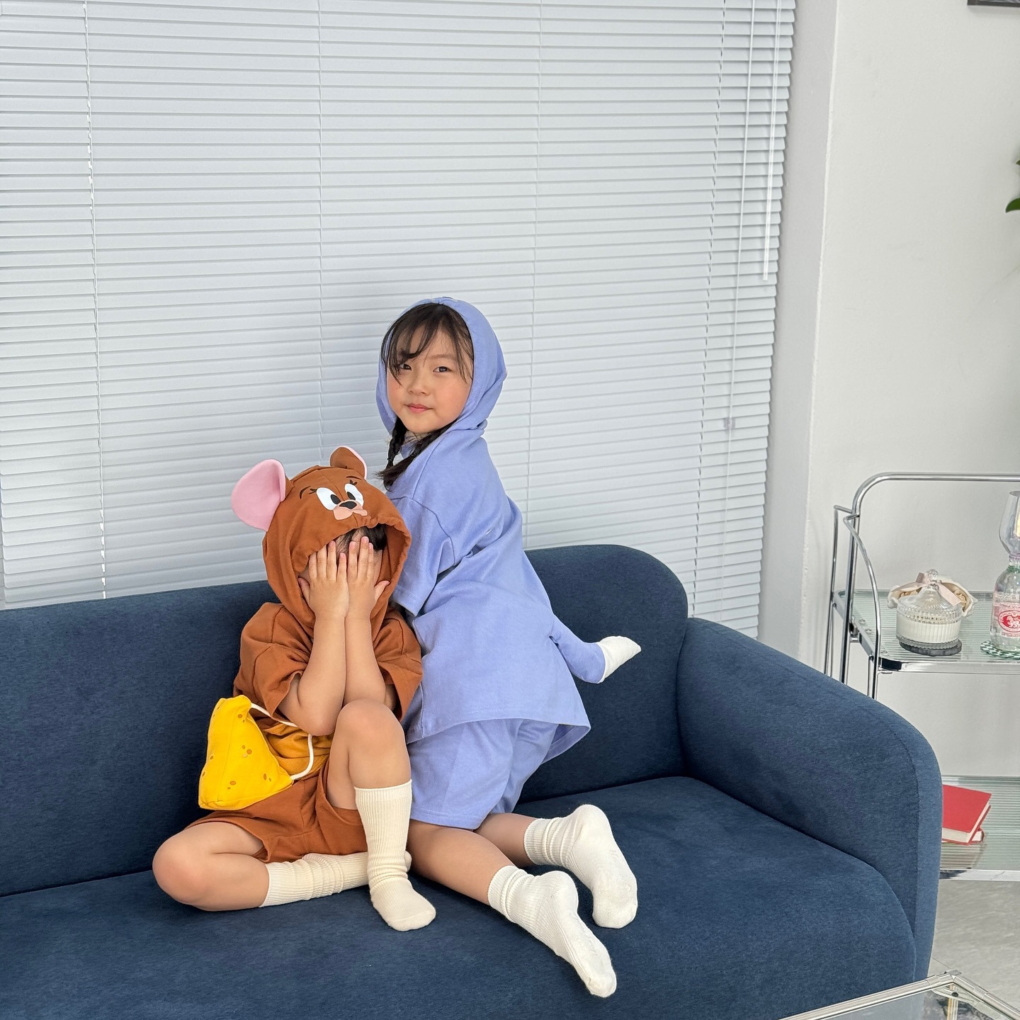 ベビーキッズセットアップ 3点セット ねこネズミフーディ半袖トップス+ショートパンツ+ポシェット トムとジェリーコスチューム【mh0009086】