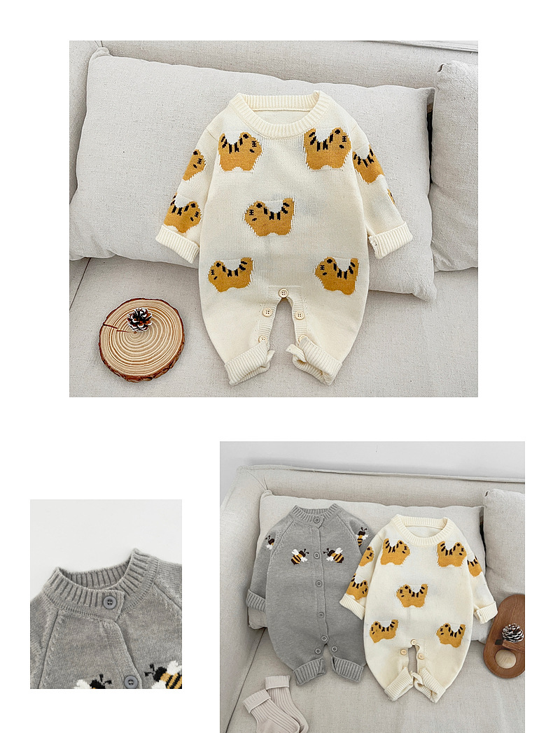 ハチ(Bee)刺繍が施されたニット長袖ロンパースです。柔らかなニット素材を使用しており、赤ちゃんの肌に優しく、快適な着心地を提供します。可愛らしいハチの刺繍がポイントとなり、シンプルながらもおしゃれな印象を与えます。ゆったりとしたシルエットで動きやすく、股部分にはスナップボタンが付いているため、おむつ替えもスムーズです。寒い季節のお出かけやお部屋着にぴったりの一着で、愛らしさを引き立てるアイテムです。