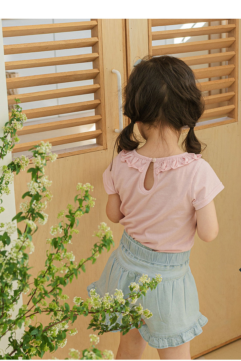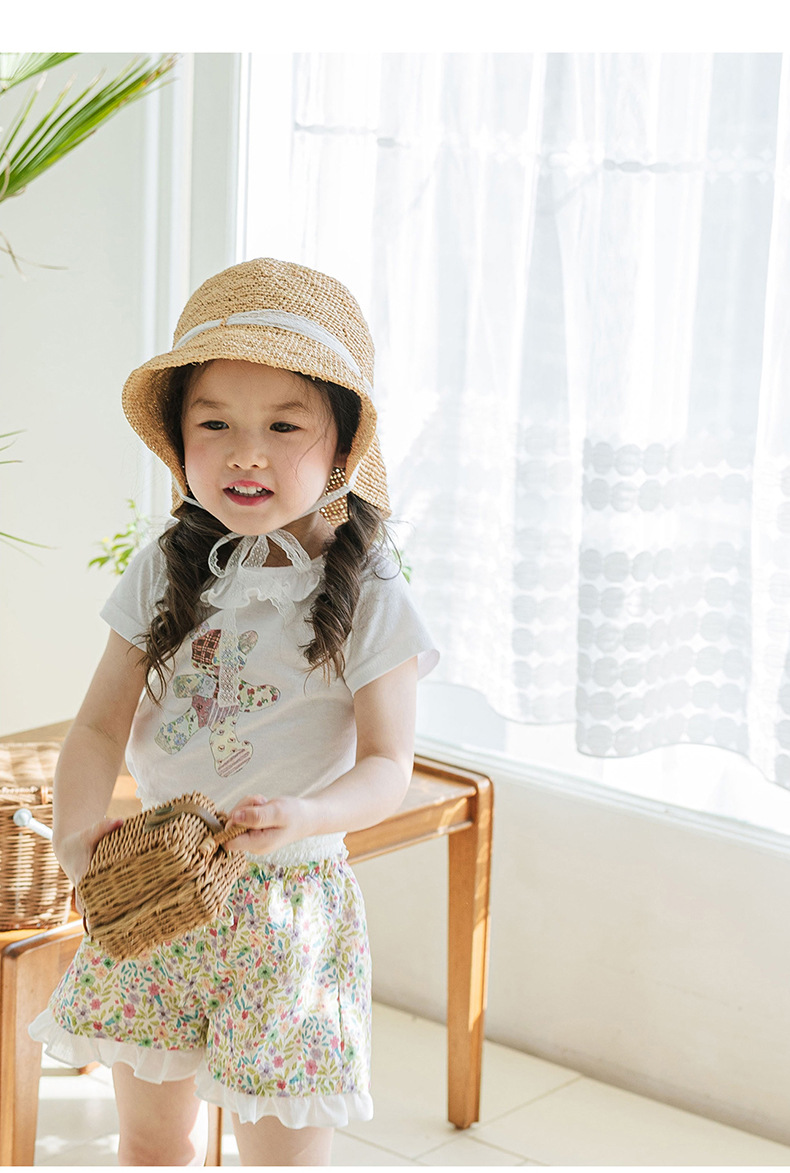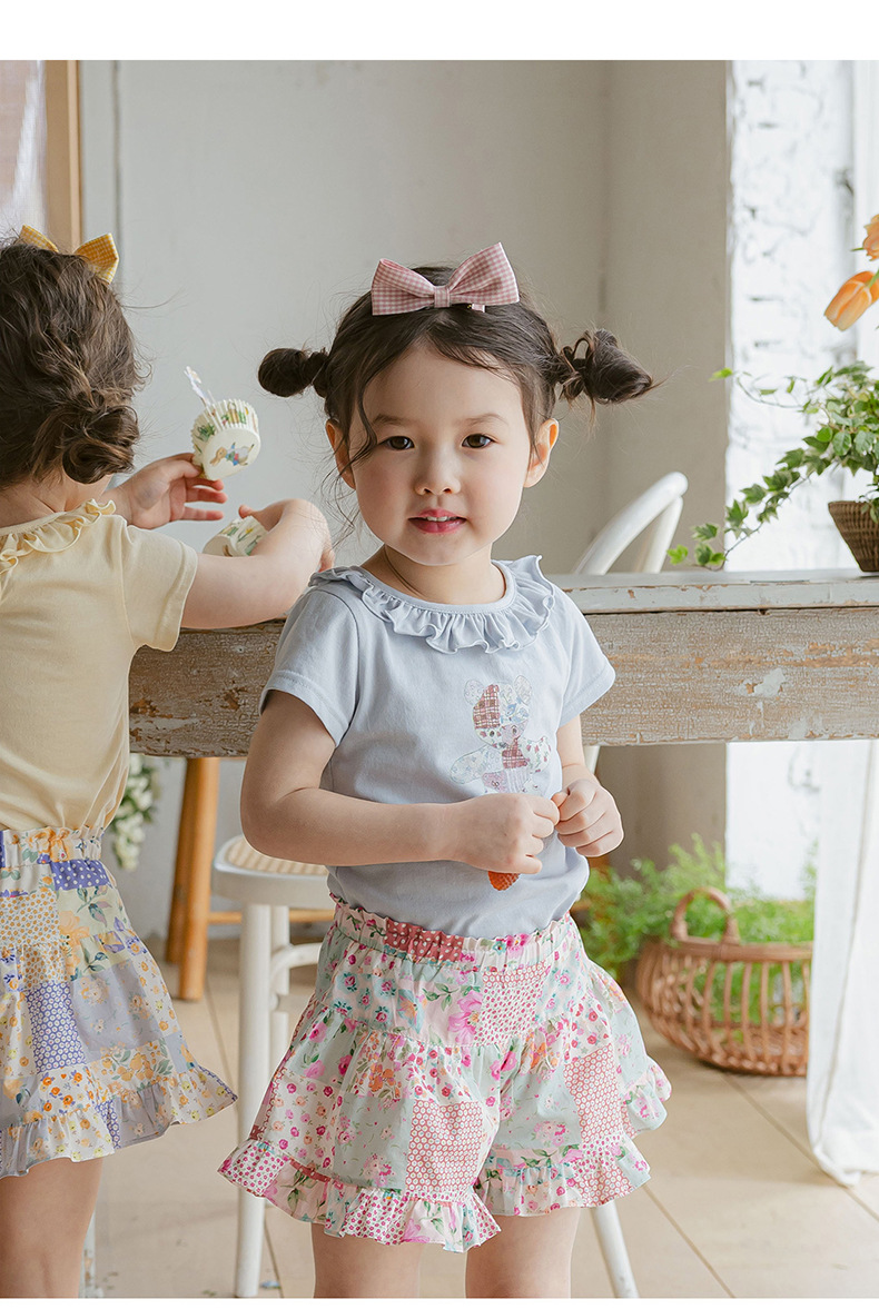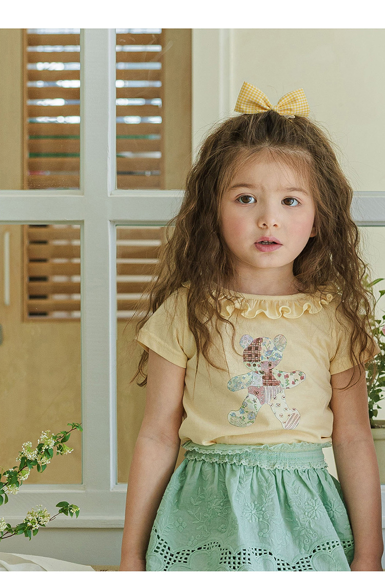 ふんわりとしたラッフルフリルがあしらわれた襟元と、愛らしいくまのプリントがポイントのキッズ用半袖Tシャツです。柔らかなコットン素材を使用しており、お子様のデリケートな肌にも優しい肌触り。伸縮性のある生地で、活発な動きにも対応します。クルーネックのデザインで、普段使いにぴったり。可愛らしさと着心地の良さを兼ね備えた一枚です。
