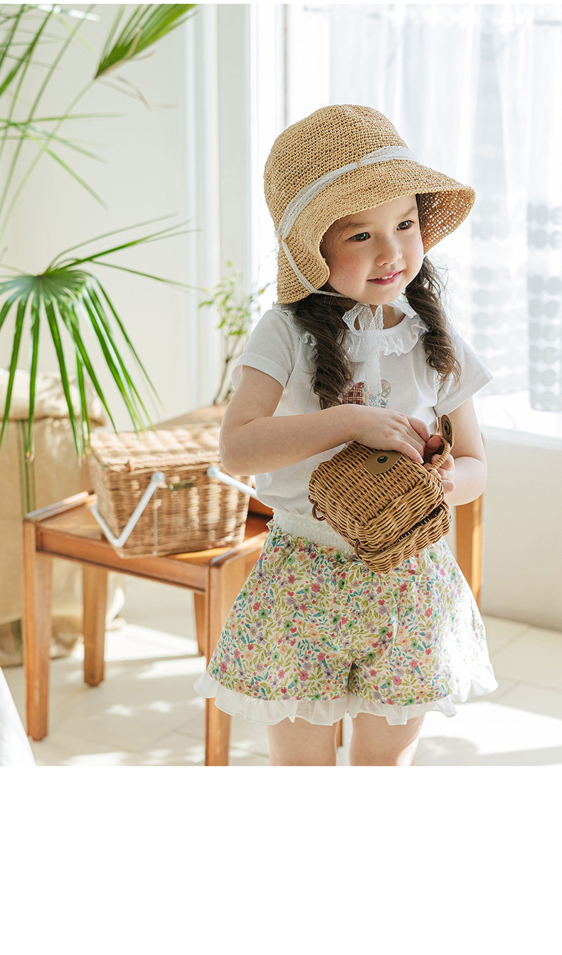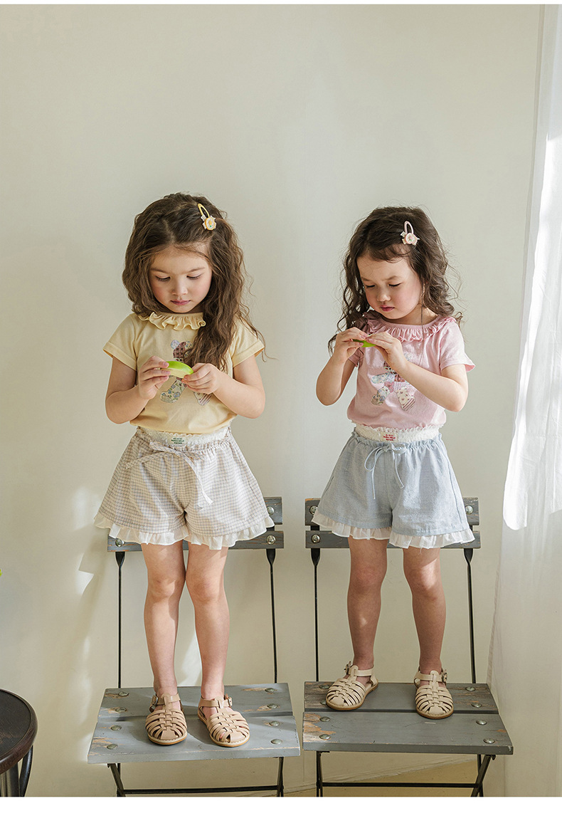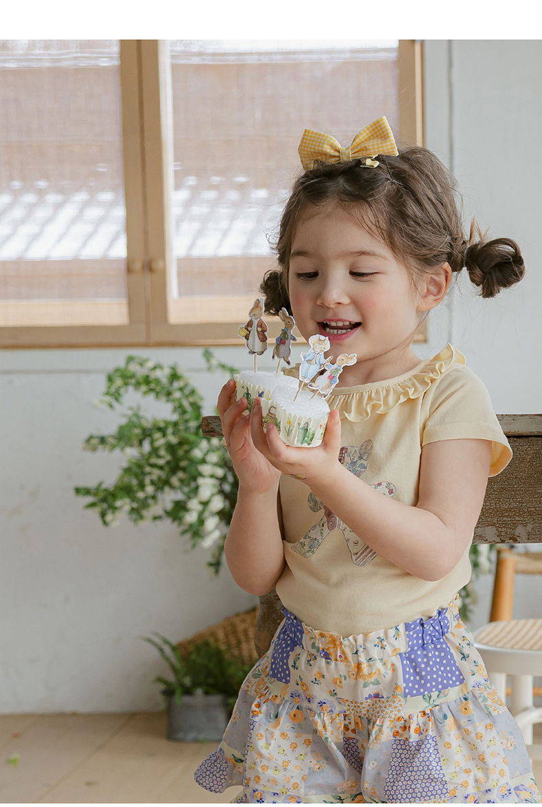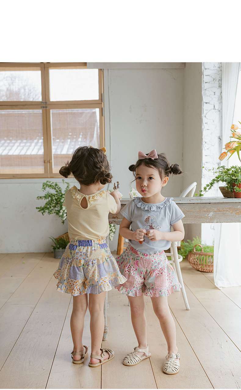 ふんわりとしたラッフルフリルがあしらわれた襟元と、愛らしいくまのプリントがポイントのキッズ用半袖Tシャツです。柔らかなコットン素材を使用しており、お子様のデリケートな肌にも優しい肌触り。伸縮性のある生地で、活発な動きにも対応します。クルーネックのデザインで、普段使いにぴったり。可愛らしさと着心地の良さを兼ね備えた一枚です。