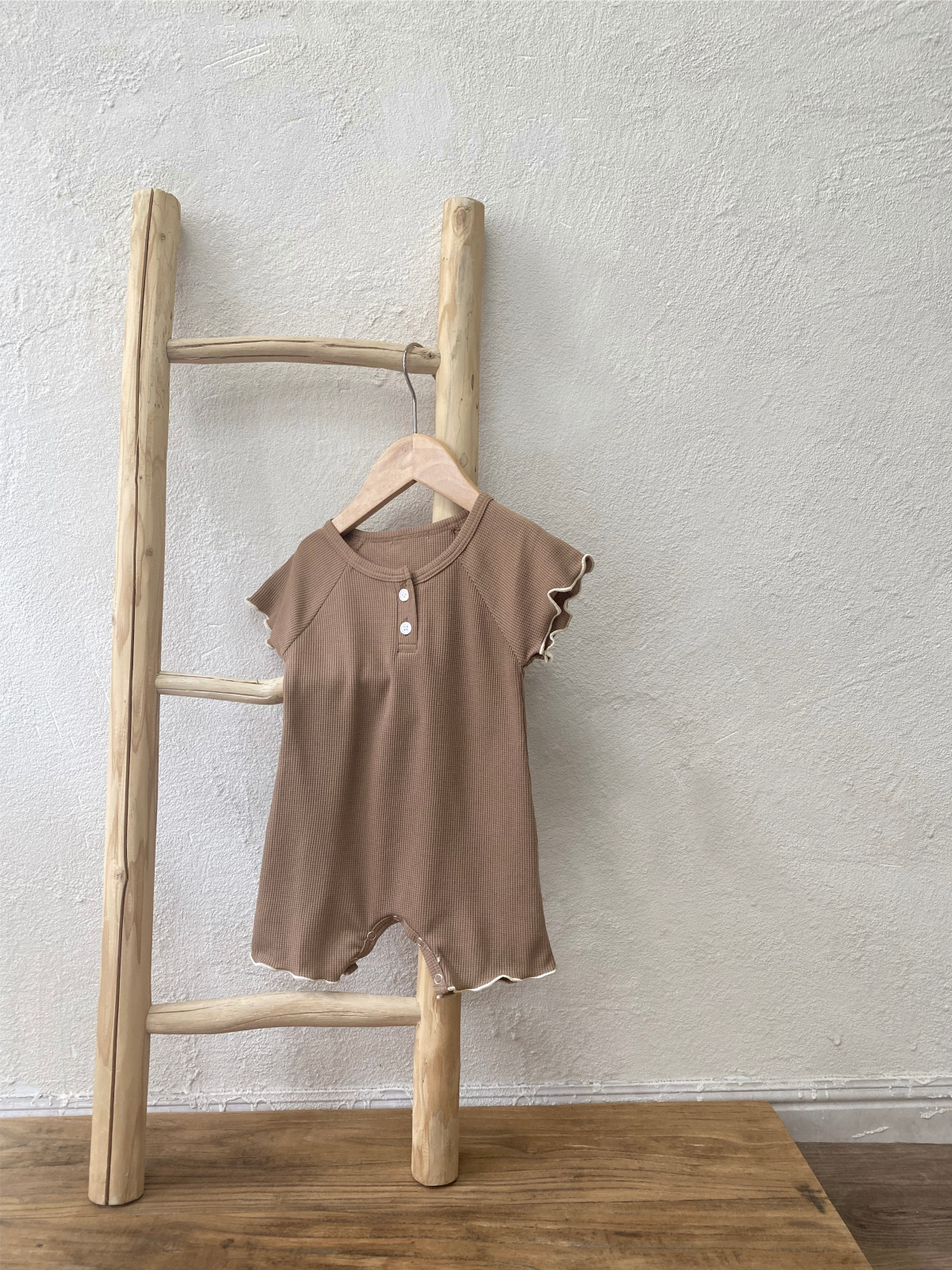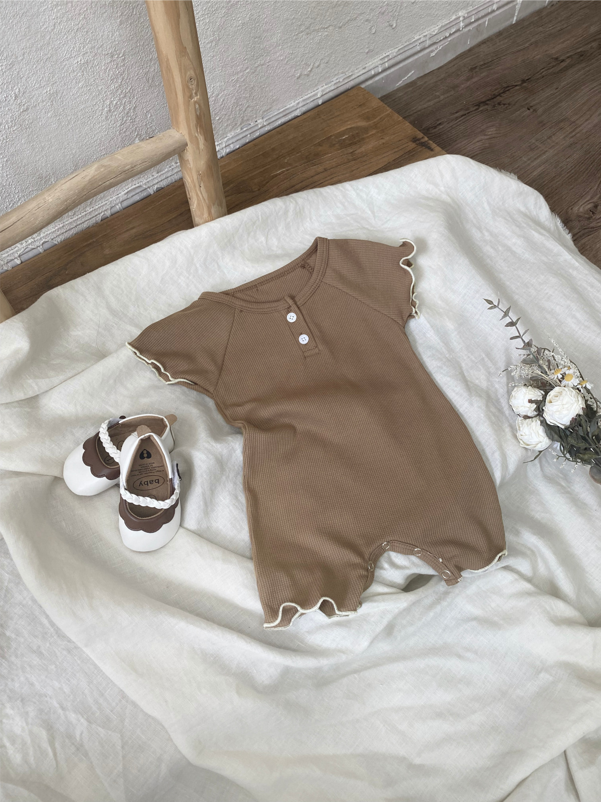 メロウフリルが可愛らしいメロウフリル半袖ロンパースです。波打つようなメロウ加工が施された袖口や裾が、デザインのアクセントになっています。柔らかなワッフル素材の肌触りが心地よく、赤ちゃんが快適に過ごせます。