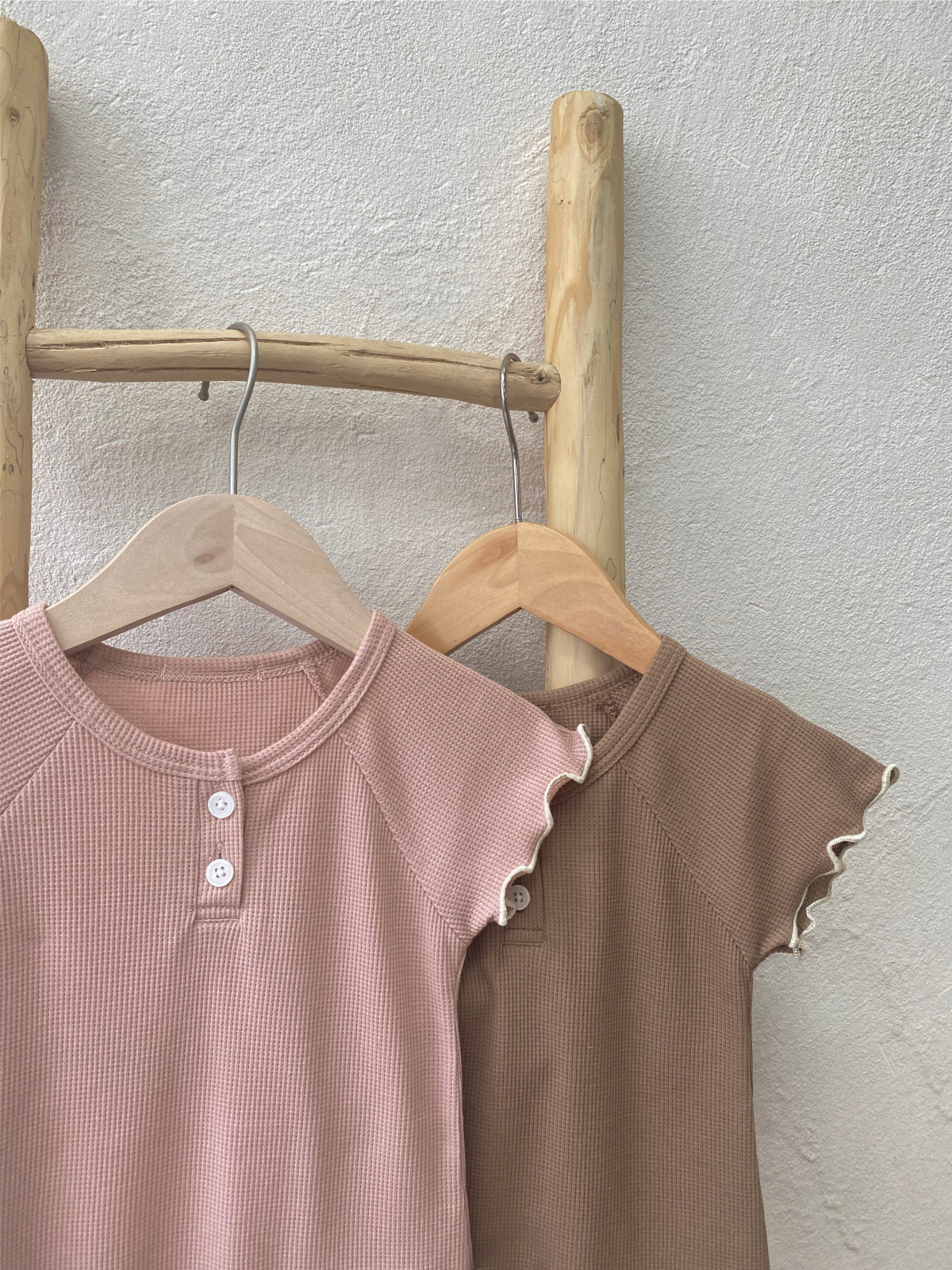 Aクラスのワッフル生地で仕立てられているため、通気性も抜群で、暑い夏でも赤ちゃんが快適に過ごせるように配慮しました。股下はスナップボタンで開閉できるので、おむつ替えも簡単です。1歳から3歳頃までの女の子にぴったりのサイズ感で、普段使いからちょっとしたお出かけまで幅広く活躍します。このロンパースは、赤ちゃんの夏の日常に快適さと可愛らしさを添える一着です。
