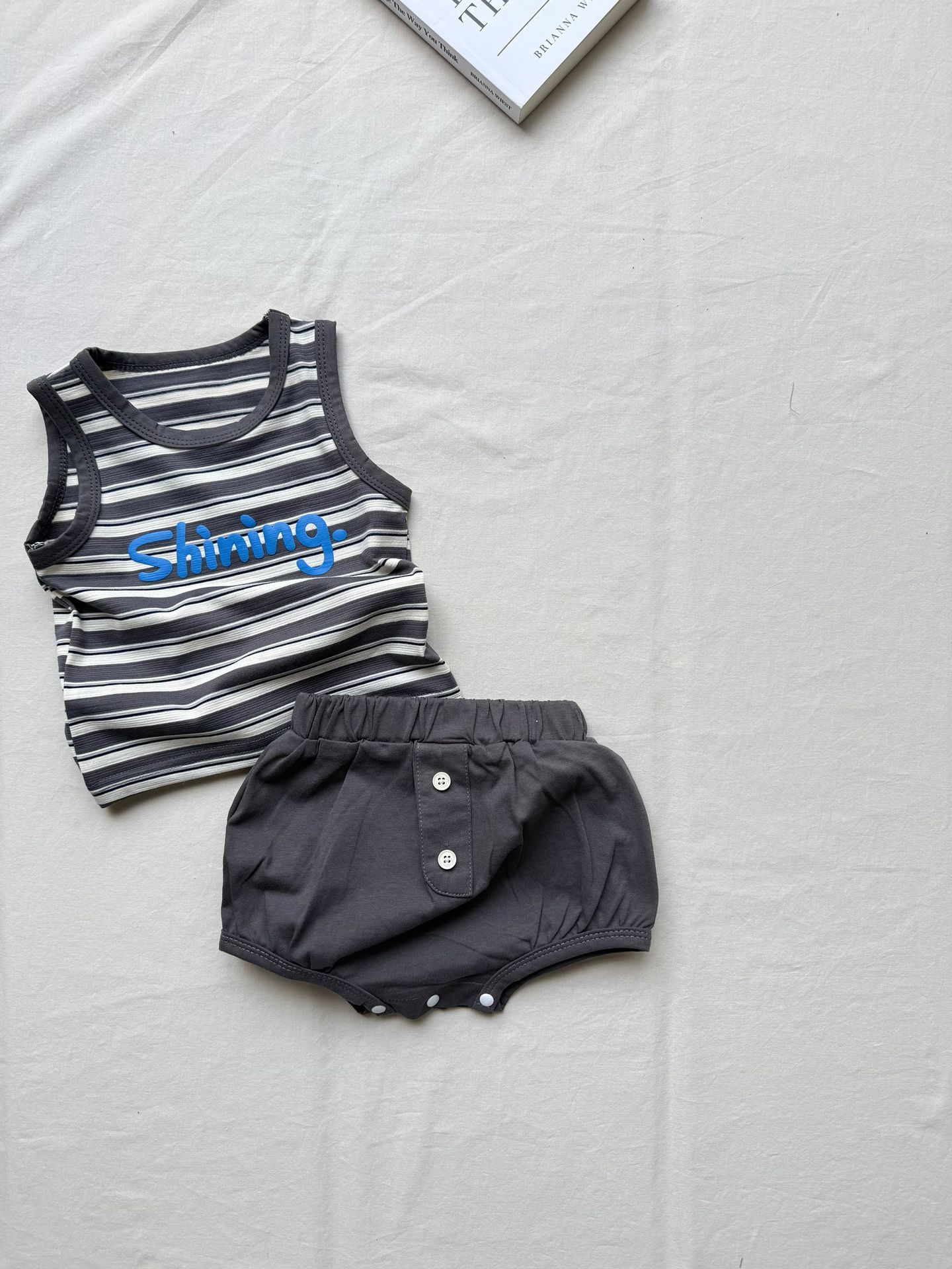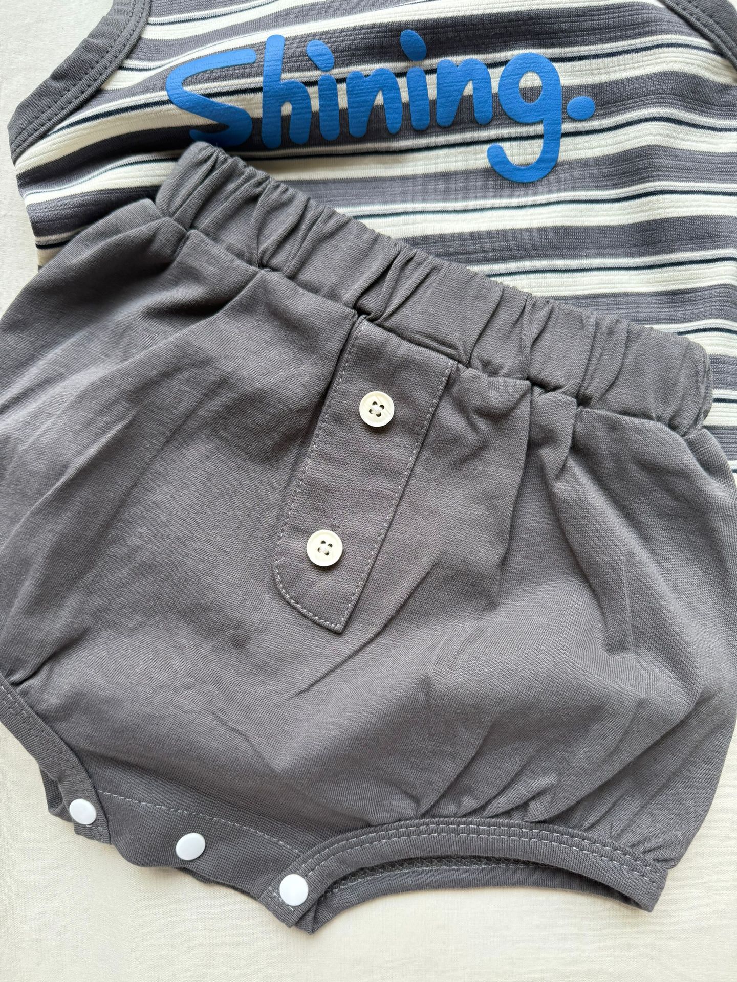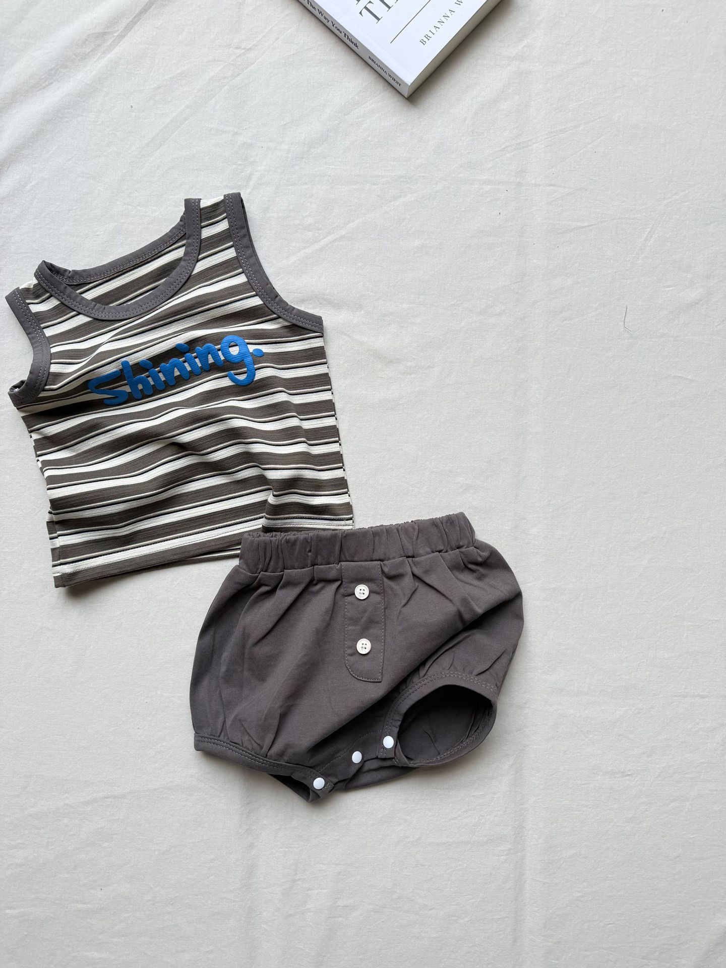 肌触りの良い素材で、暑い夏でもお子さんは快適に過ごせます。トップスは、爽やかな幅広ボーダー柄のタンクトップ。ボトムスのブルマパンツは、ゆったりとしたシルエットで動きやすく、おむつの上からでもすっきりと着こなせます。セットで着れば、統一感のあるカジュアルコーディネートが完成します。もちろん、それぞれ単品でも着回しが楽しめ、男の子にも女の子にもおすすめの万能アイテムです。