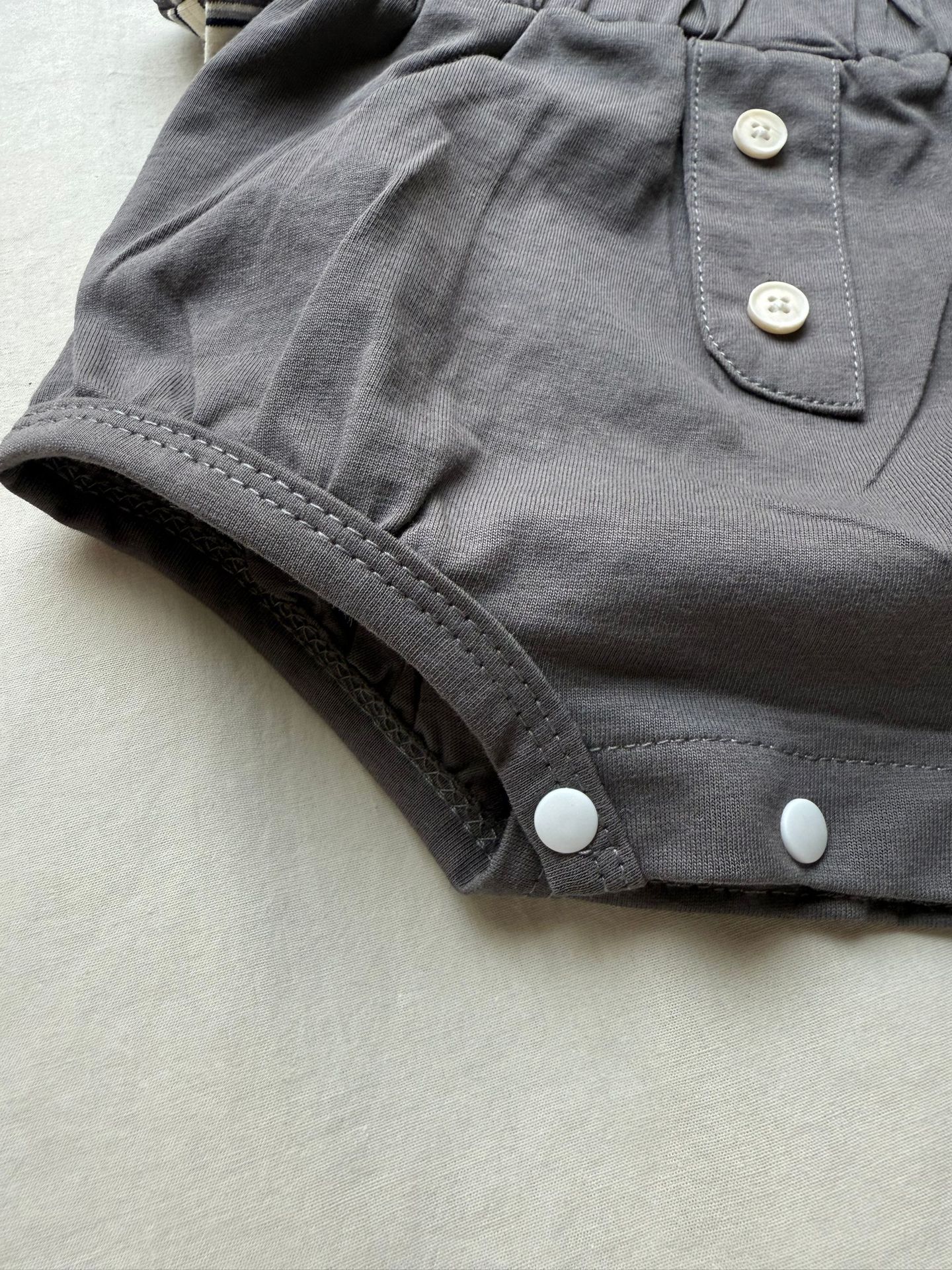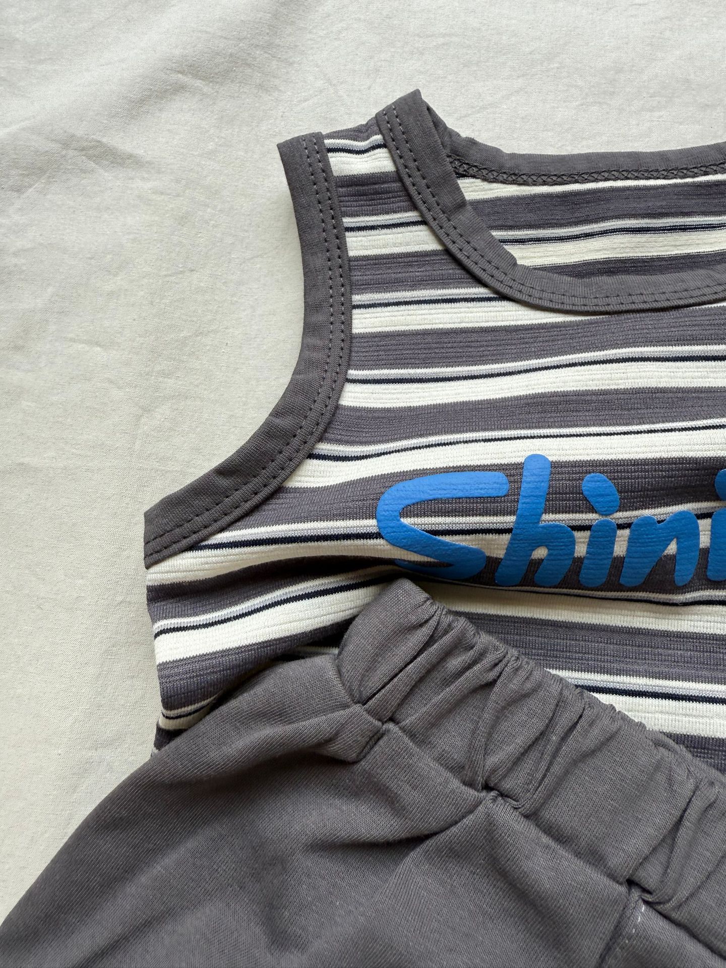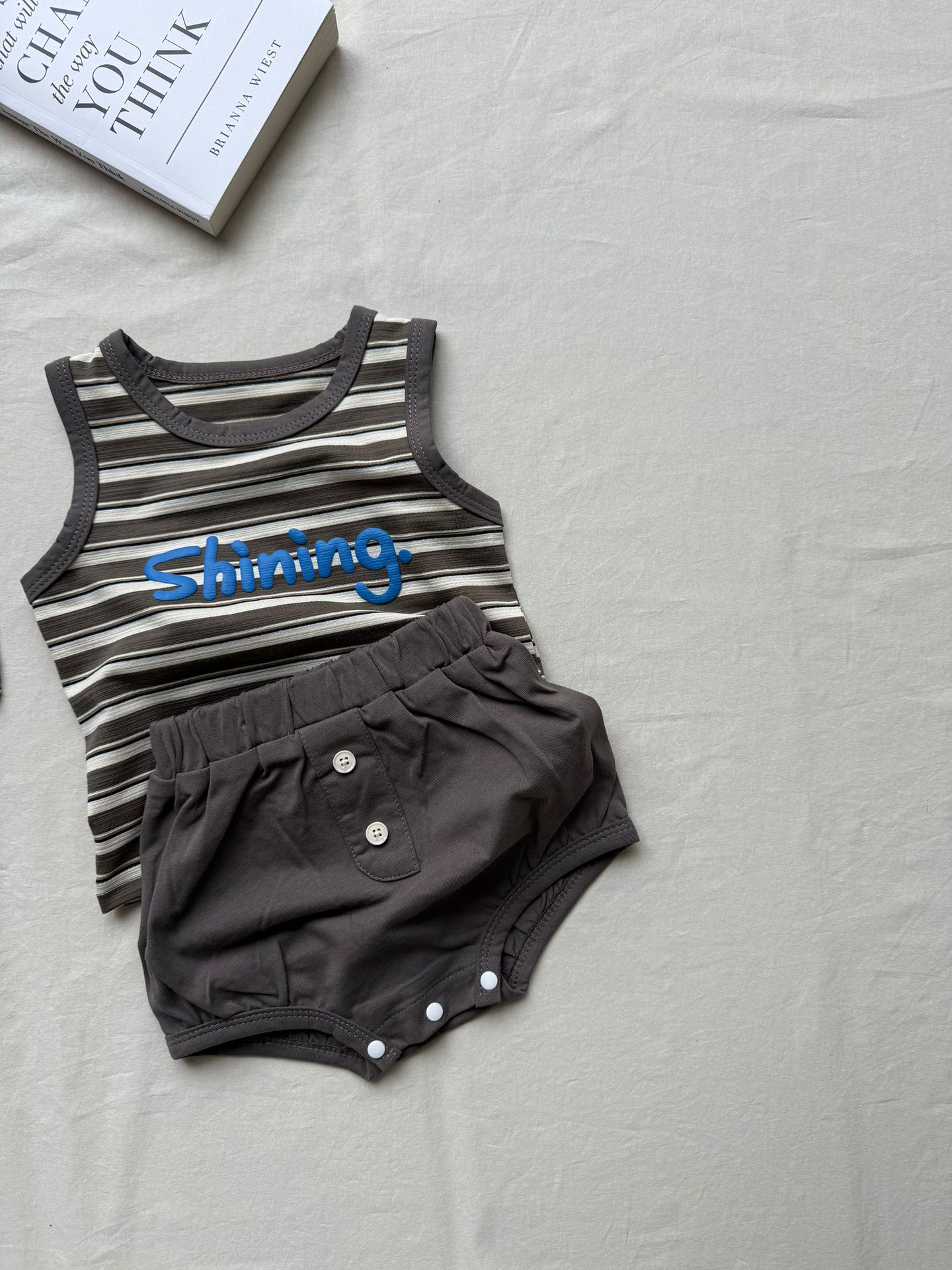 肌触りの良い素材で、暑い夏でもお子さんは快適に過ごせます。トップスは、爽やかな幅広ボーダー柄のタンクトップ。ボトムスのブルマパンツは、ゆったりとしたシルエットで動きやすく、おむつの上からでもすっきりと着こなせます。セットで着れば、統一感のあるカジュアルコーディネートが完成します。もちろん、それぞれ単品でも着回しが楽しめ、男の子にも女の子にもおすすめの万能アイテムです。