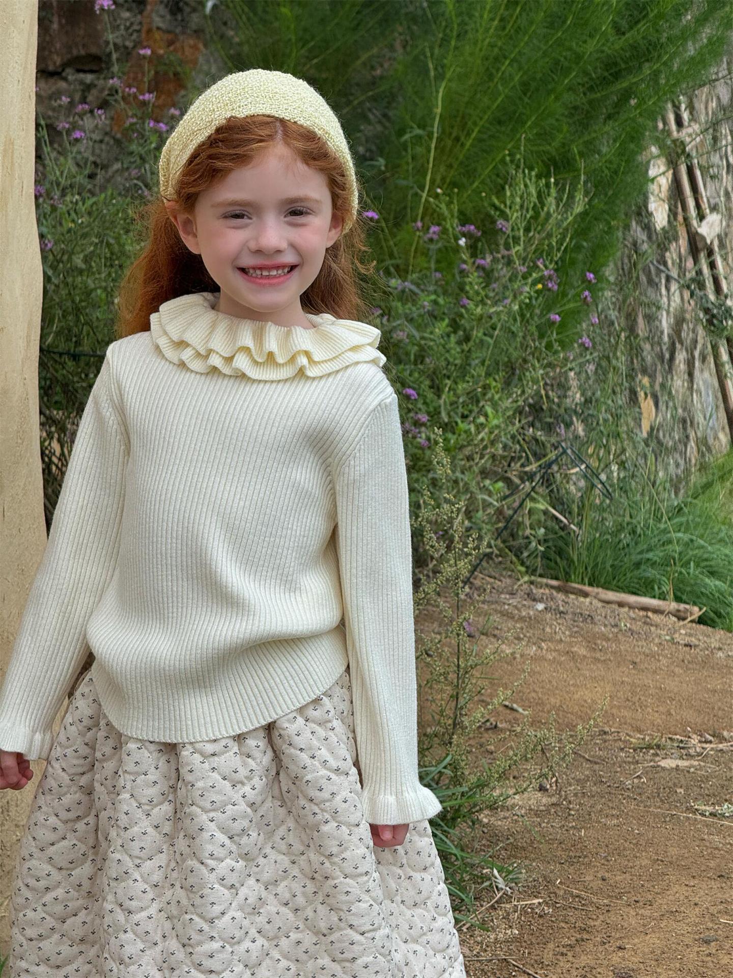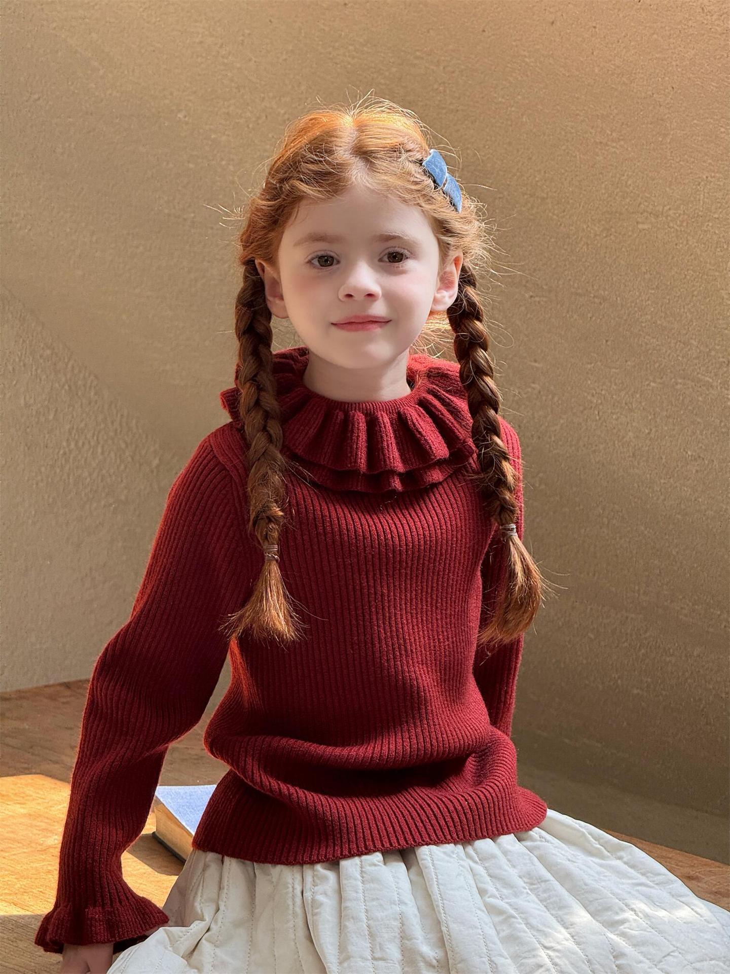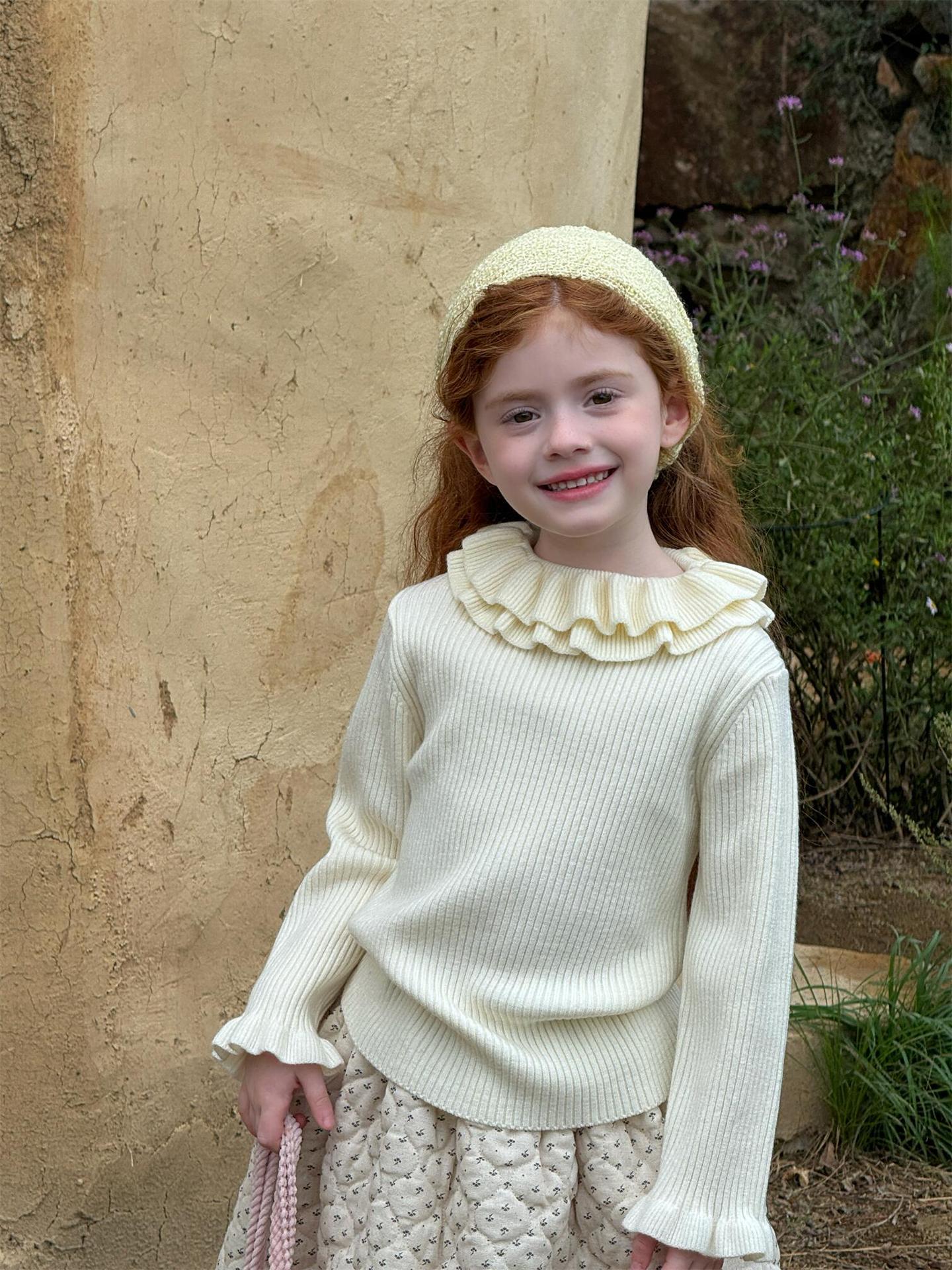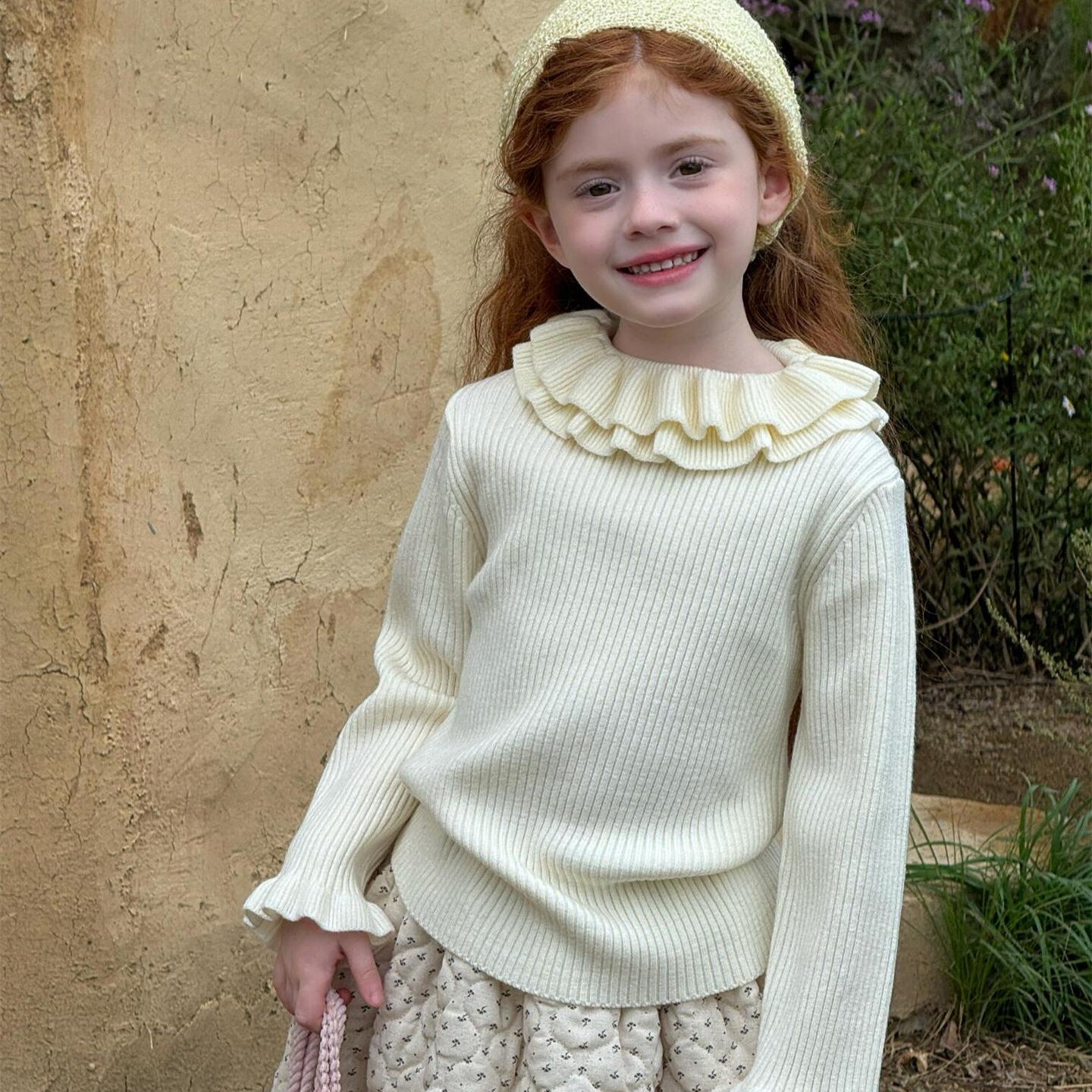柔らかなニット素材で仕立てた長袖カットソーは、重ねたフリルが愛らしいダブルラッフルカラーが顔周りを華やかに彩ります。繊細なフチのデザインが施された襟元が上品なムードを演出し、シンプルなTシャツやセーターのベースとしても着回しが効きます。このニットプルオーバーは、一枚で着てもレイヤードしてもおしゃれに決まる、着回し力の高い子ども服です。