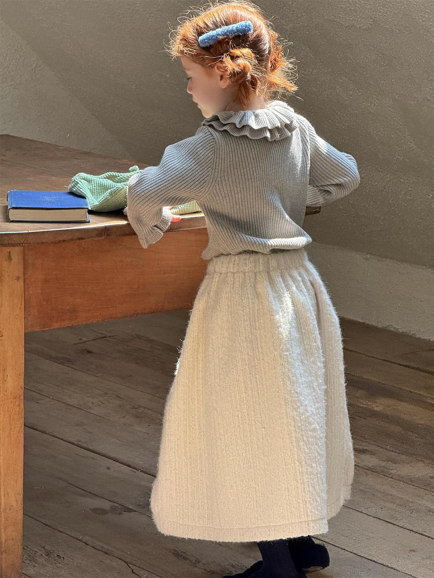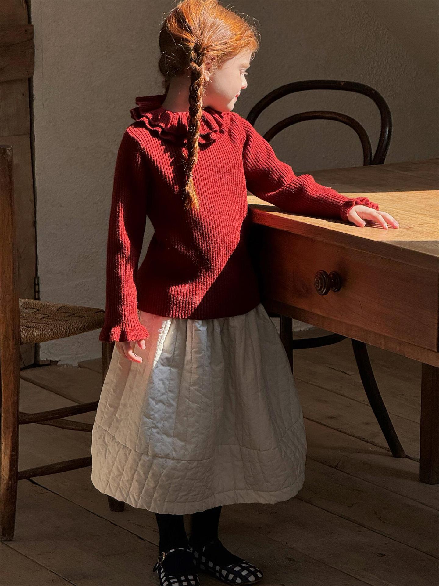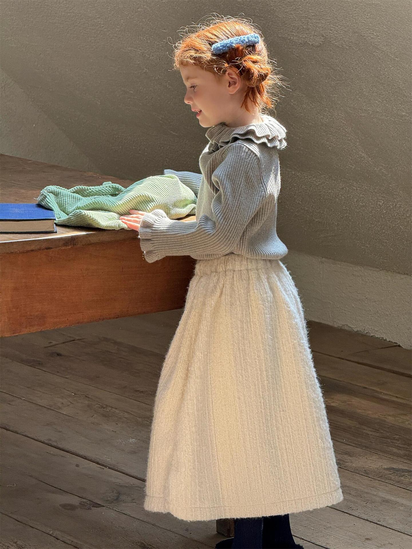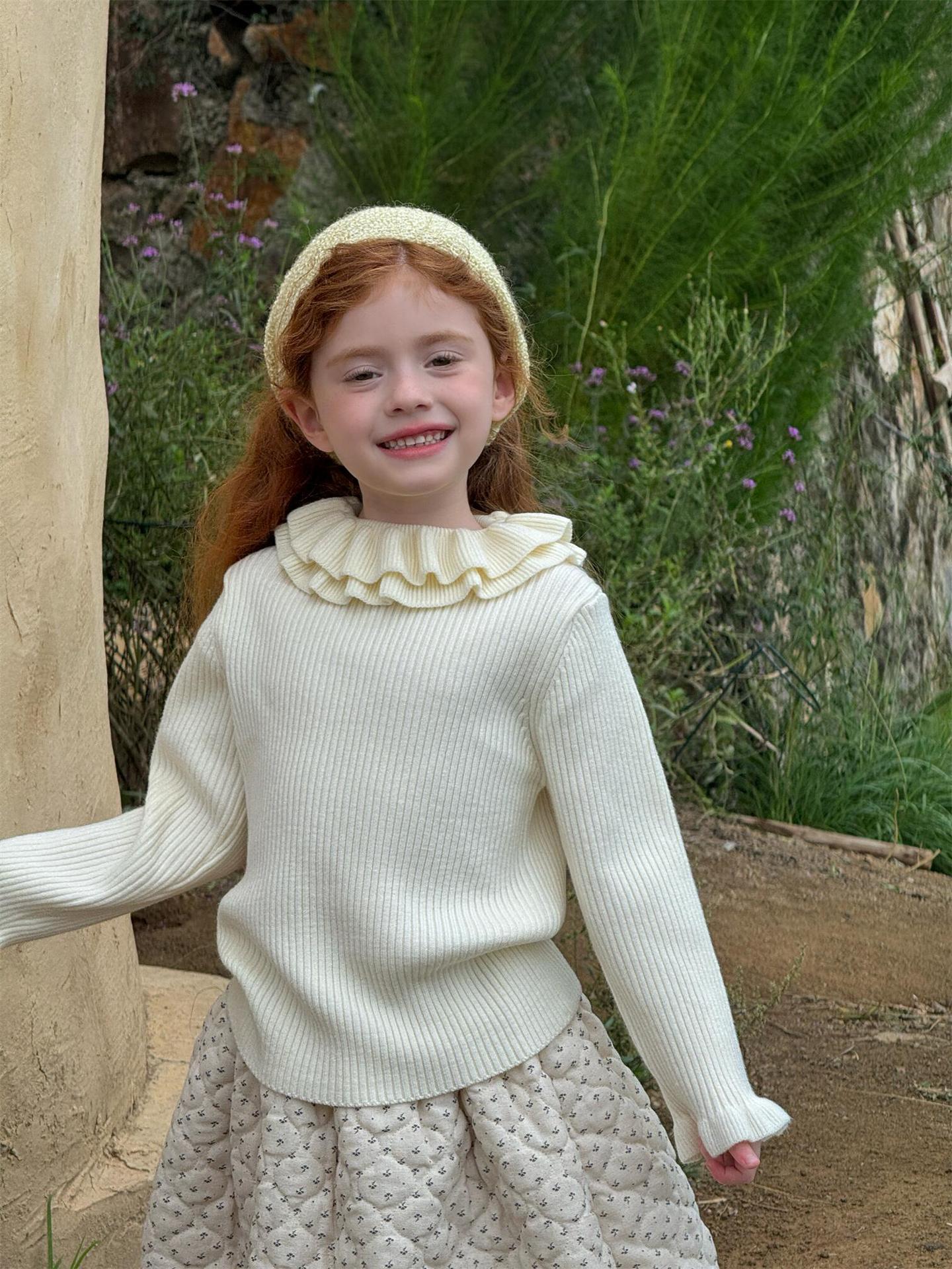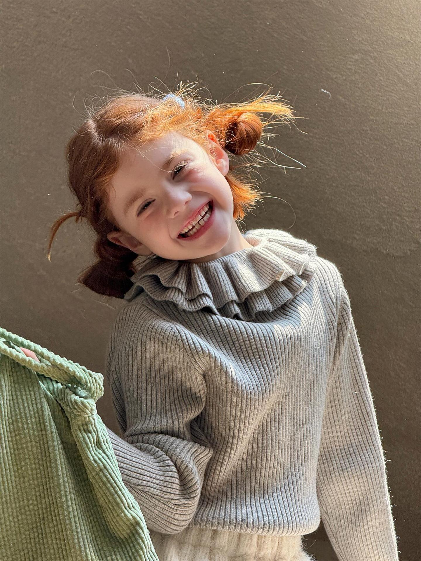 柔らかなニット素材で仕立てた長袖カットソーは、重ねたフリルが愛らしいダブルラッフルカラーが顔周りを華やかに彩ります。繊細なフチのデザインが施された襟元が上品なムードを演出し、シンプルなTシャツやセーターのベースとしても着回しが効きます。このニットプルオーバーは、一枚で着てもレイヤードしてもおしゃれに決まる、着回し力の高い子ども服です。
