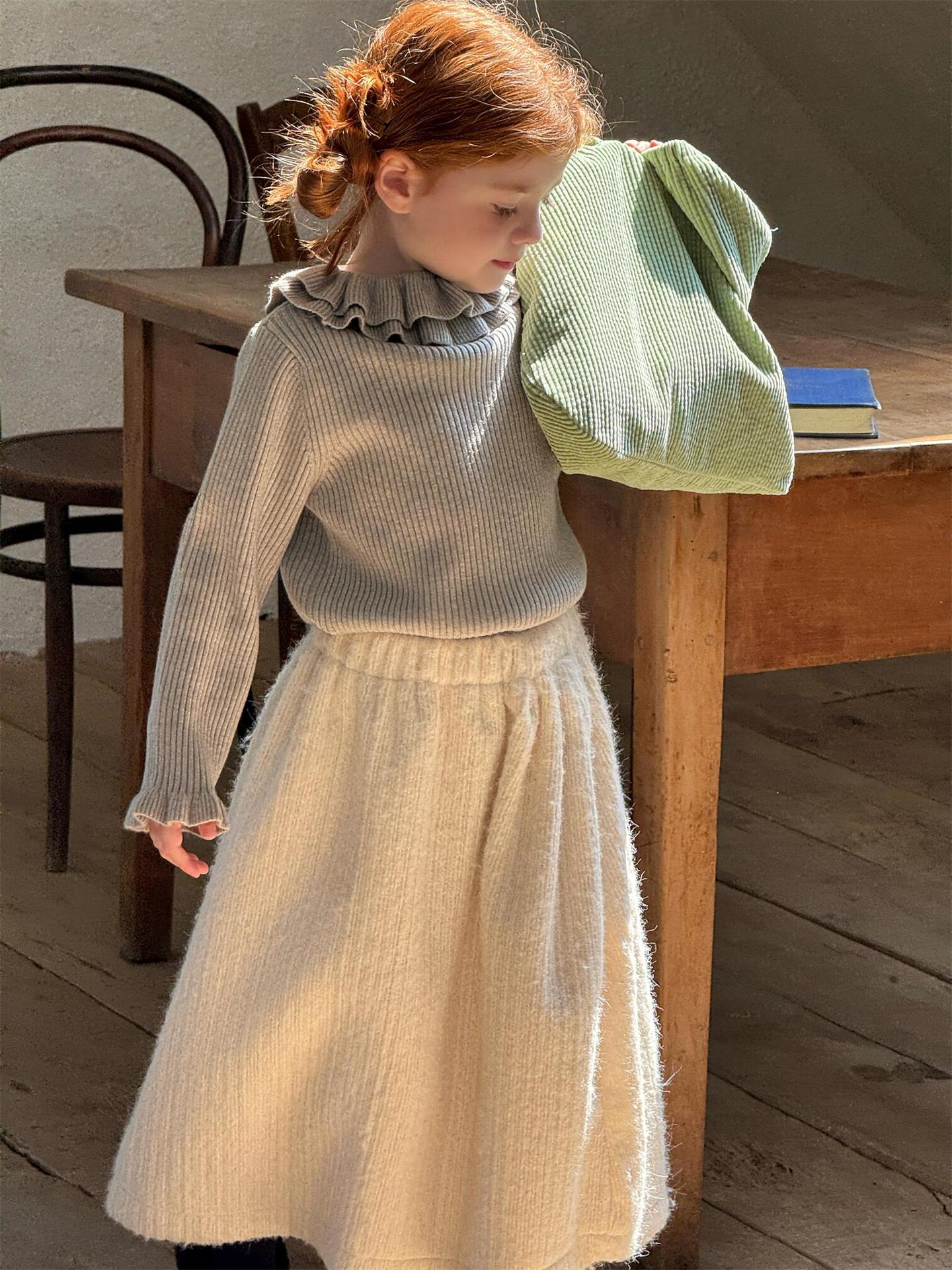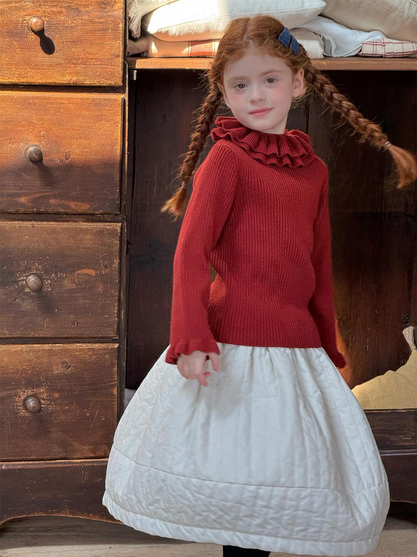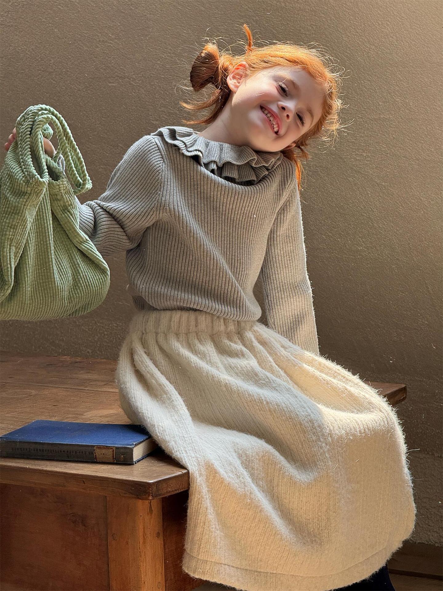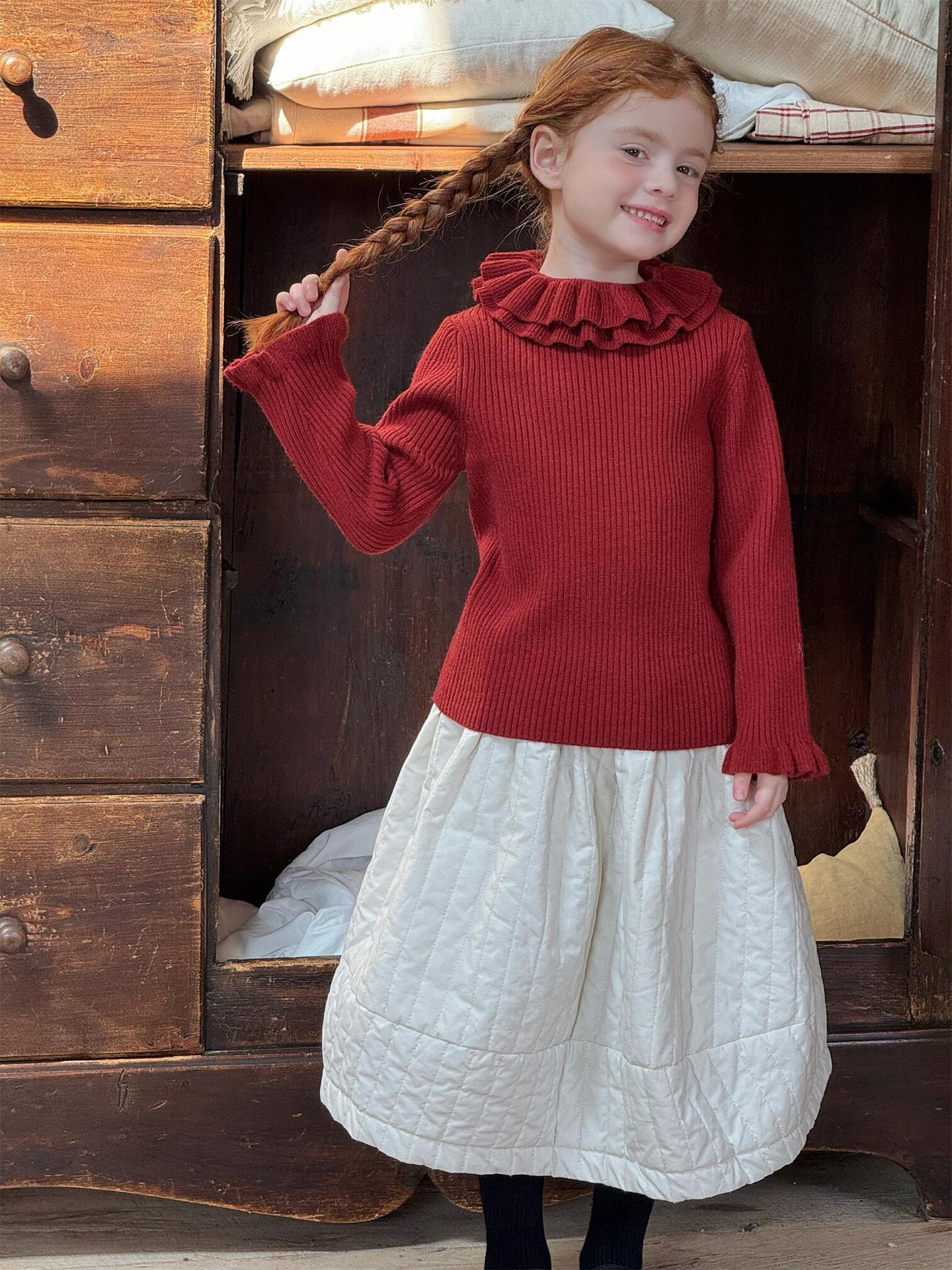 柔らかなニット素材で仕立てた長袖カットソーは、重ねたフリルが愛らしいダブルラッフルカラーが顔周りを華やかに彩ります。繊細なフチのデザインが施された襟元が上品なムードを演出し、シンプルなTシャツやセーターのベースとしても着回しが効きます。このニットプルオーバーは、一枚で着てもレイヤードしてもおしゃれに決まる、着回し力の高い子ども服です。