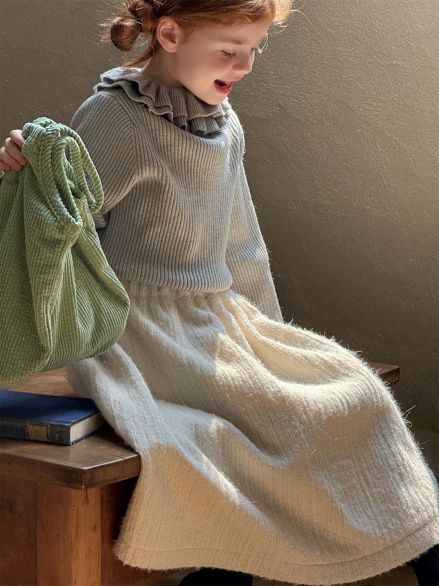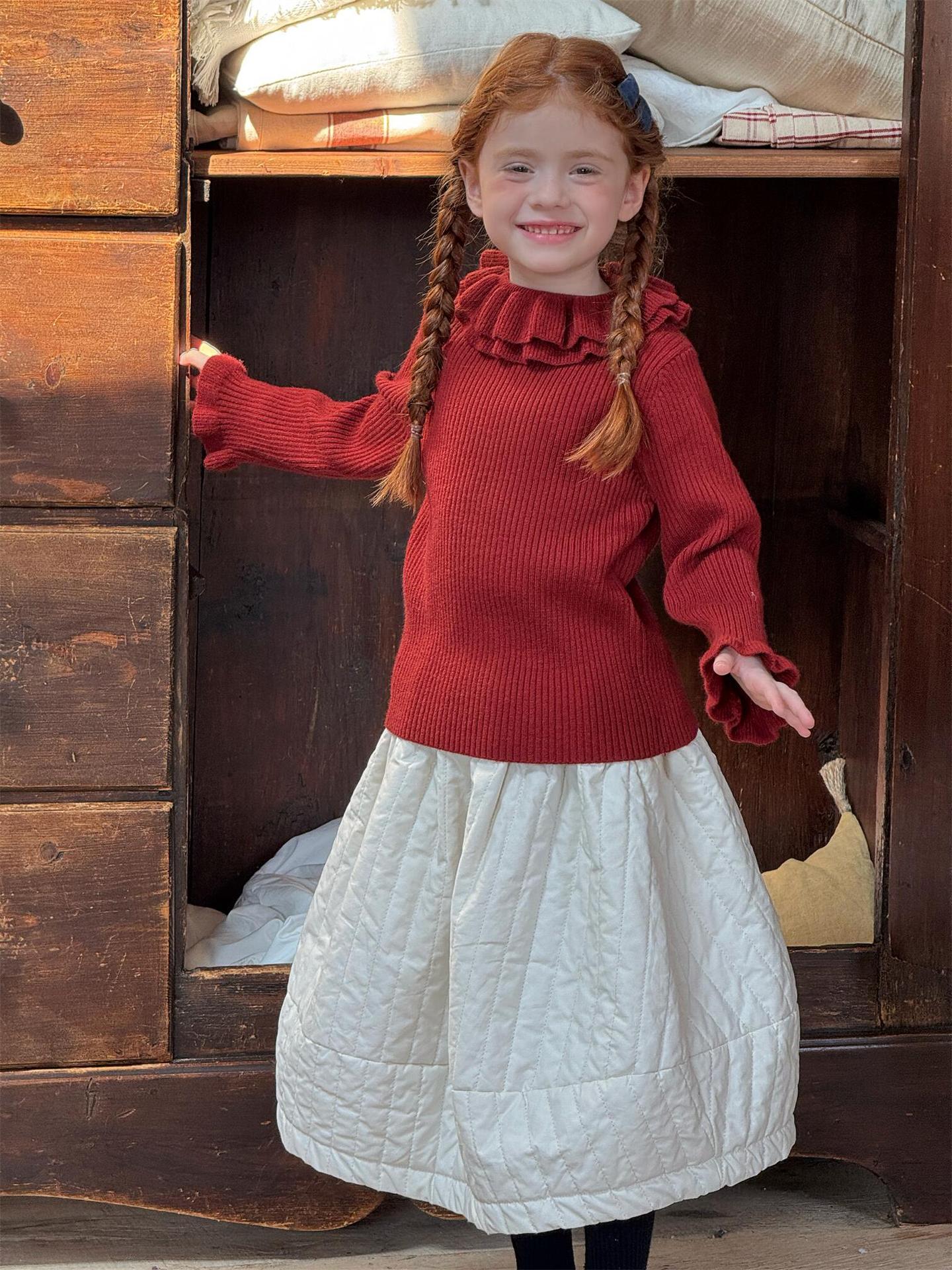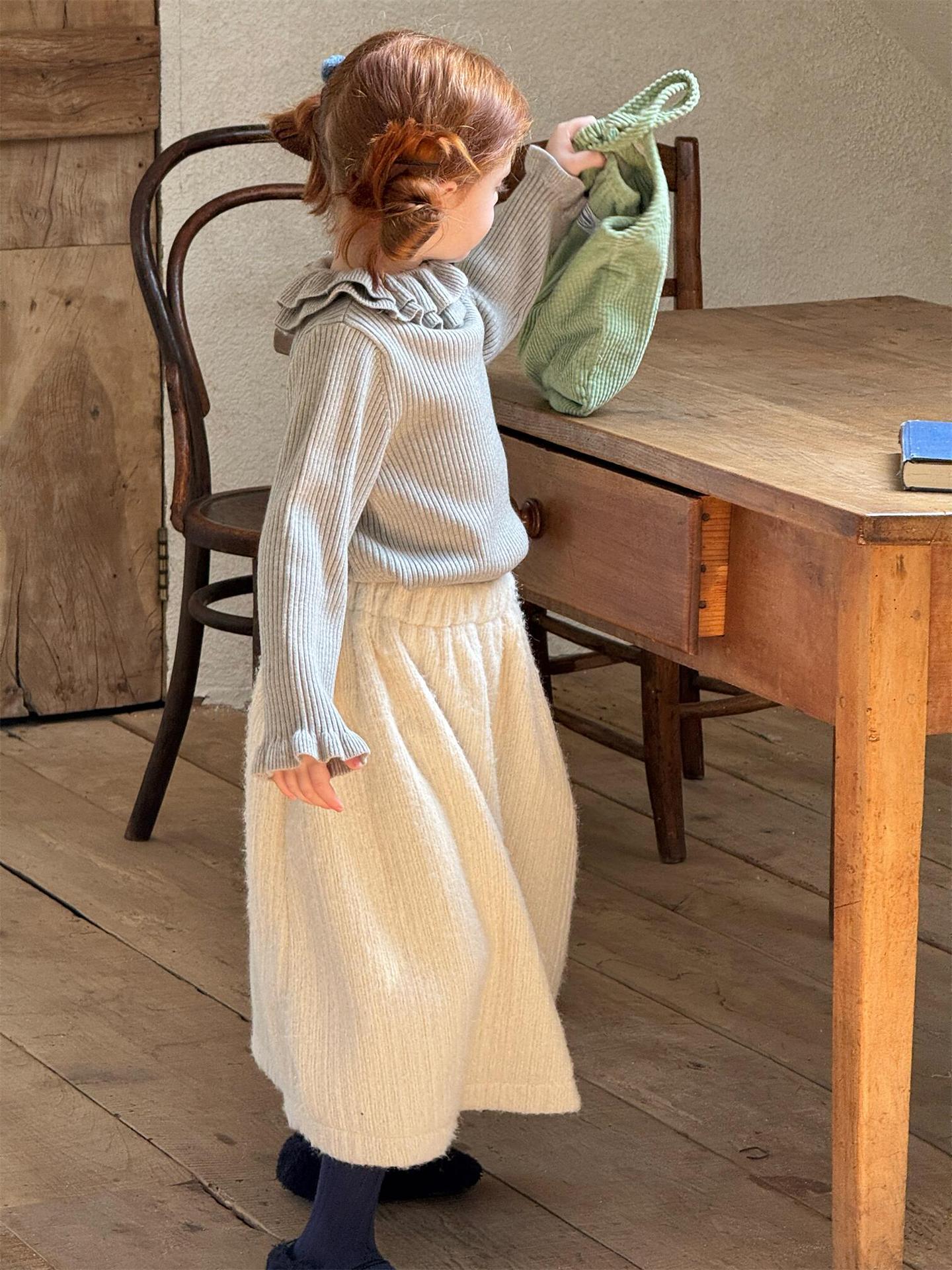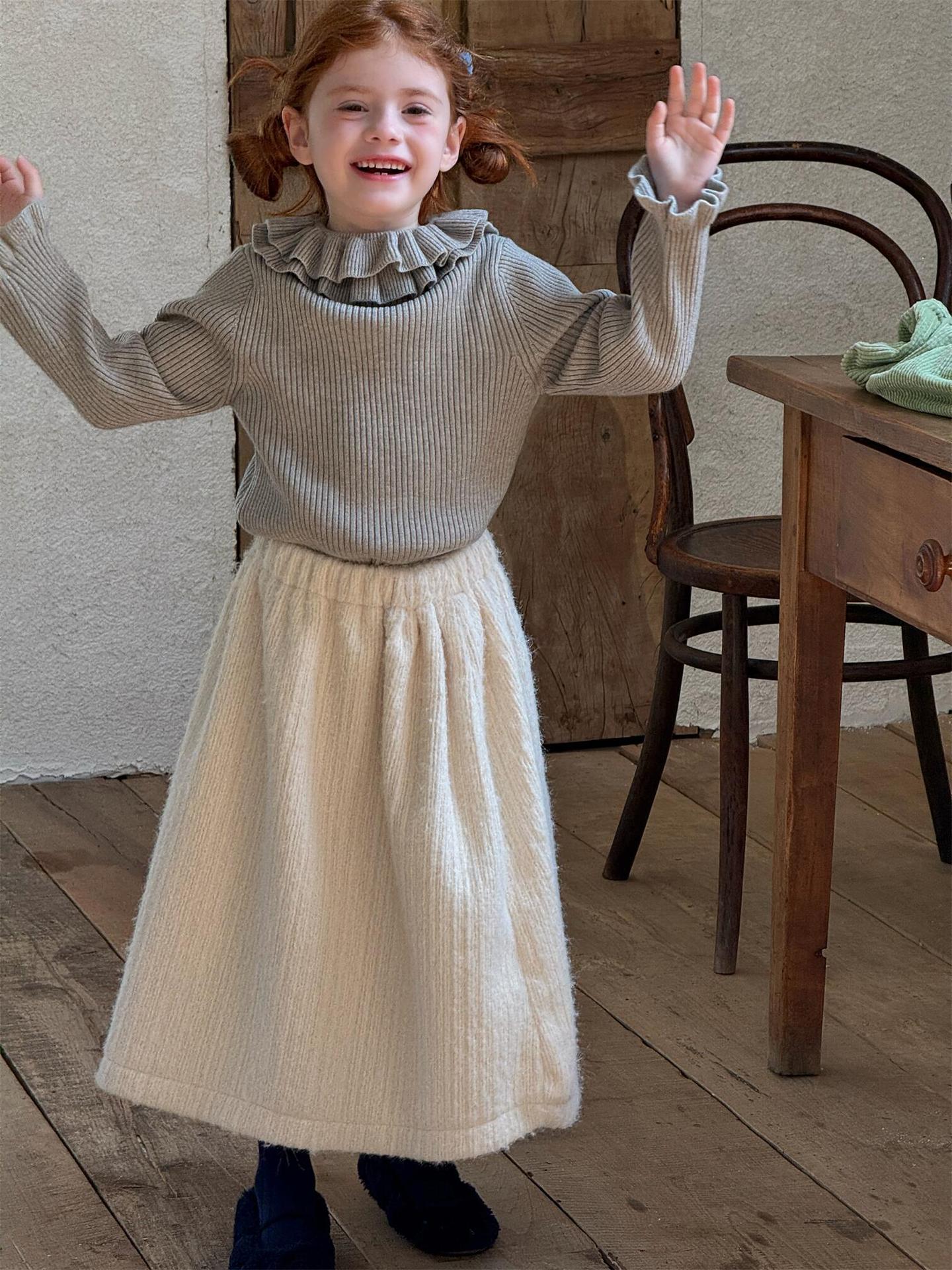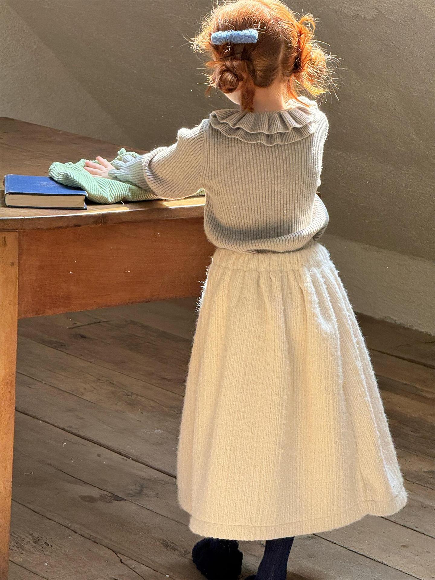 柔らかなニット素材で仕立てた長袖カットソーは、重ねたフリルが愛らしいダブルラッフルカラーが顔周りを華やかに彩ります。繊細なフチのデザインが施された襟元が上品なムードを演出し、シンプルなTシャツやセーターのベースとしても着回しが効きます。このニットプルオーバーは、一枚で着てもレイヤードしてもおしゃれに決まる、着回し力の高い子ども服です。