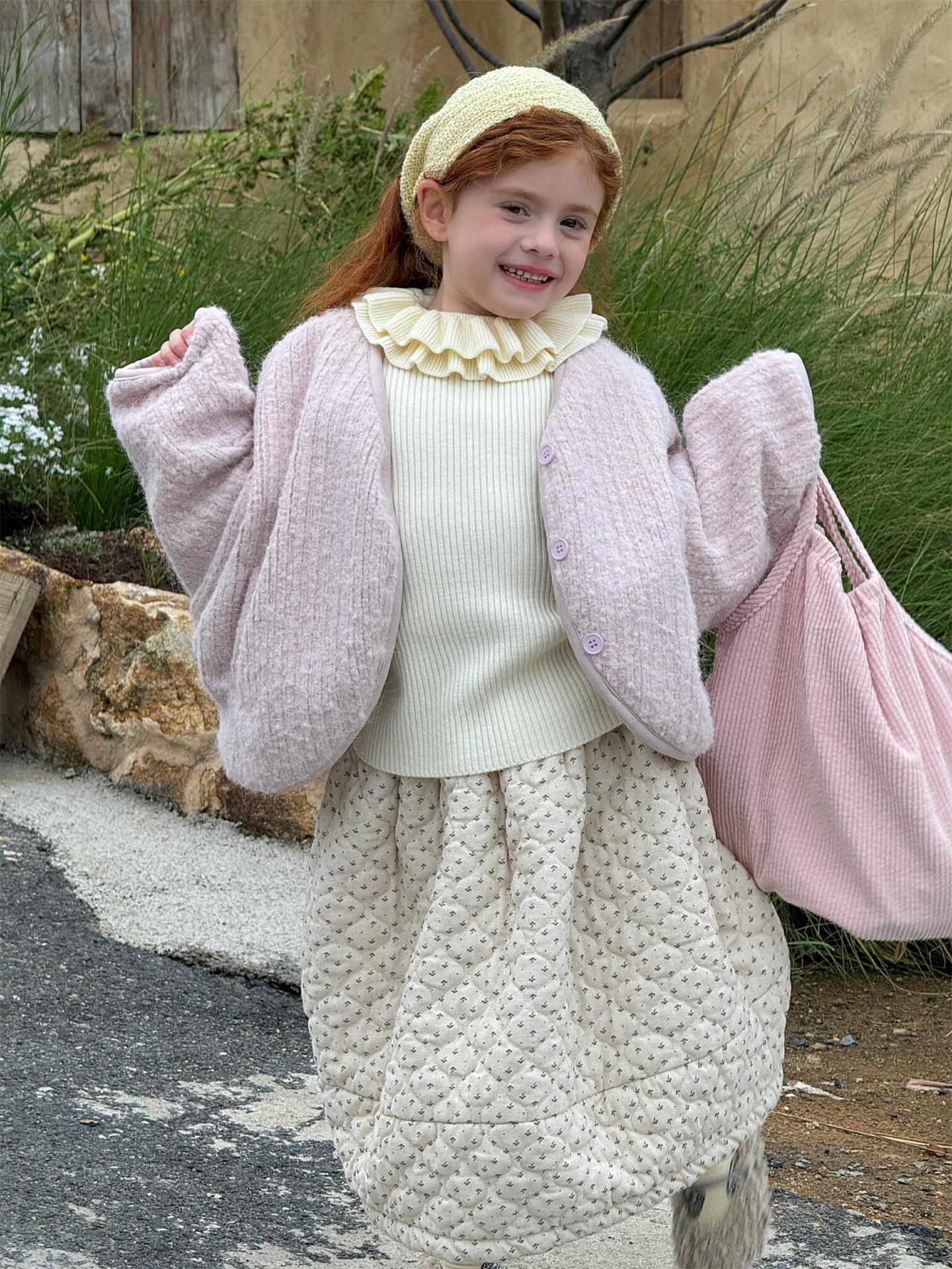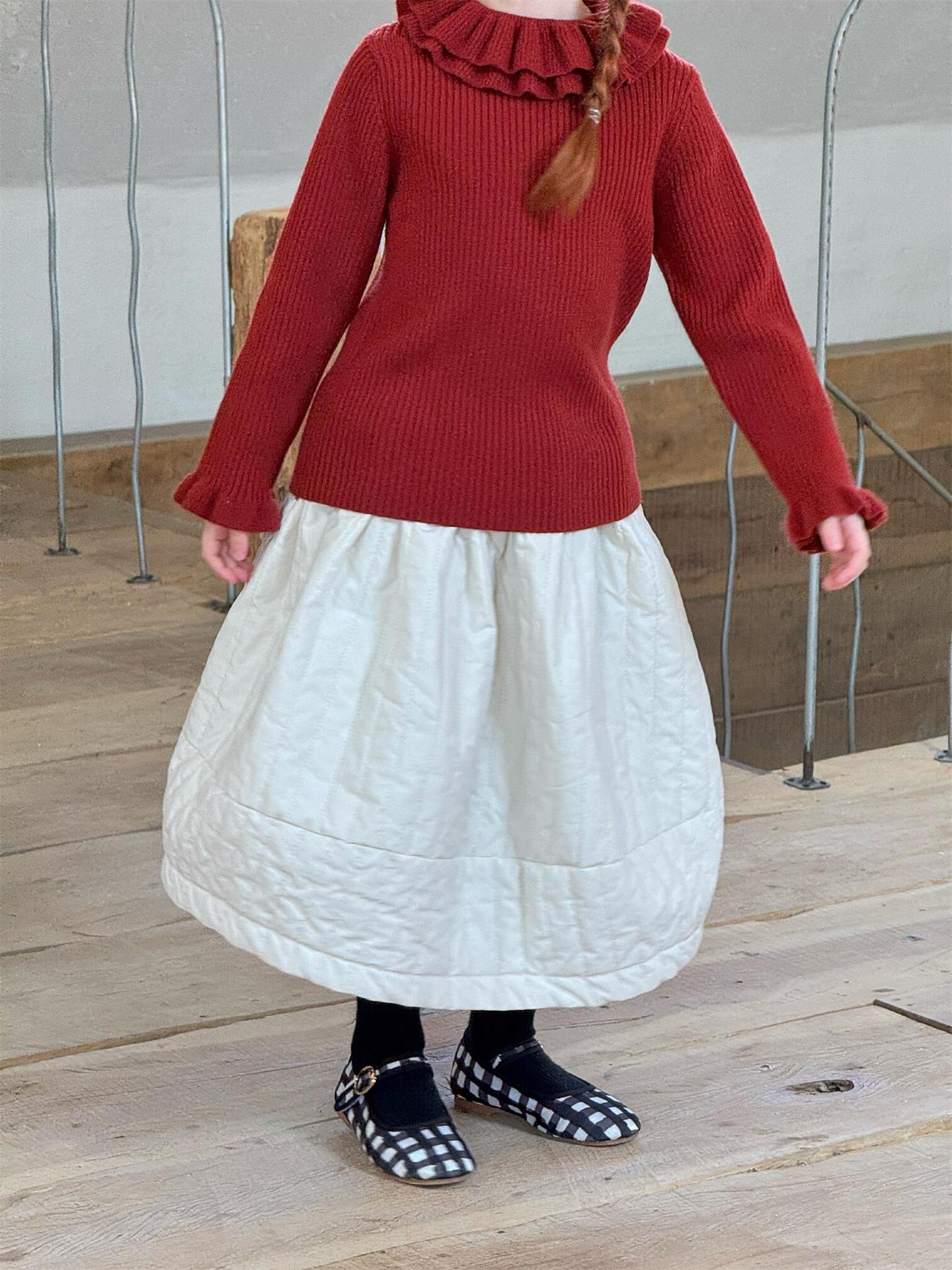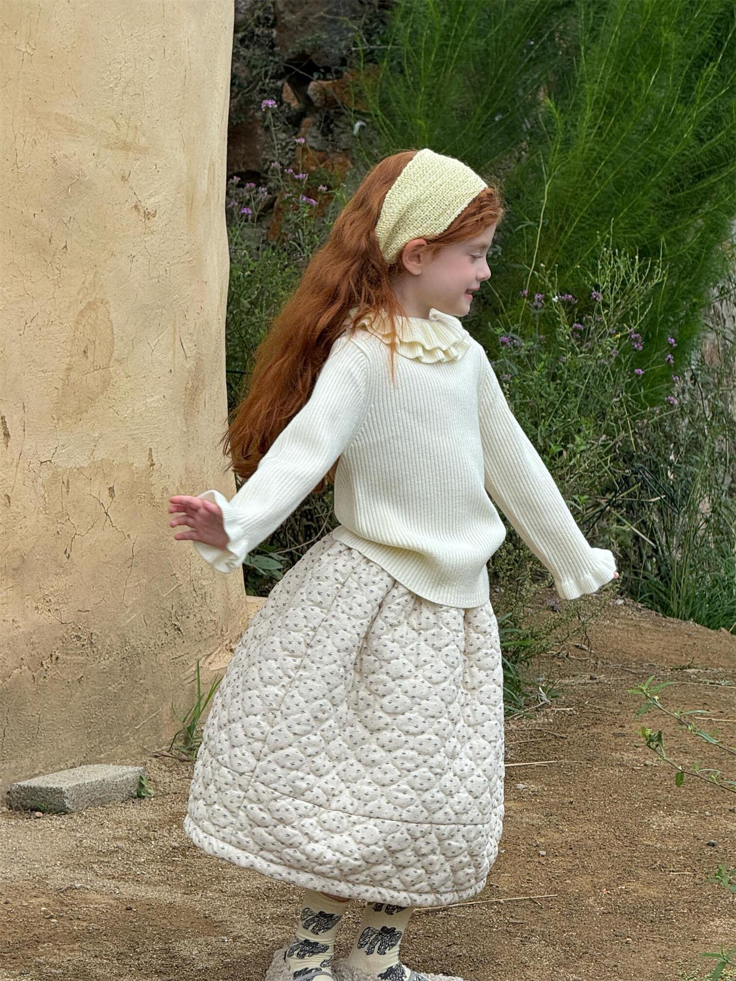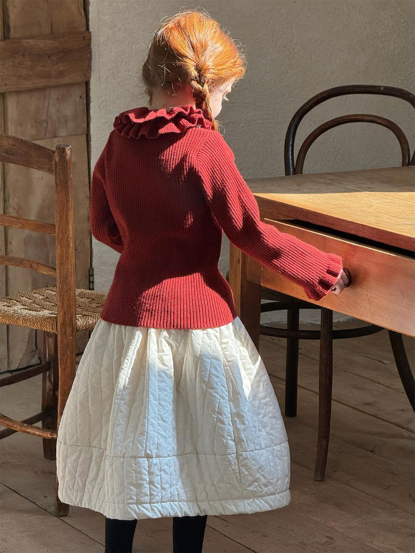 柔らかなニット素材で仕立てた長袖カットソーは、重ねたフリルが愛らしいダブルラッフルカラーが顔周りを華やかに彩ります。繊細なフチのデザインが施された襟元が上品なムードを演出し、シンプルなTシャツやセーターのベースとしても着回しが効きます。このニットプルオーバーは、一枚で着てもレイヤードしてもおしゃれに決まる、着回し力の高い子ども服です。