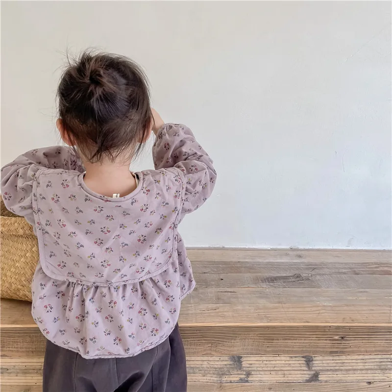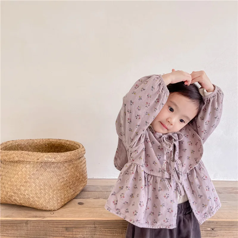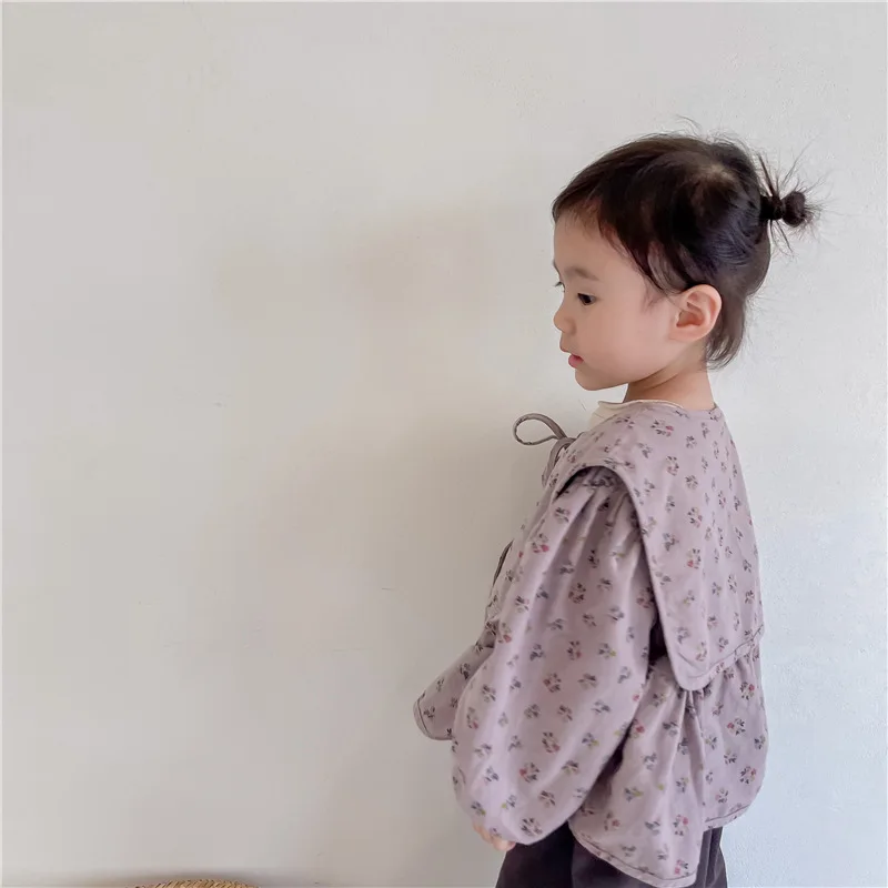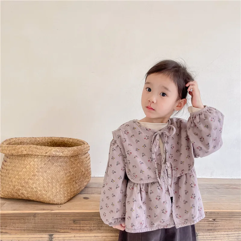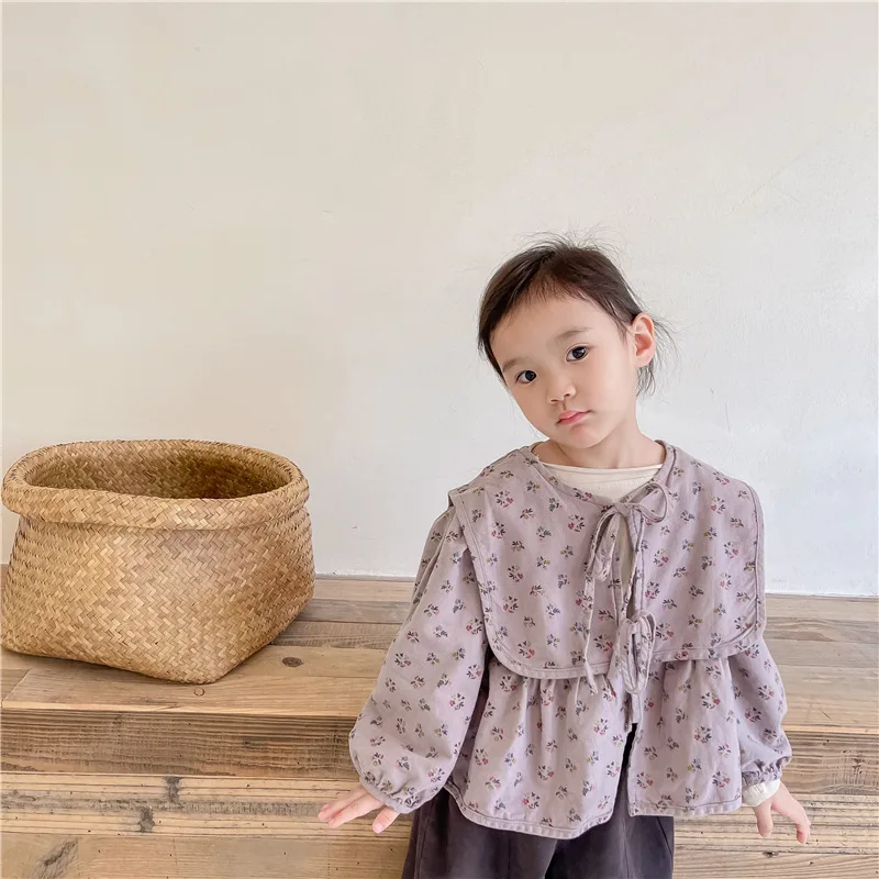 キッズ服 長袖 ブラウス シャツ カーディガン ジャケット フラワー 花柄 ビッグ襟 ベージュ 紫 2色 女の子