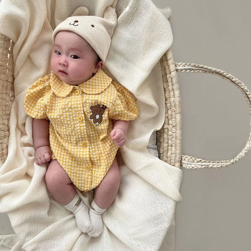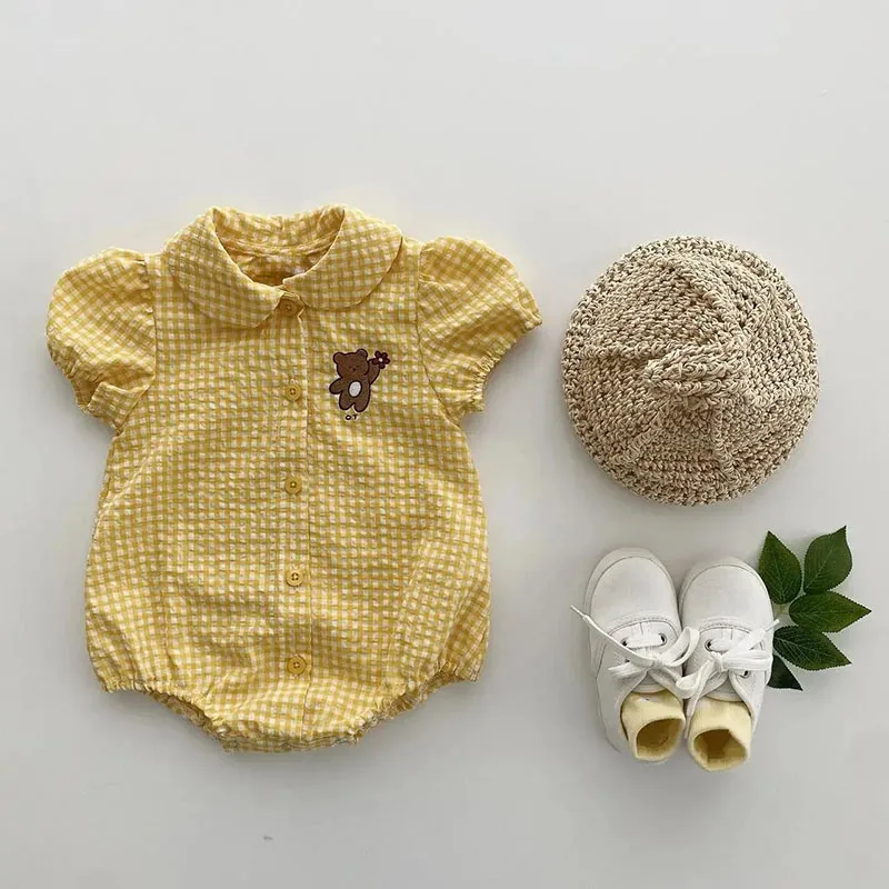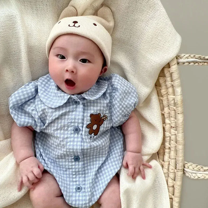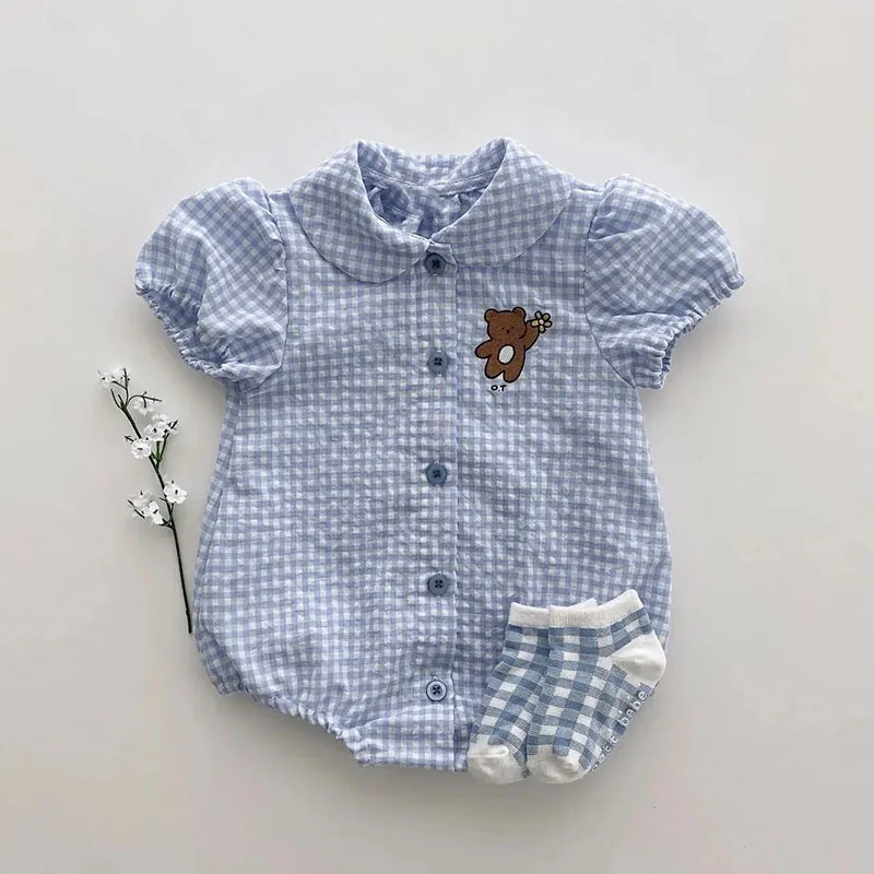 ベビー チェック くま ベア 半袖 パフスリーブ ブラウス シャツ ロンパース