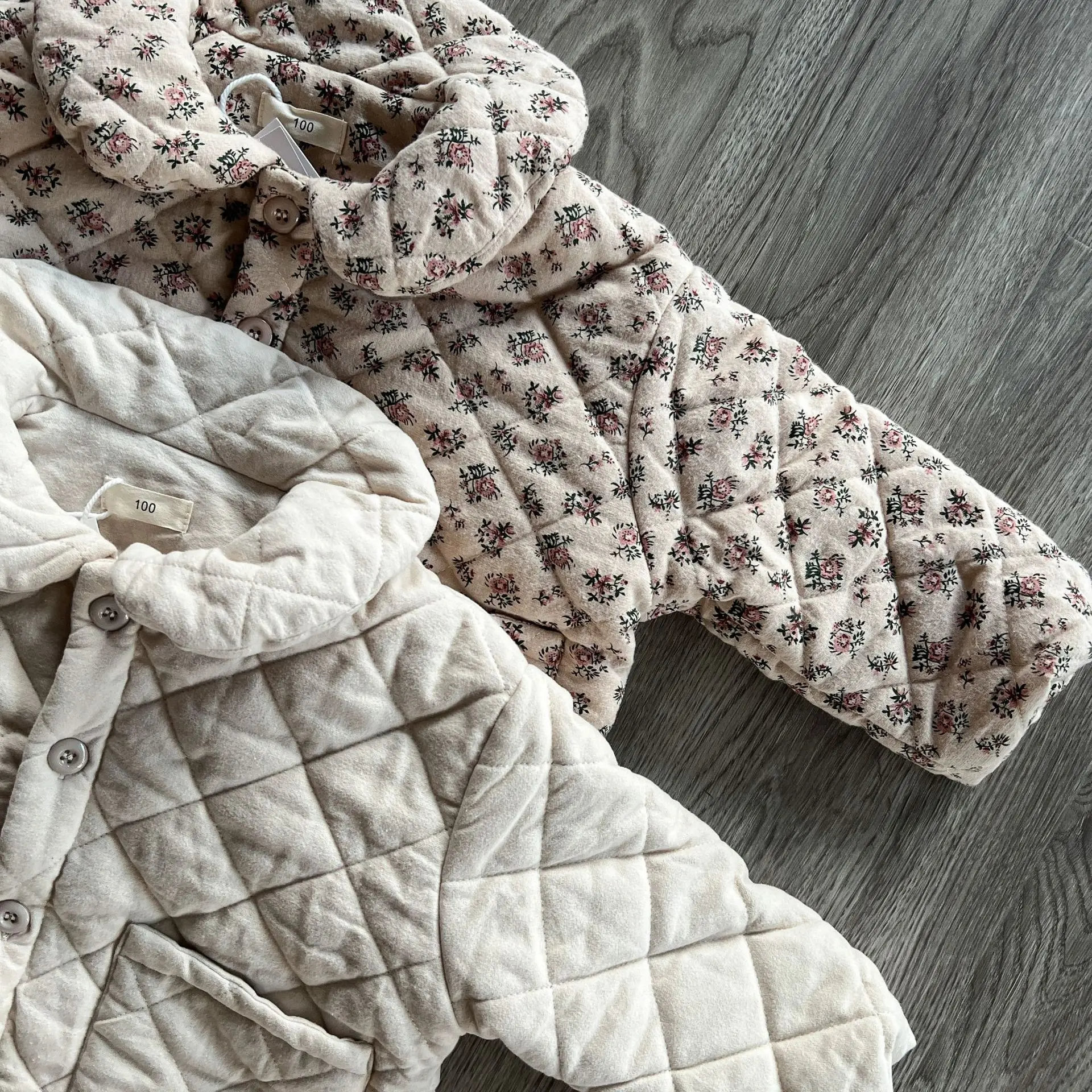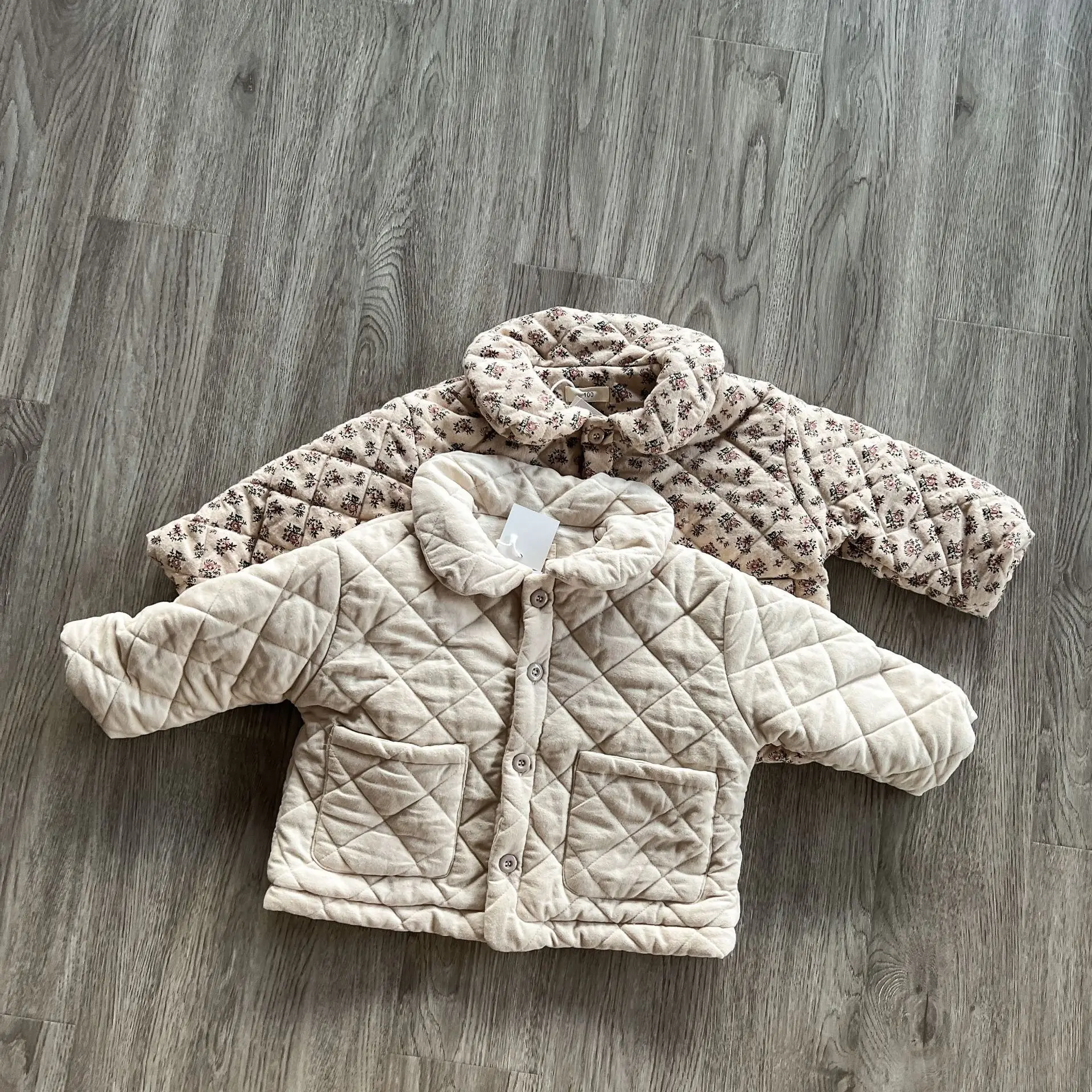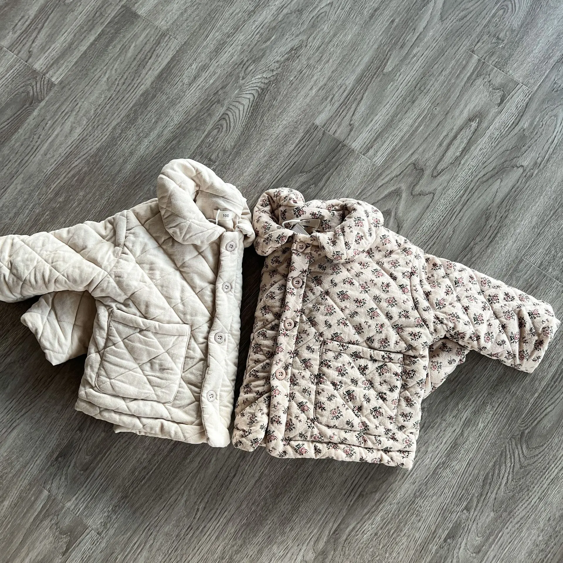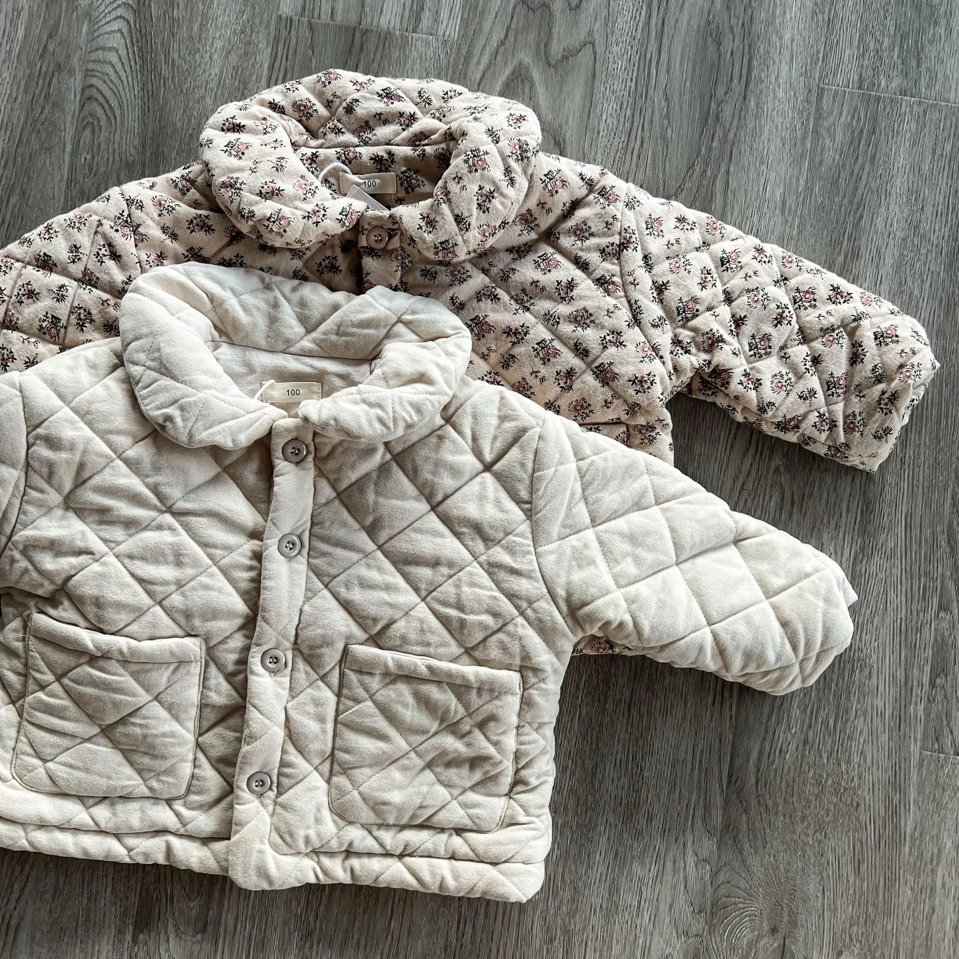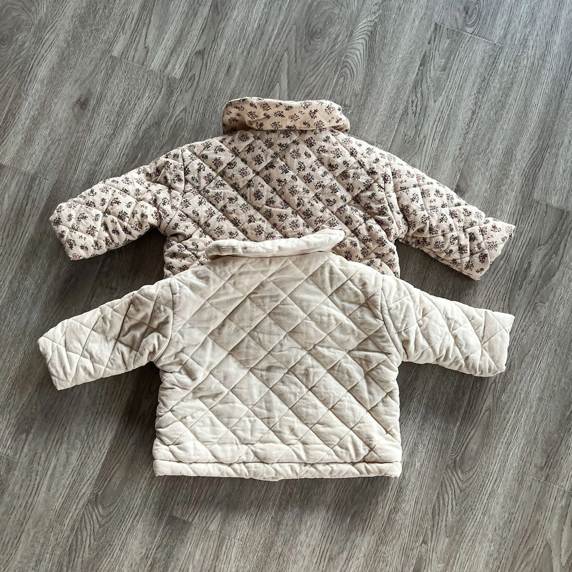 おしゃれなキッズアウターが登場しました。このフラワープリントと無地の組み合わせが魅力的な丸襟コートは、女の子のためのキルティングジャケットです。寒い季節にあたたかさとスタイルを提供します。おしゃれな女の子にぴったりの一着です。