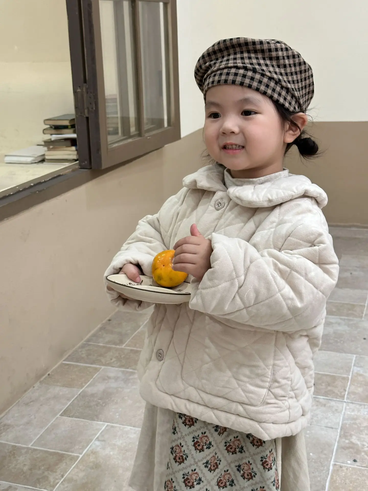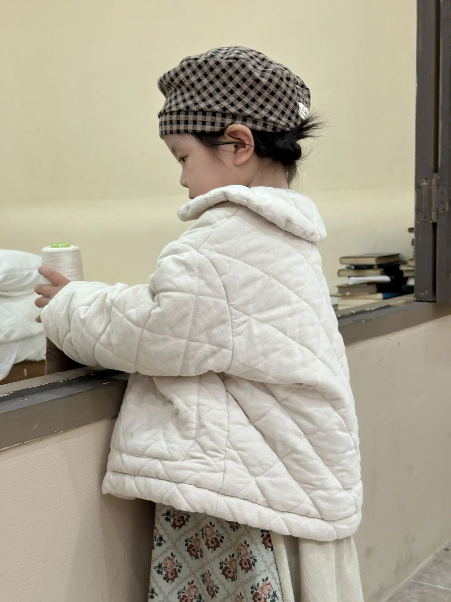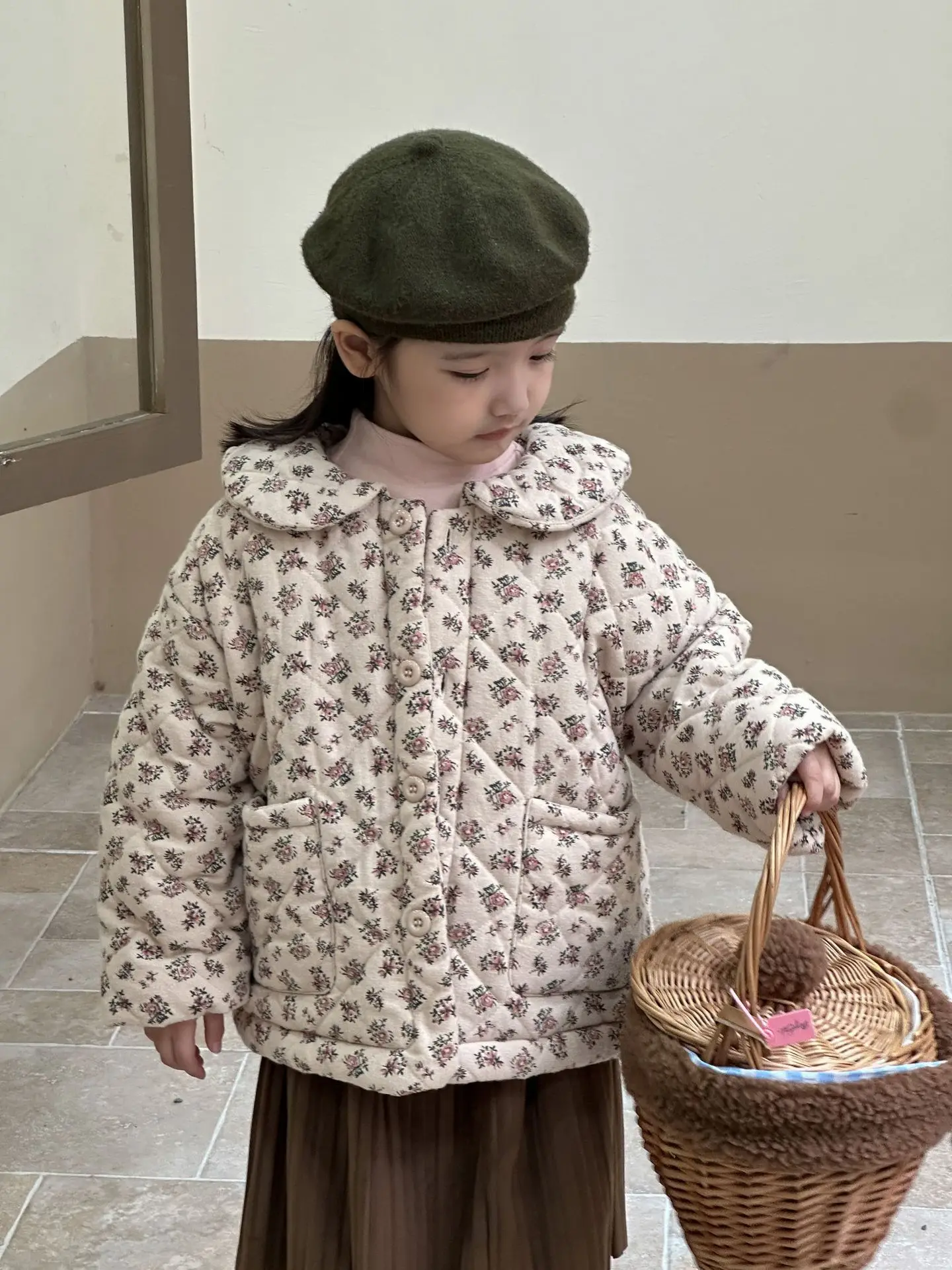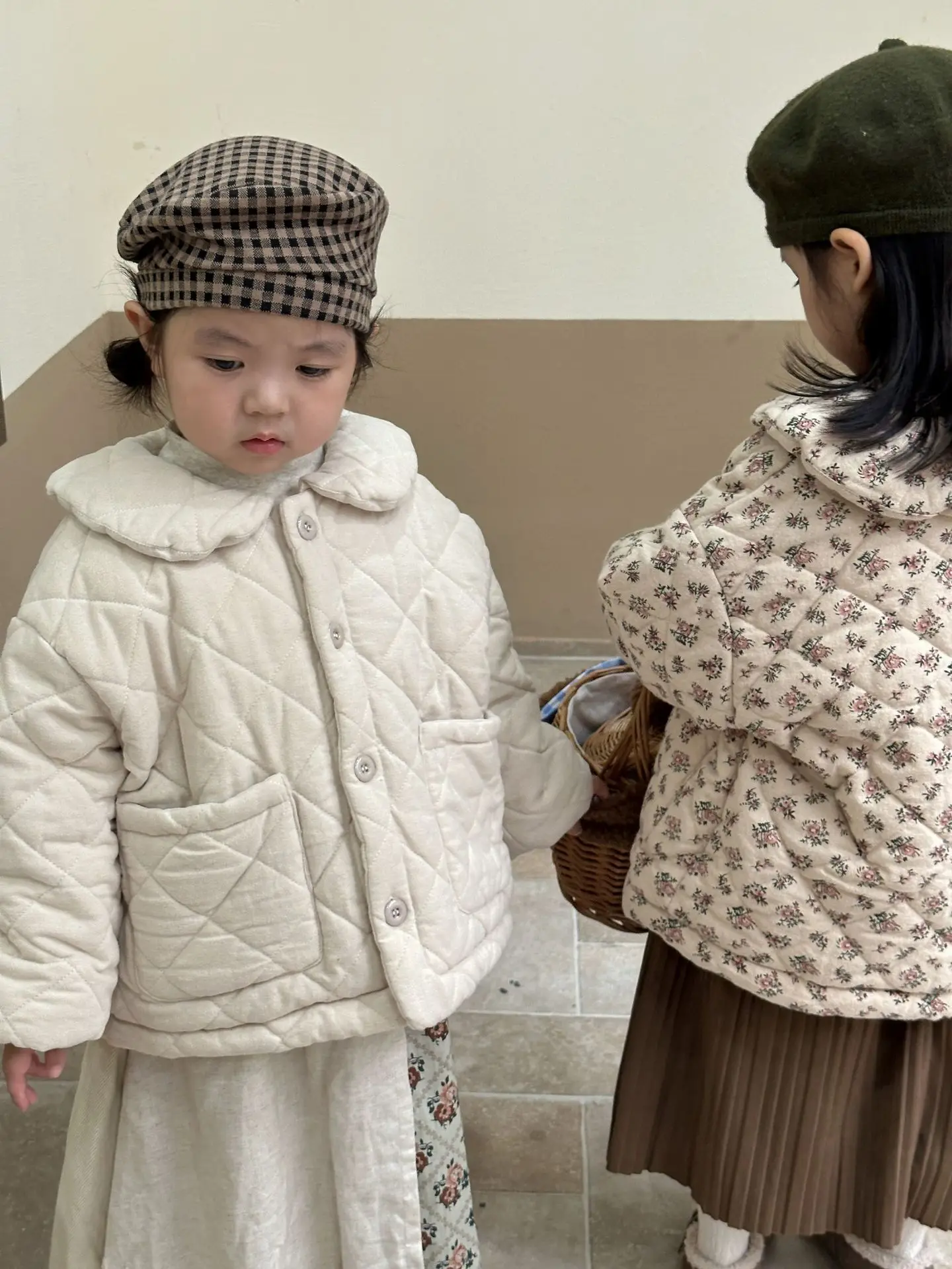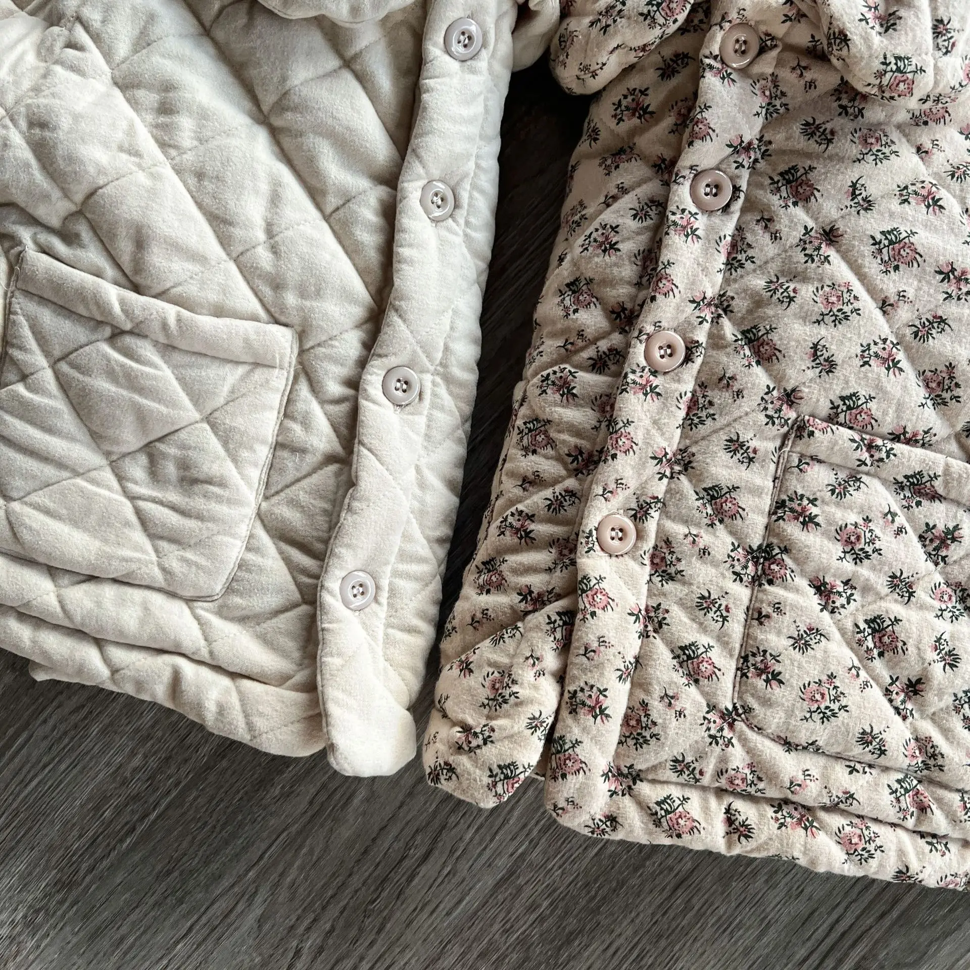 おしゃれなキッズアウターが登場しました。このフラワープリントと無地の組み合わせが魅力的な丸襟コートは、女の子のためのキルティングジャケットです。寒い季節にあたたかさとスタイルを提供します。おしゃれな女の子にぴったりの一着です。