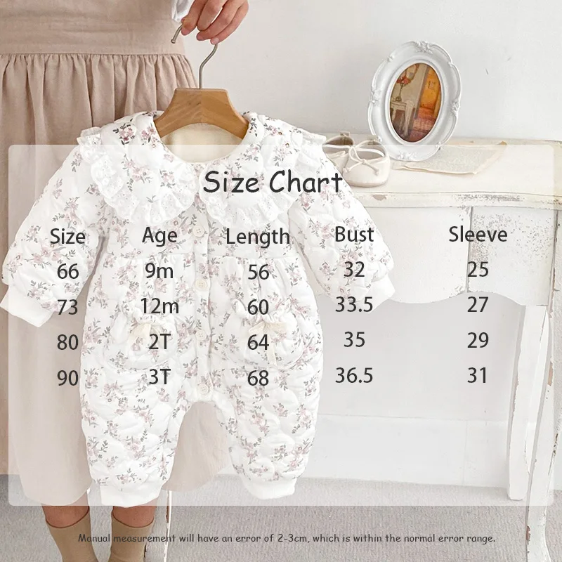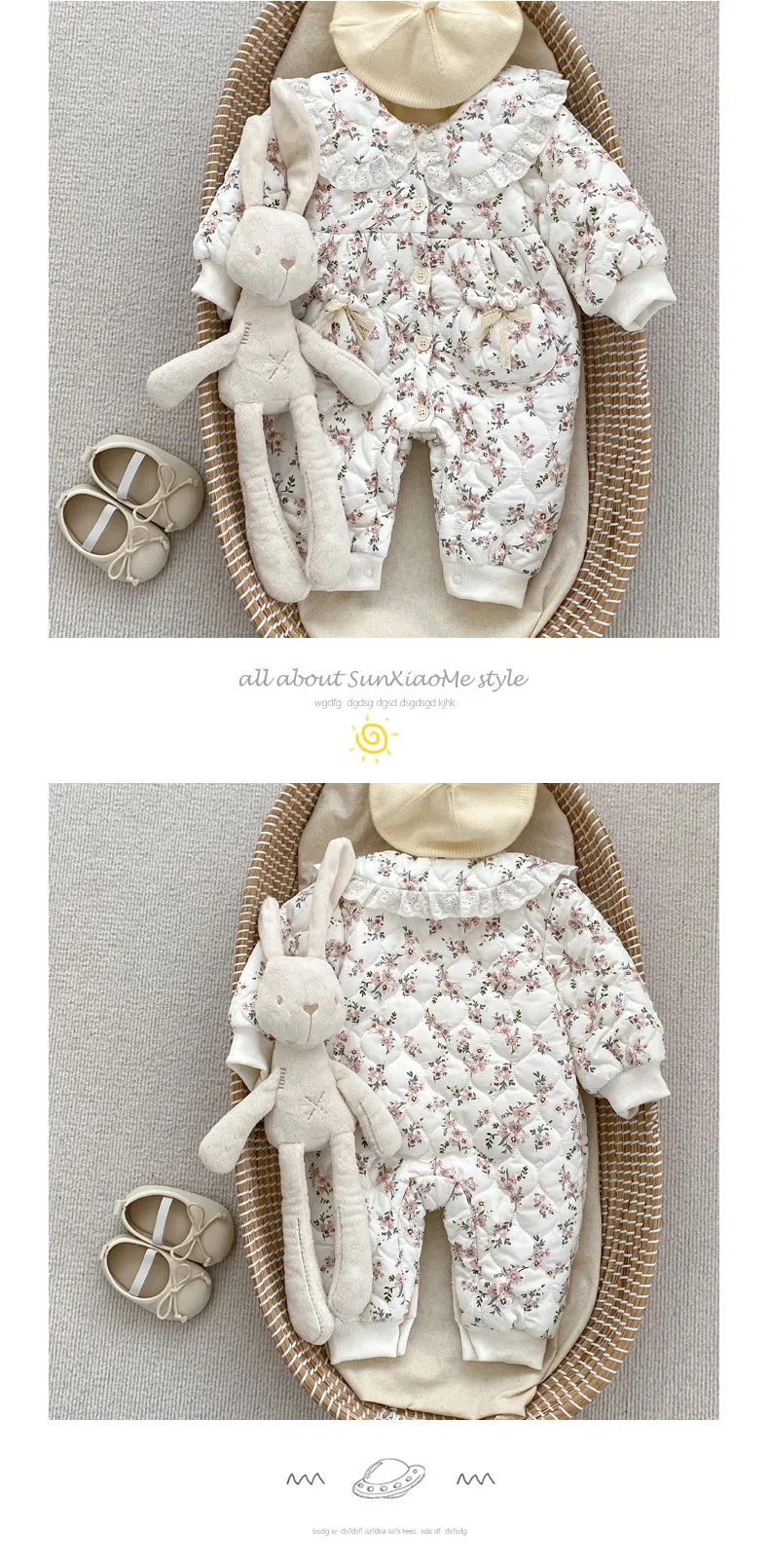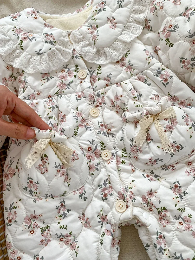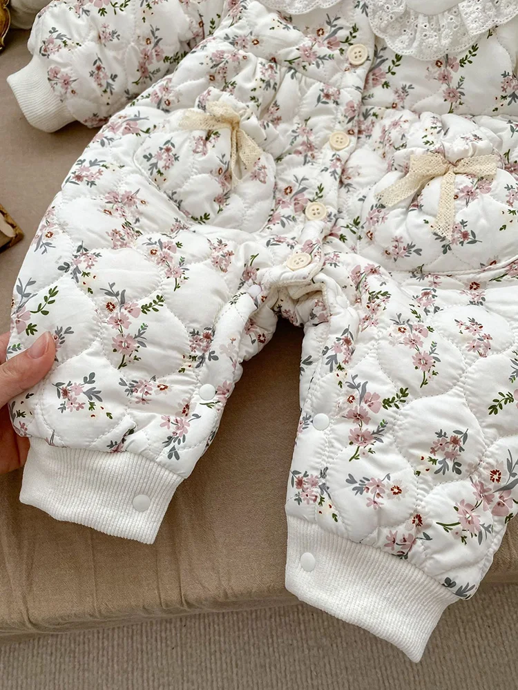 ベビーアウタージャンプスーツ キルティングロンパース フラワープリント フリルカラー ガールズ 女の子 子供服