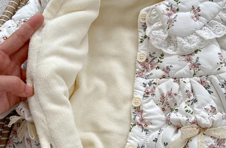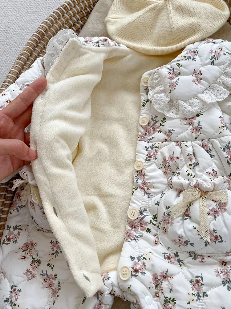 寒さからしっかりと守りながら、おしゃれ心も忘れないベビーアウタージャンプスーツ。暖かいキルティング素材が寒冷地でも心地よい温かさを提供します。フラワープリントが華やかで、フリルカラーが優雅な印象を与えます。しっかりとした作りで、安心してお子様に着せていただけるアイテムです。