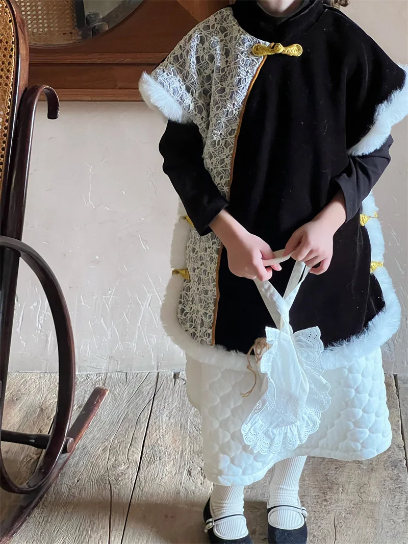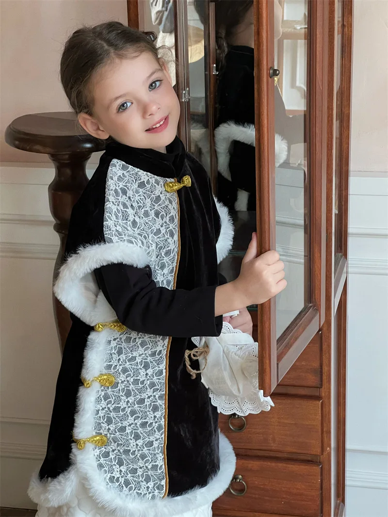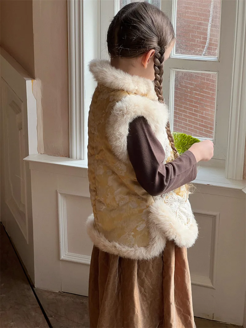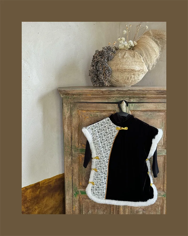 冷え込む季節にぴったりのキッズベストが新登場しました。ファーフリースとパッチワークが特徴の、レースとチャイナドレスを組み合わせた一着。赤ちゃんの女の子が可愛らしく温かく過ごせるデザインです。寒さからしっかりと守りながら、おしゃれも楽しめるベストです。