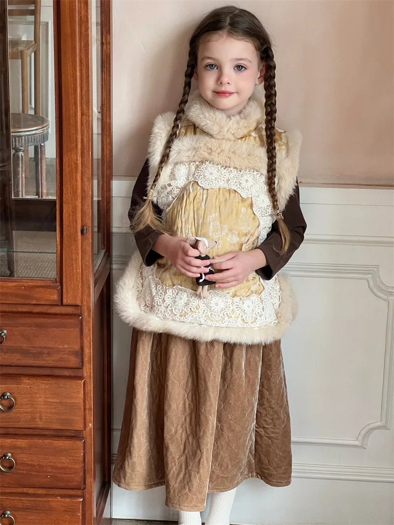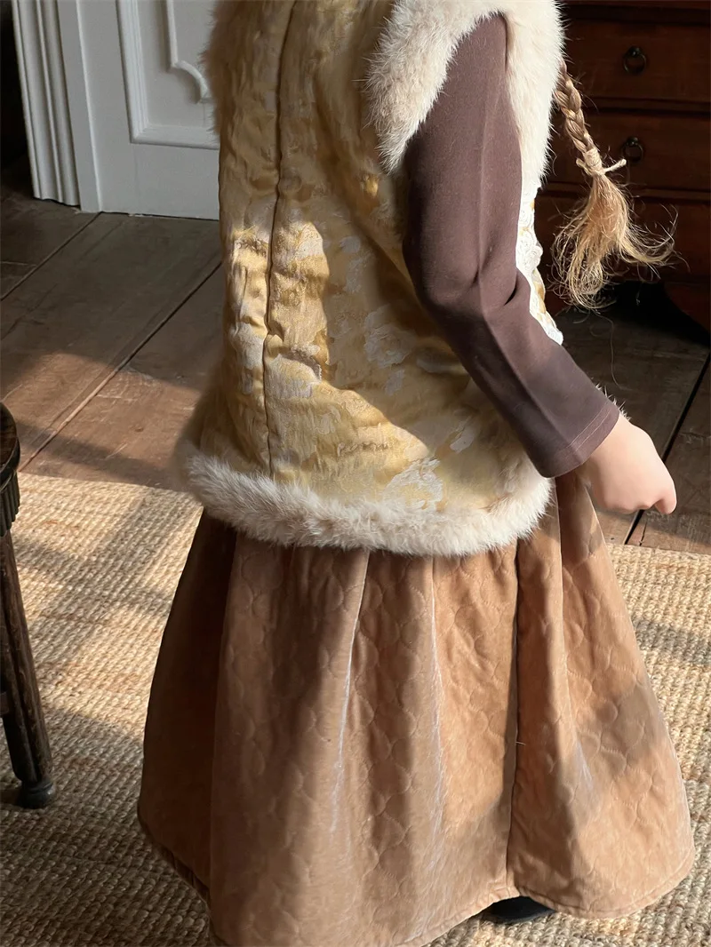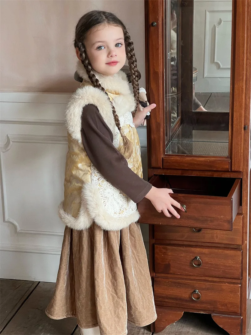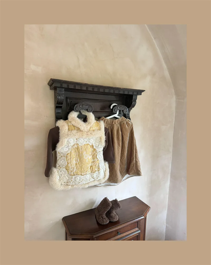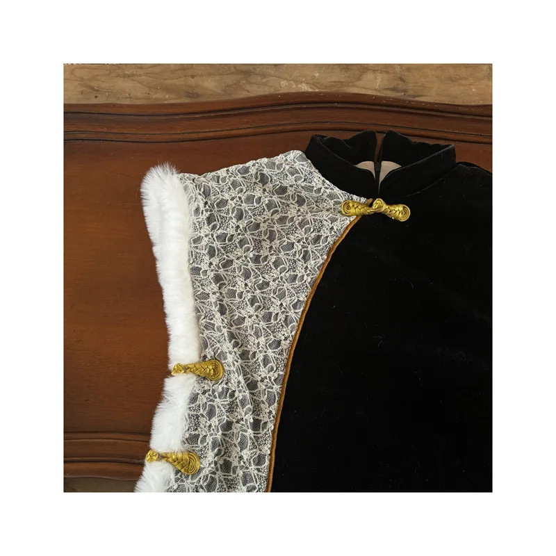 冷え込む季節にぴったりのキッズベストが新登場しました。ファーフリースとパッチワークが特徴の、レースとチャイナドレスを組み合わせた一着。赤ちゃんの女の子が可愛らしく温かく過ごせるデザインです。寒さからしっかりと守りながら、おしゃれも楽しめるベストです。